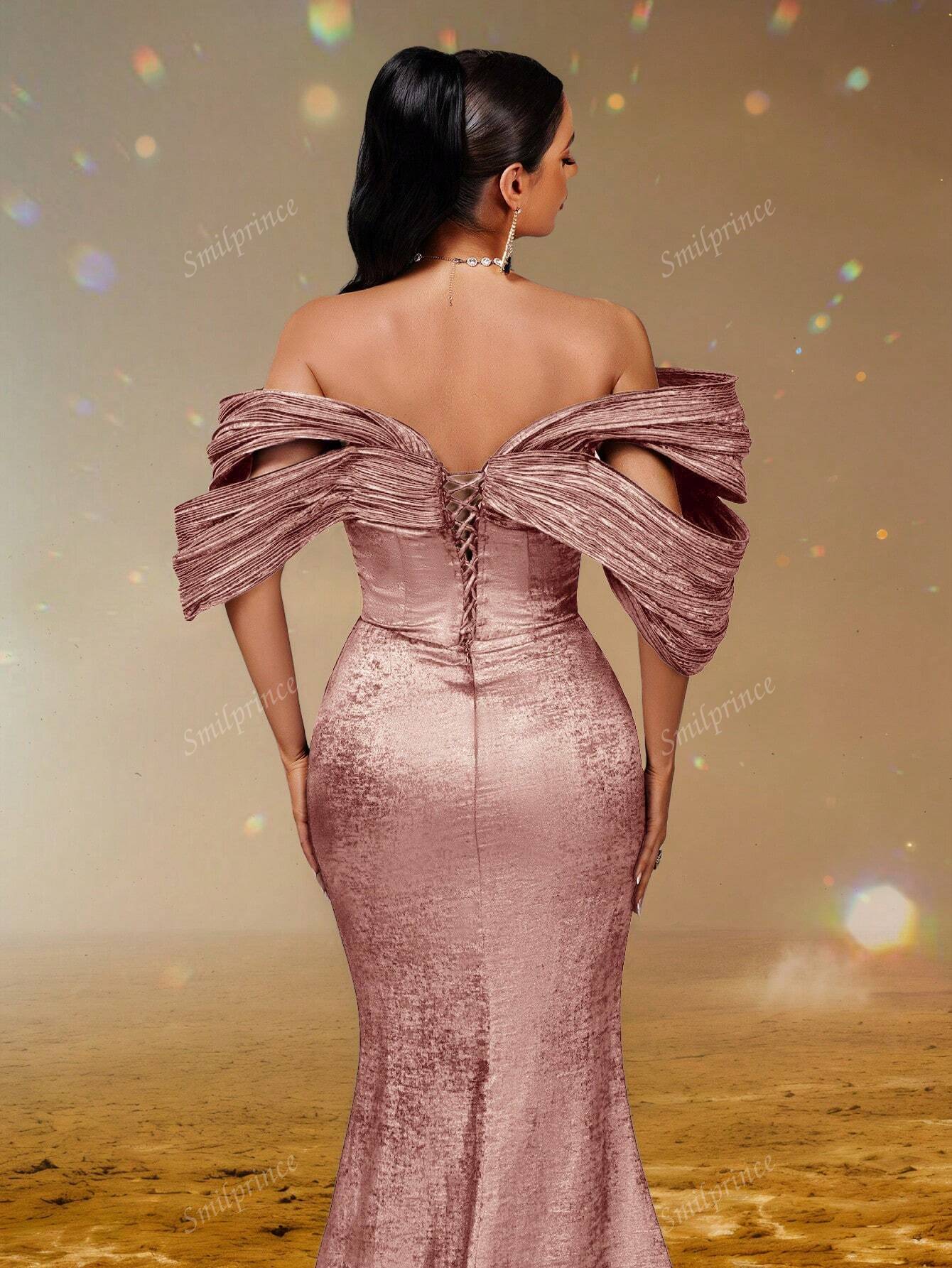 فستان حورية البحر الوردي الرائع من سميلبرنس، مكشوف الكتفين، بصدرية مكشكشة وفتحة عالية، مناسب للسهرة الرسمية