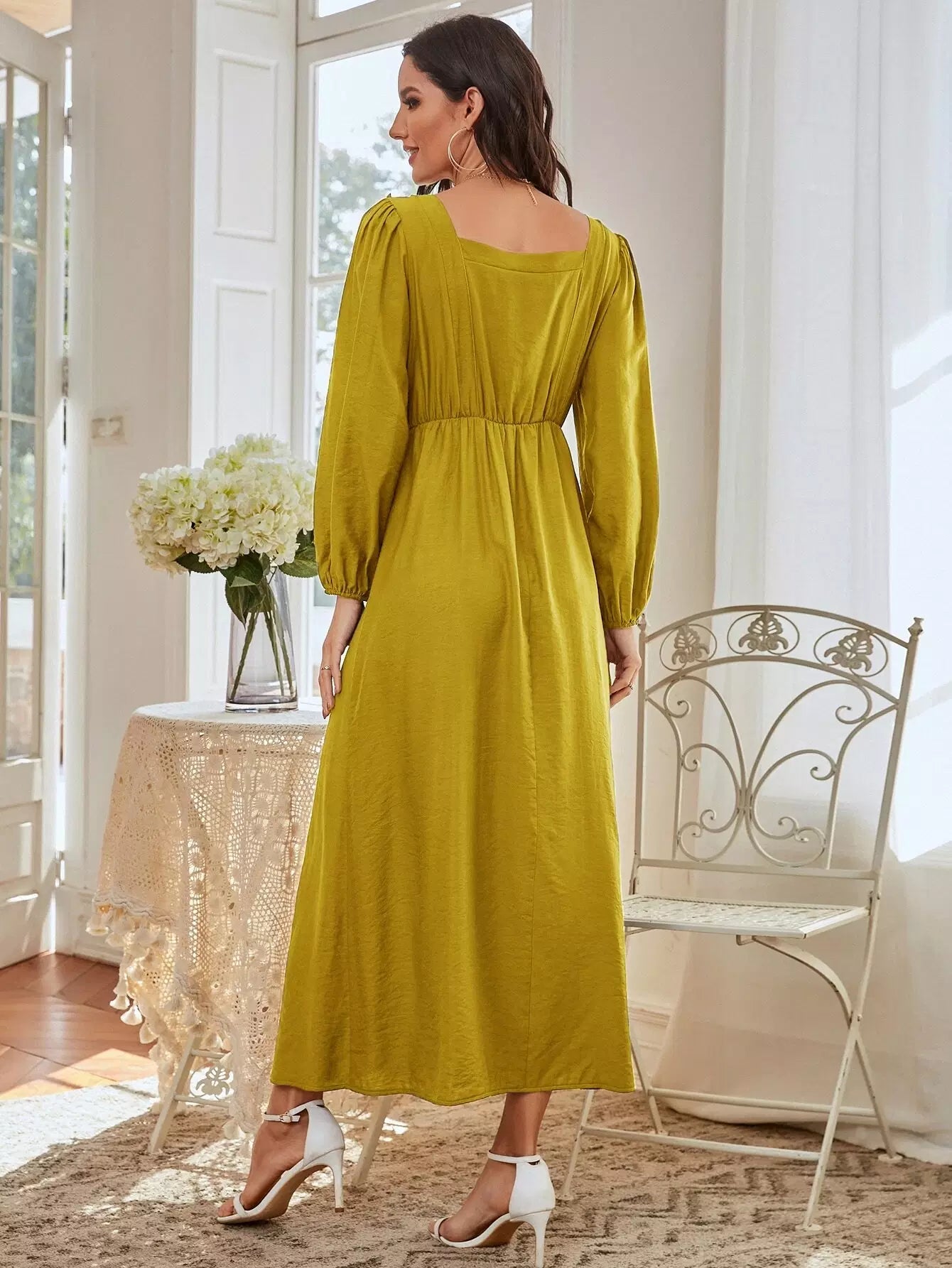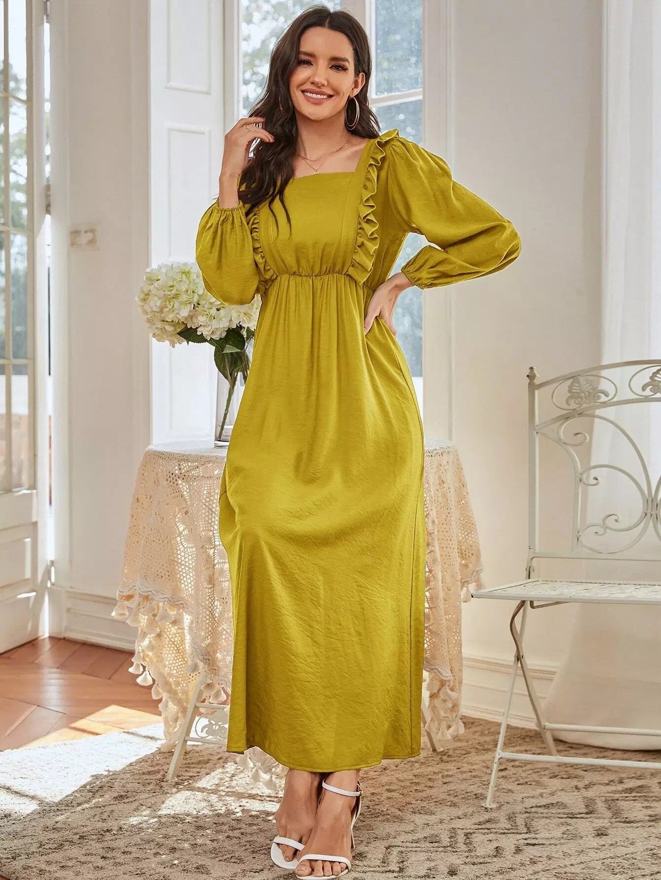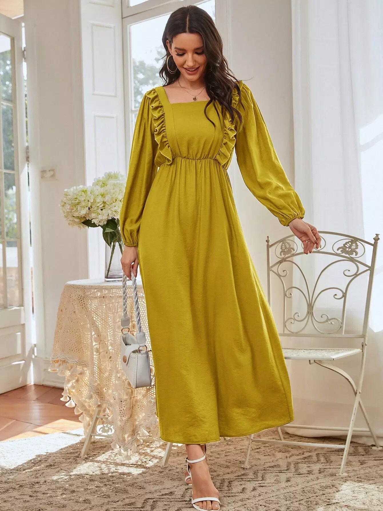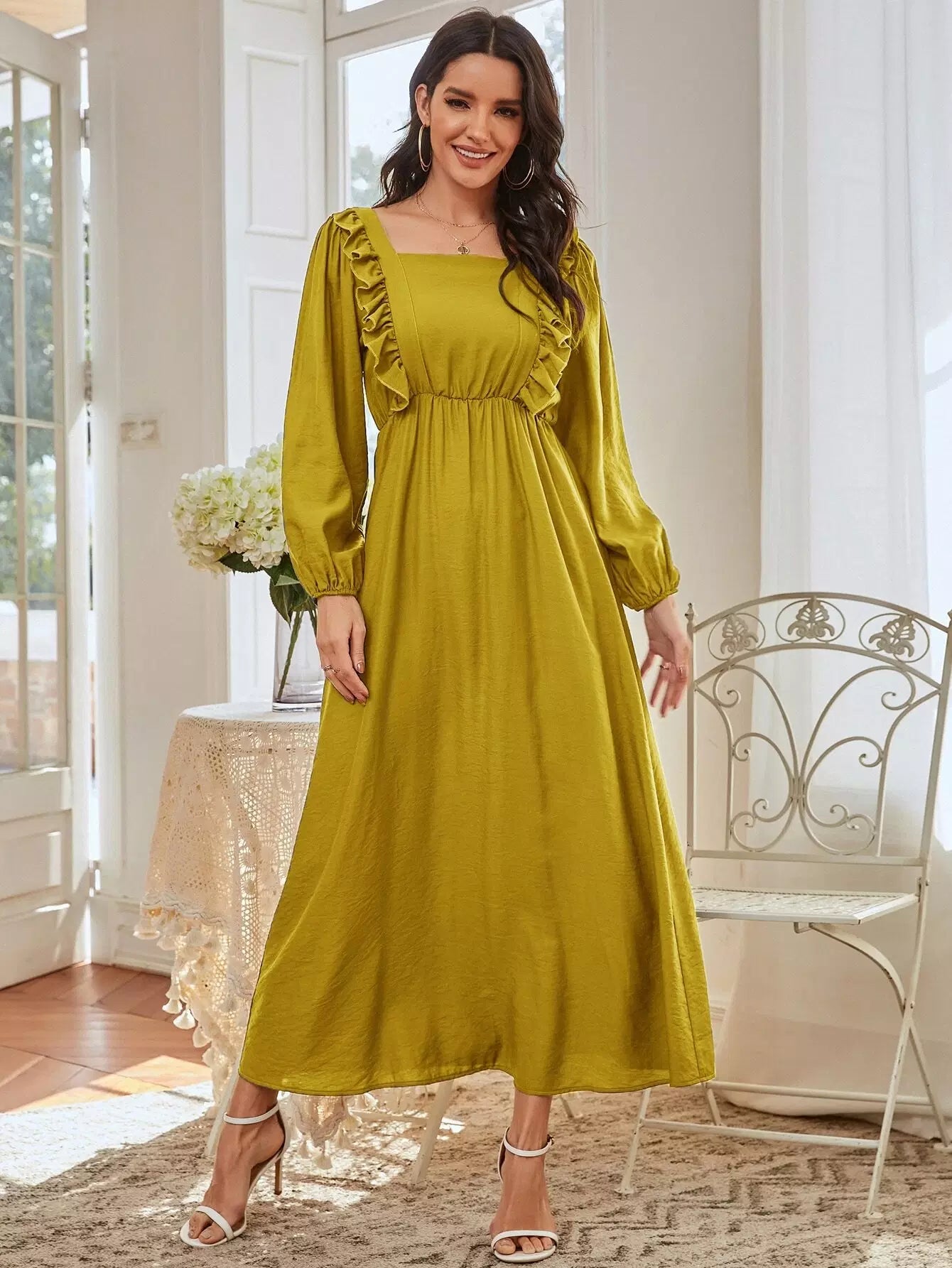 فستان برقبة مربعة بحواف مكشكشة على شكل حرف A