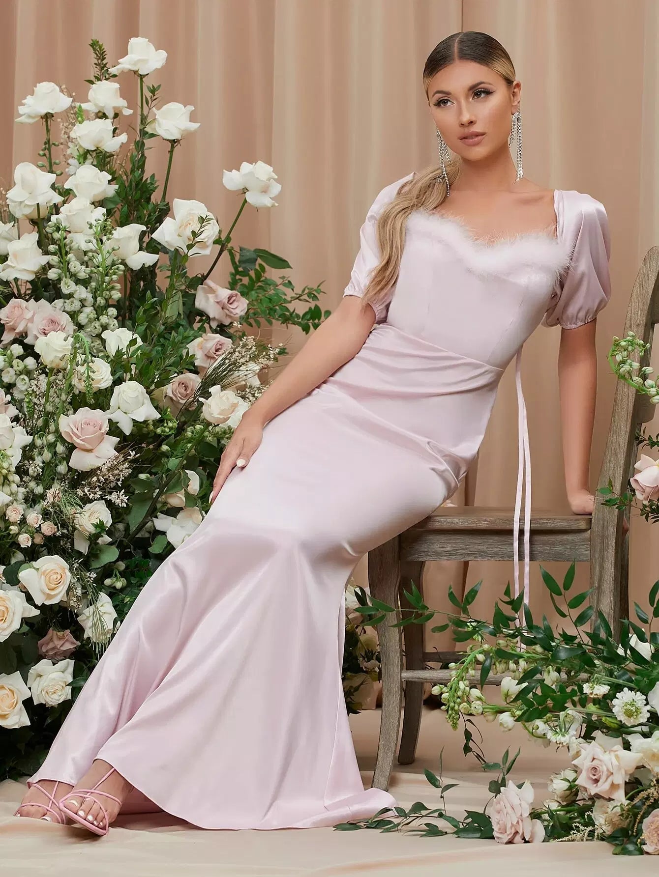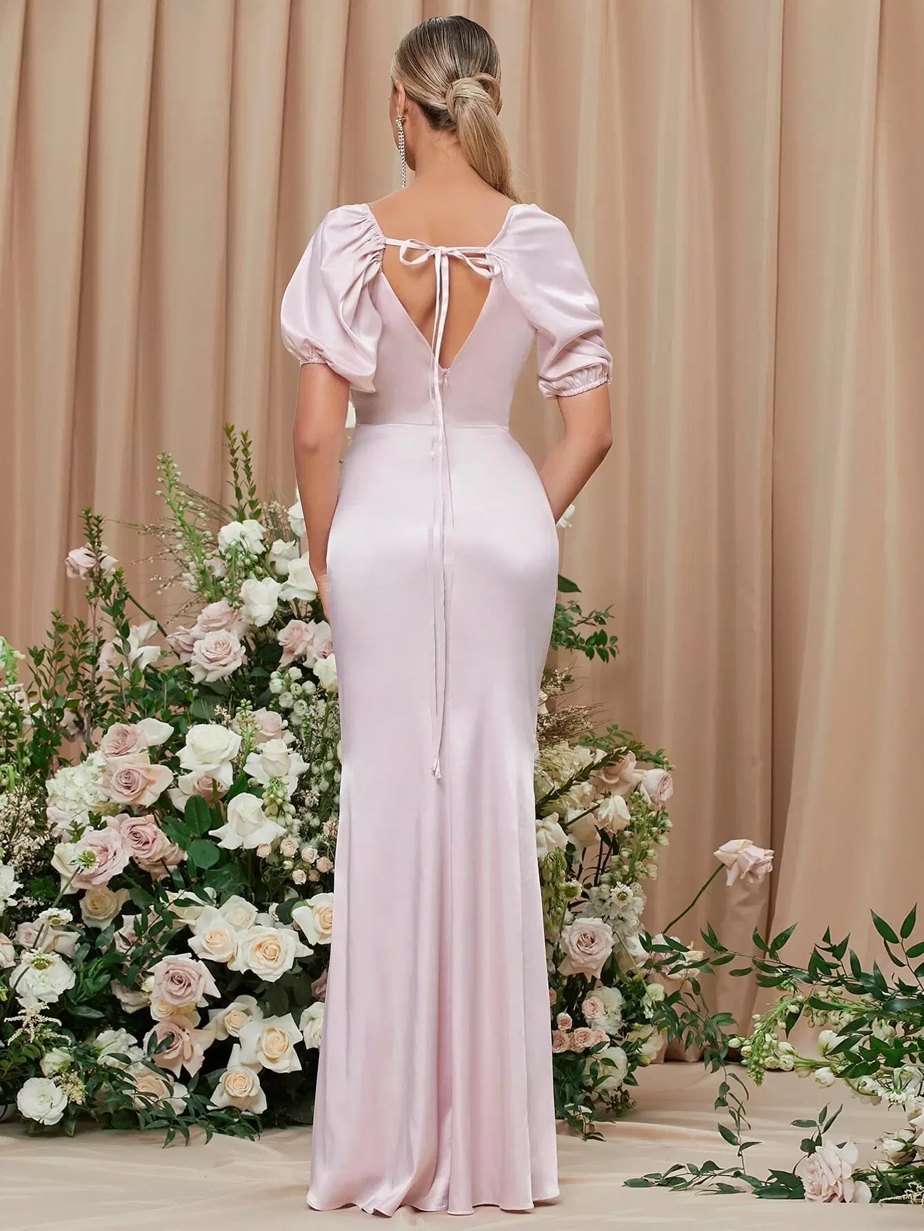 فستان من الساتان بأكمام منفوشة من الساتان بربطة عنق على الظهر