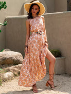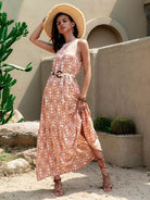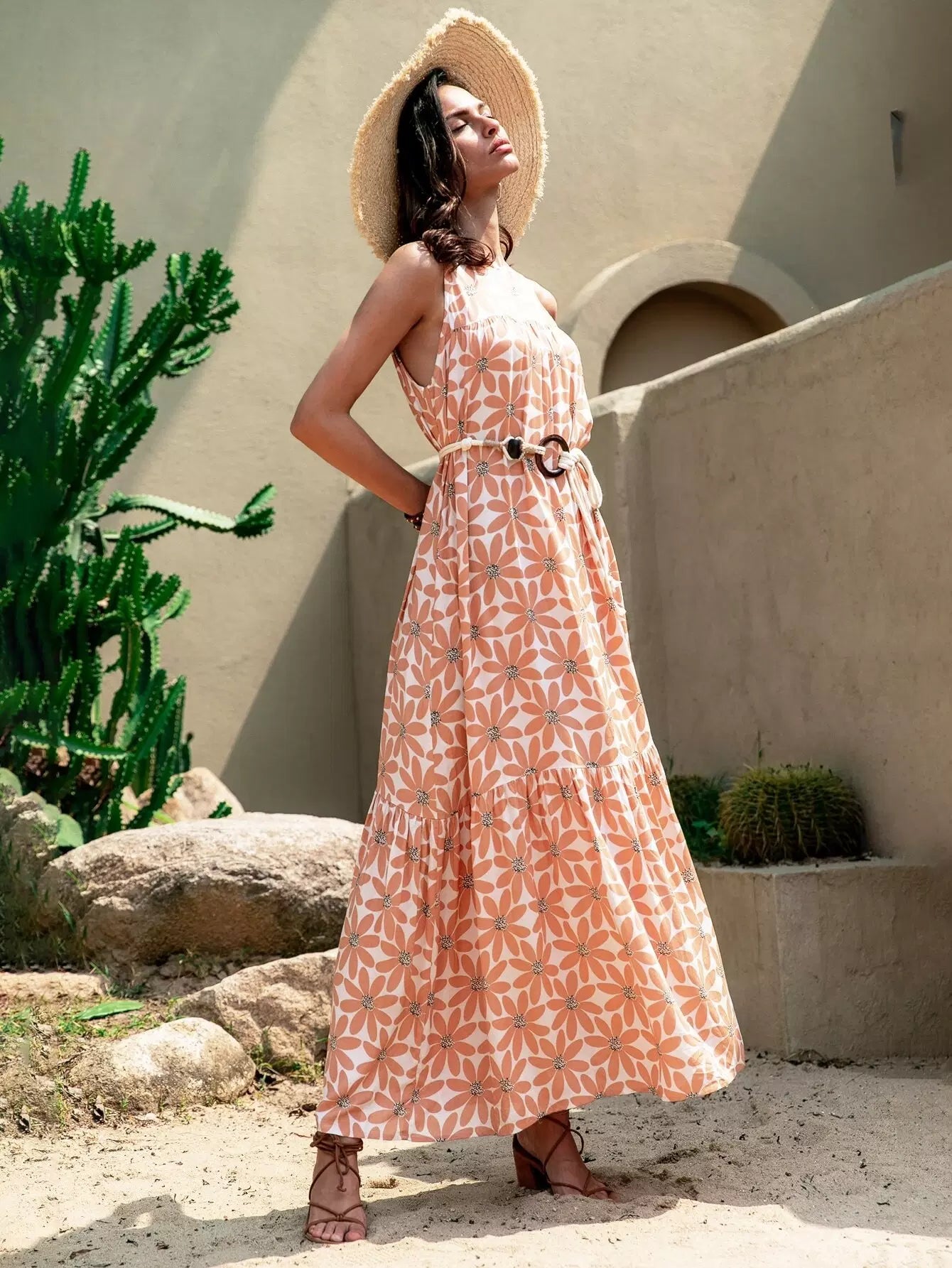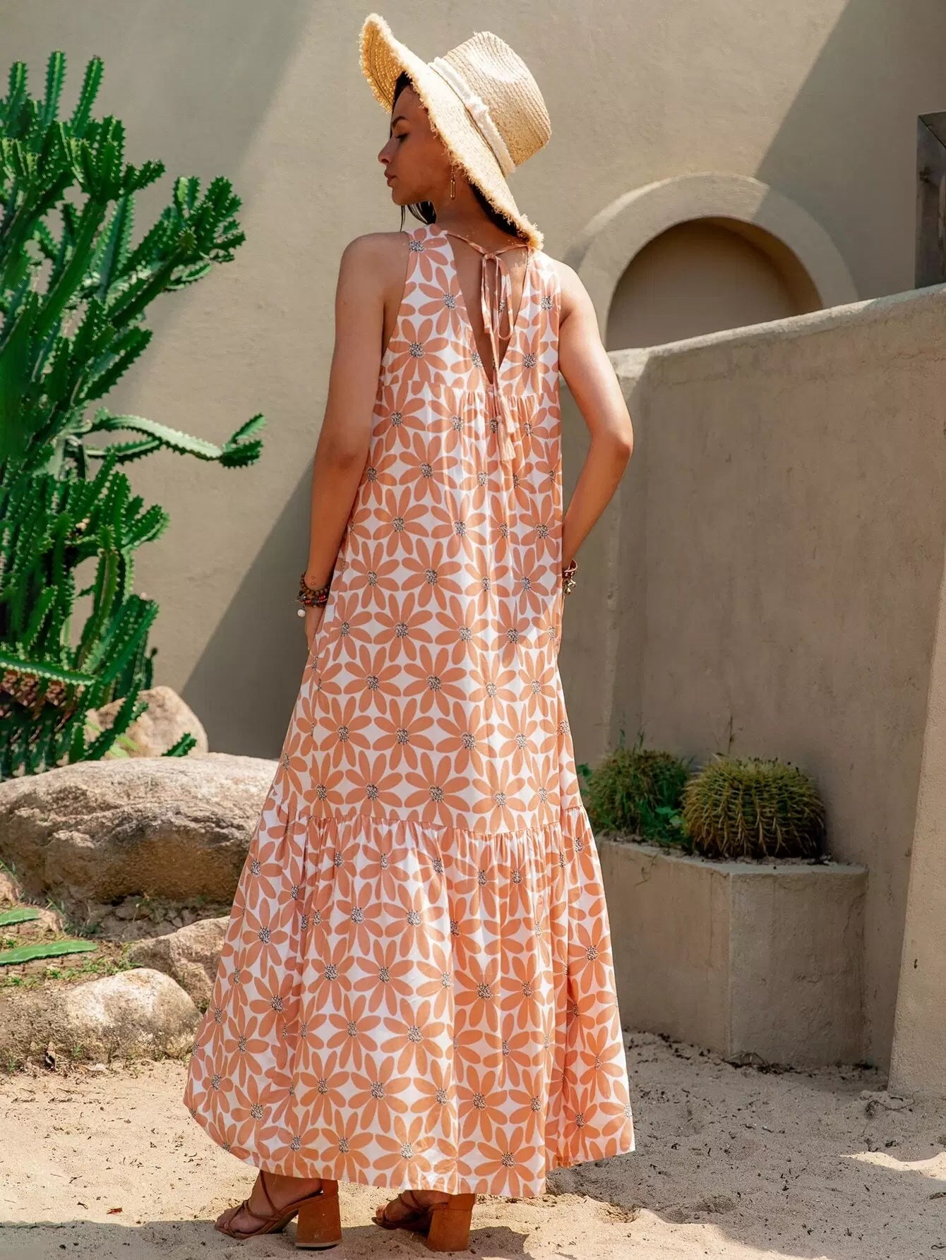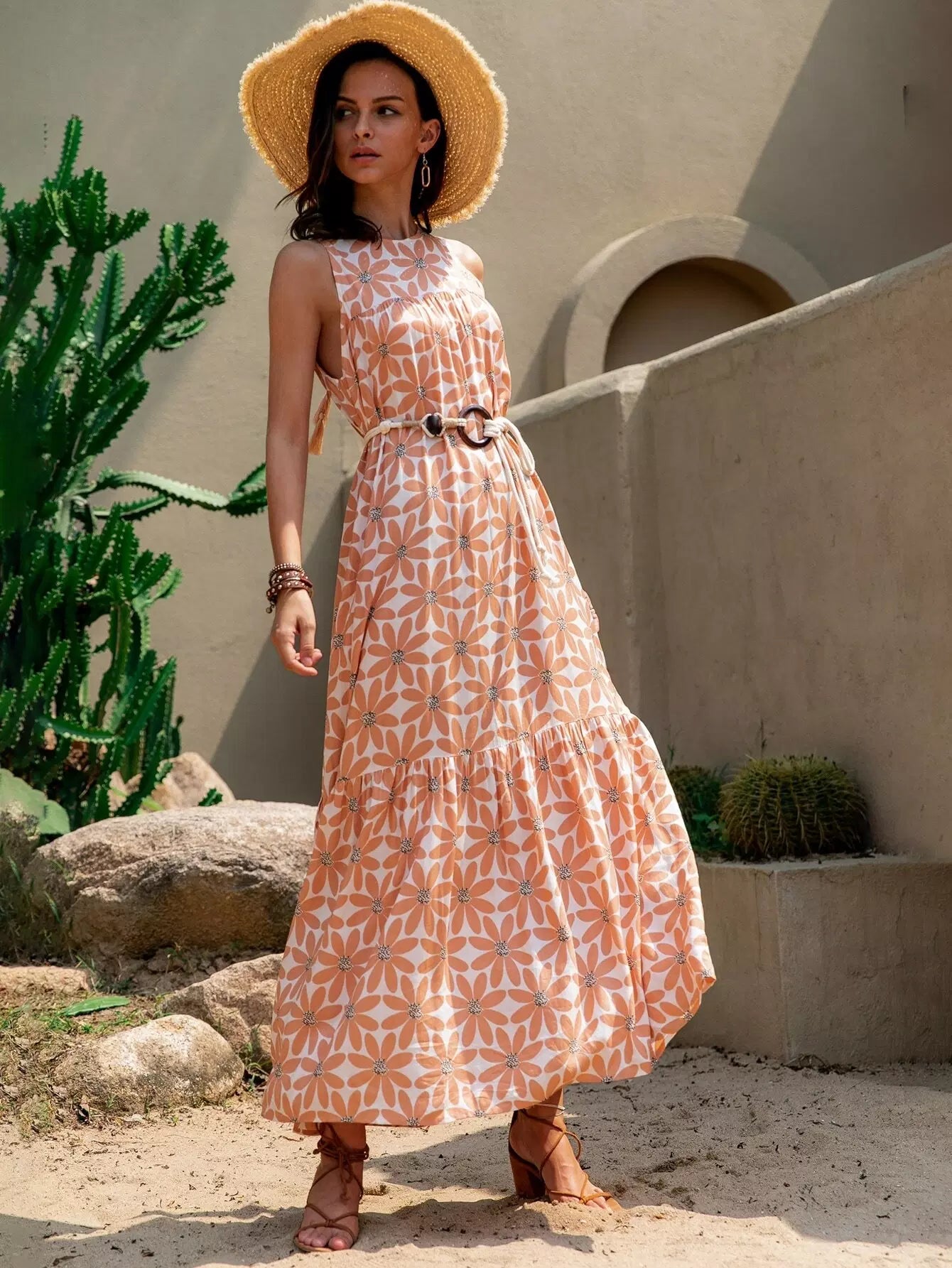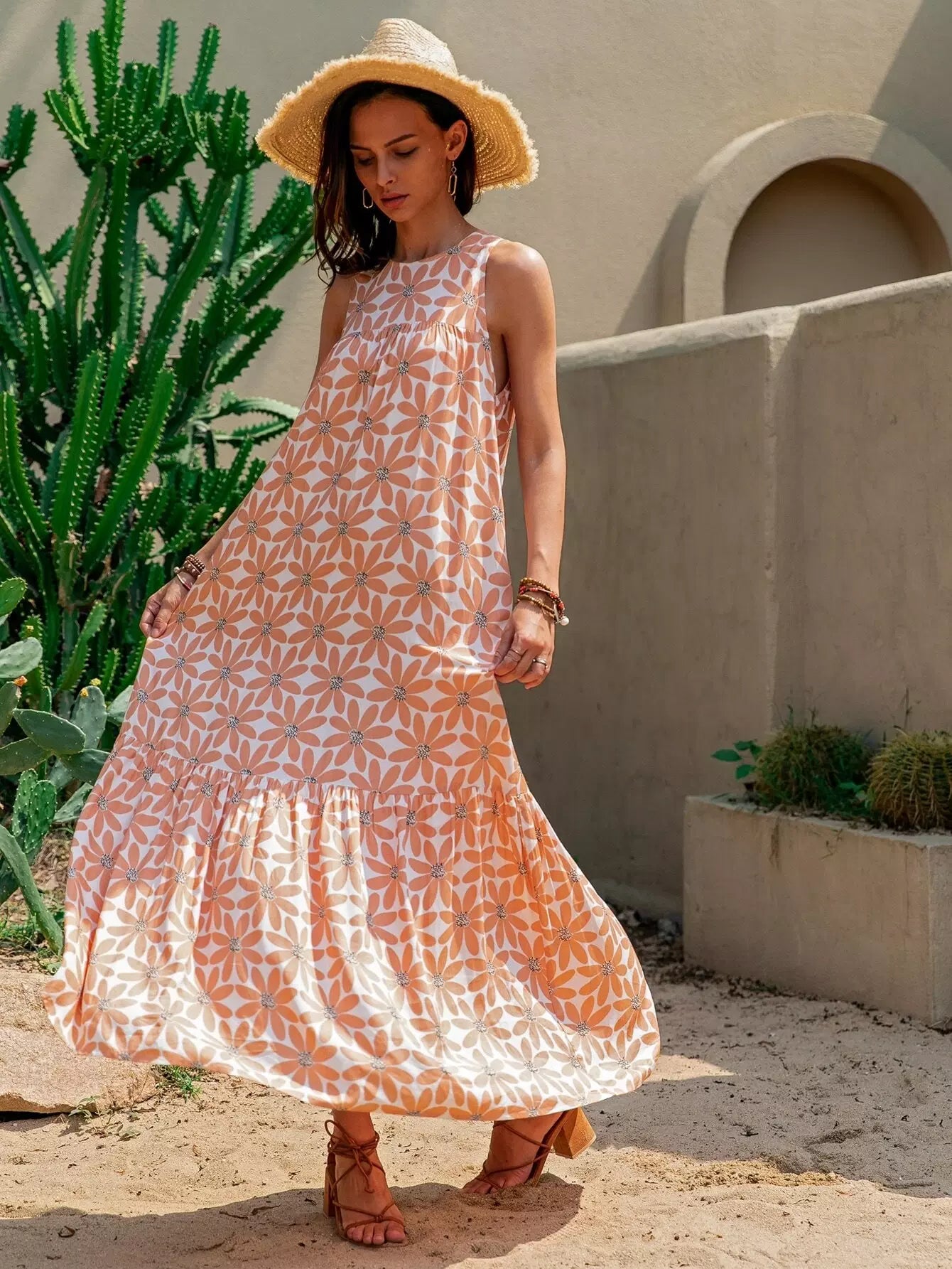 فستان زهري كامل مع حافة مكشكشة ورباط خلفي بدون حزام
