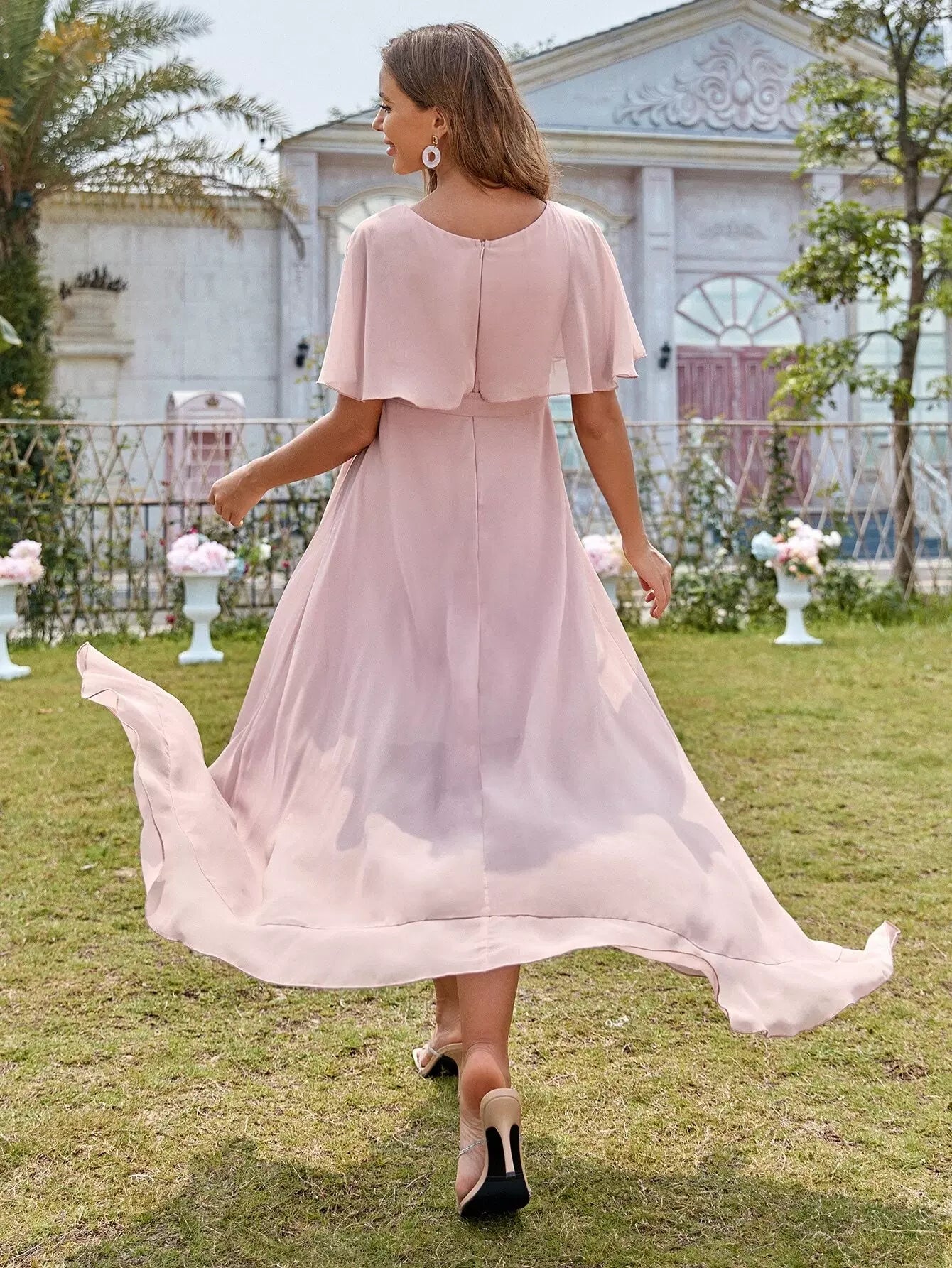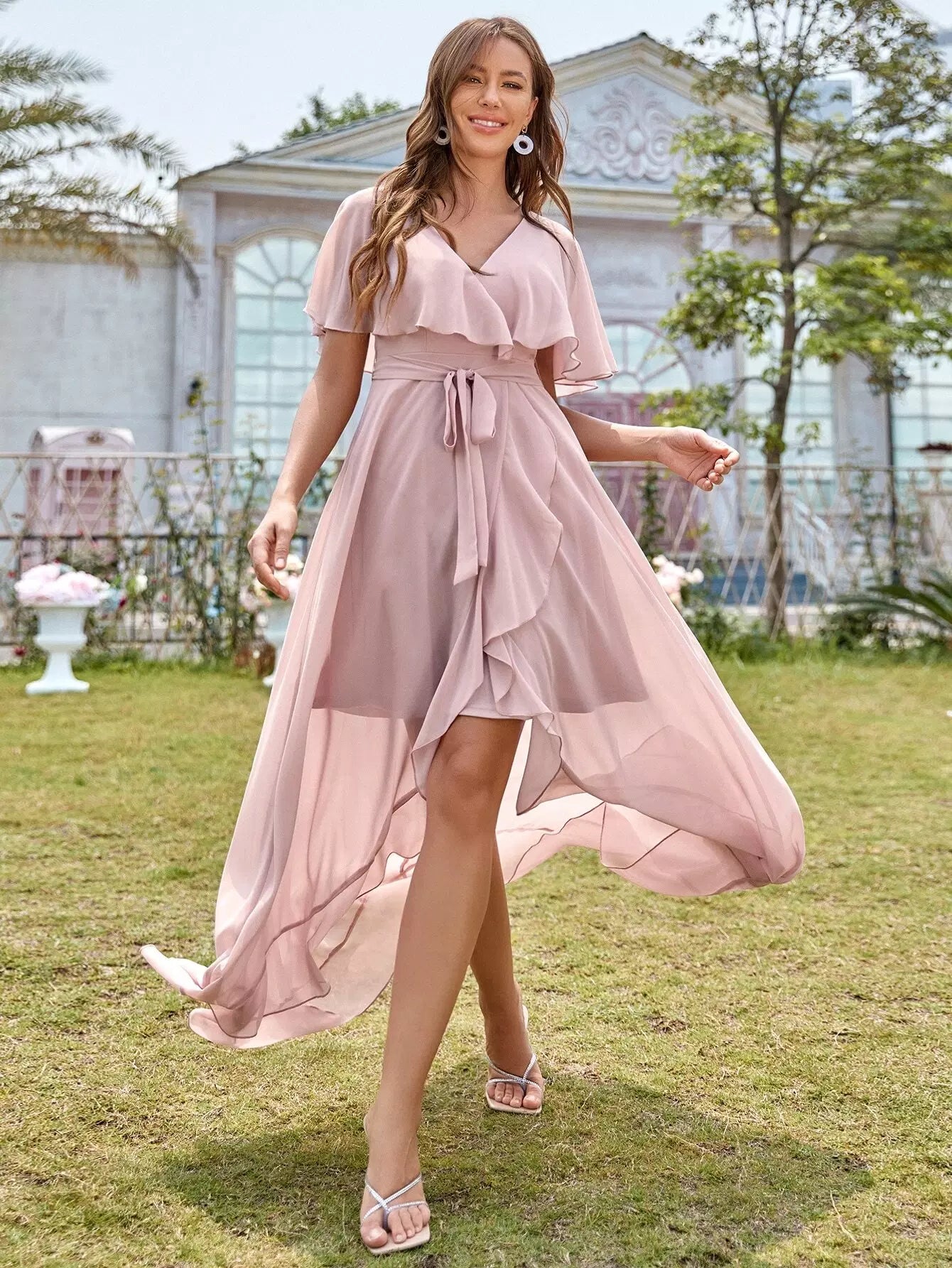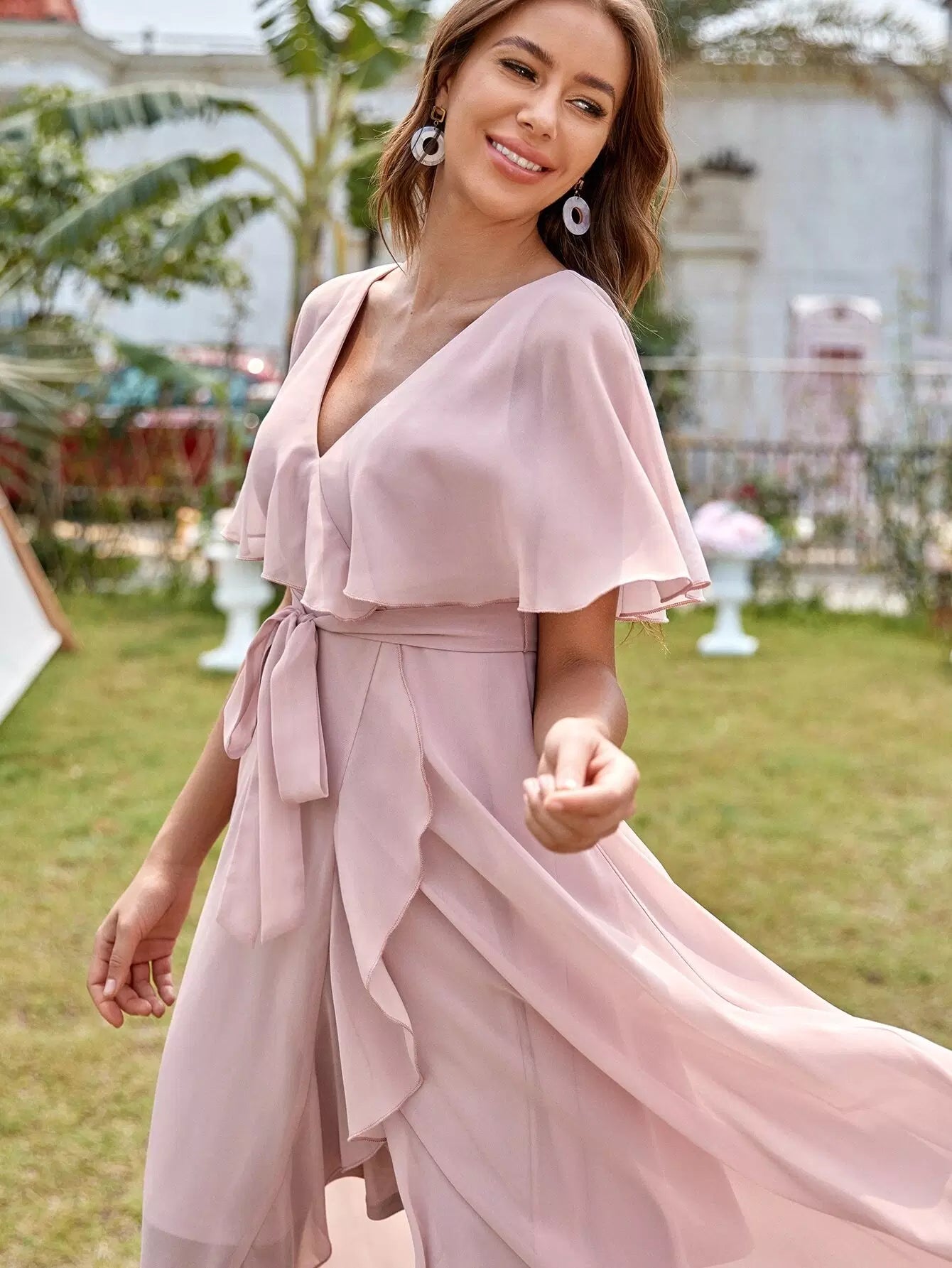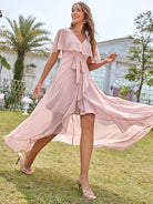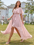 فستان شيفون بحافة كشكش غير متماثلة بربطة عنق أمامية