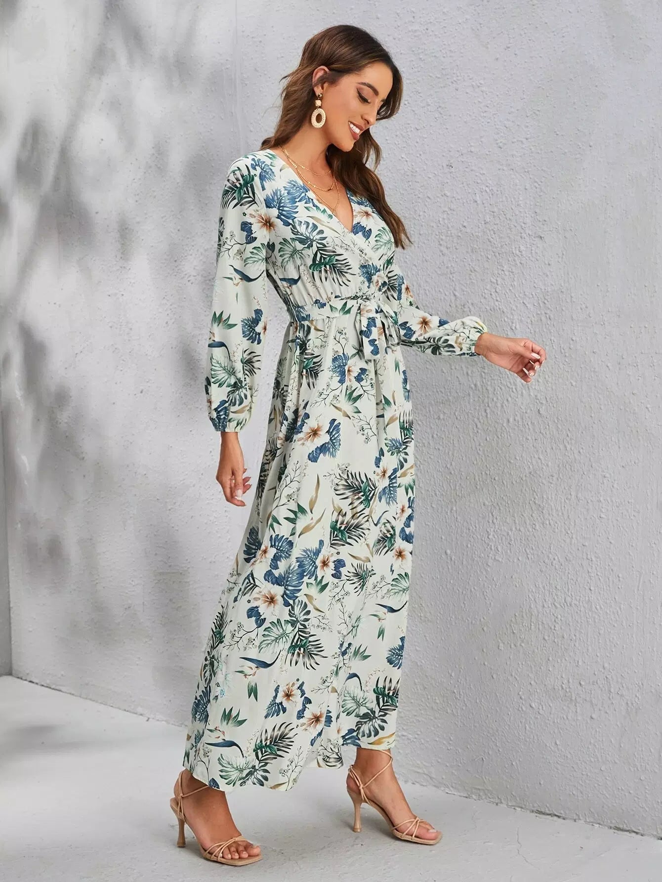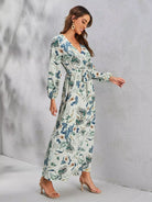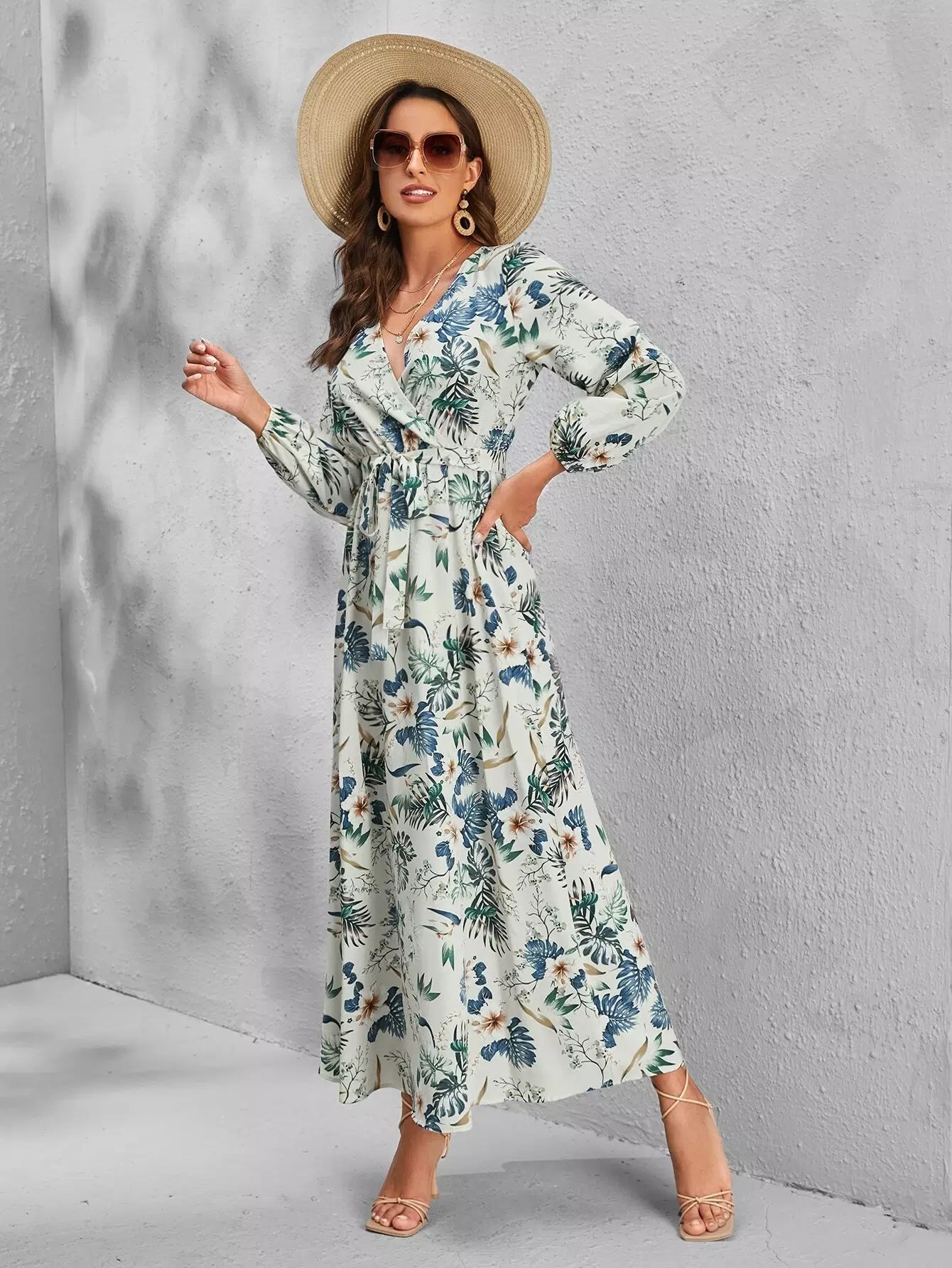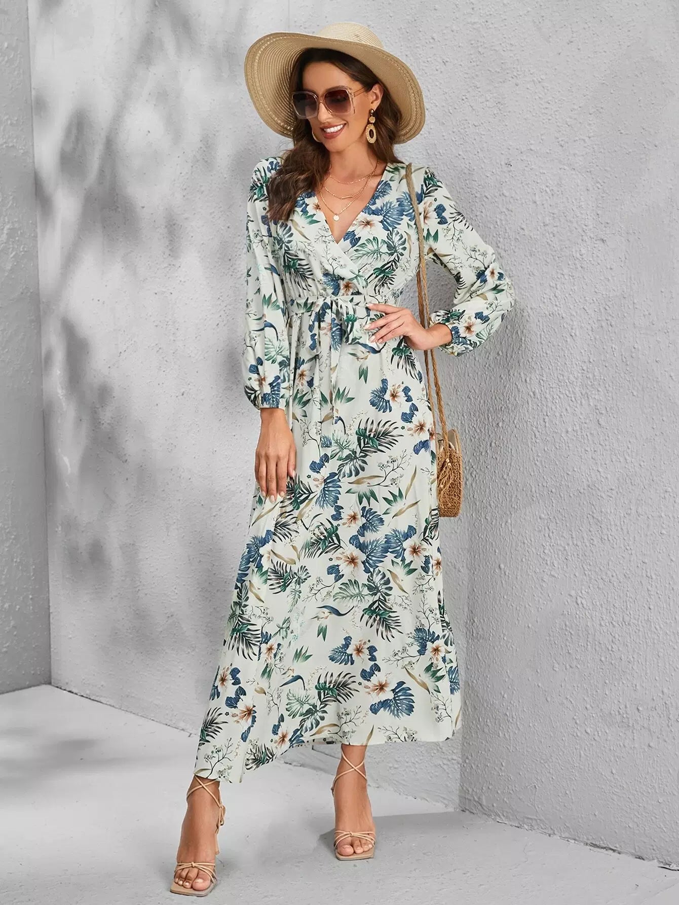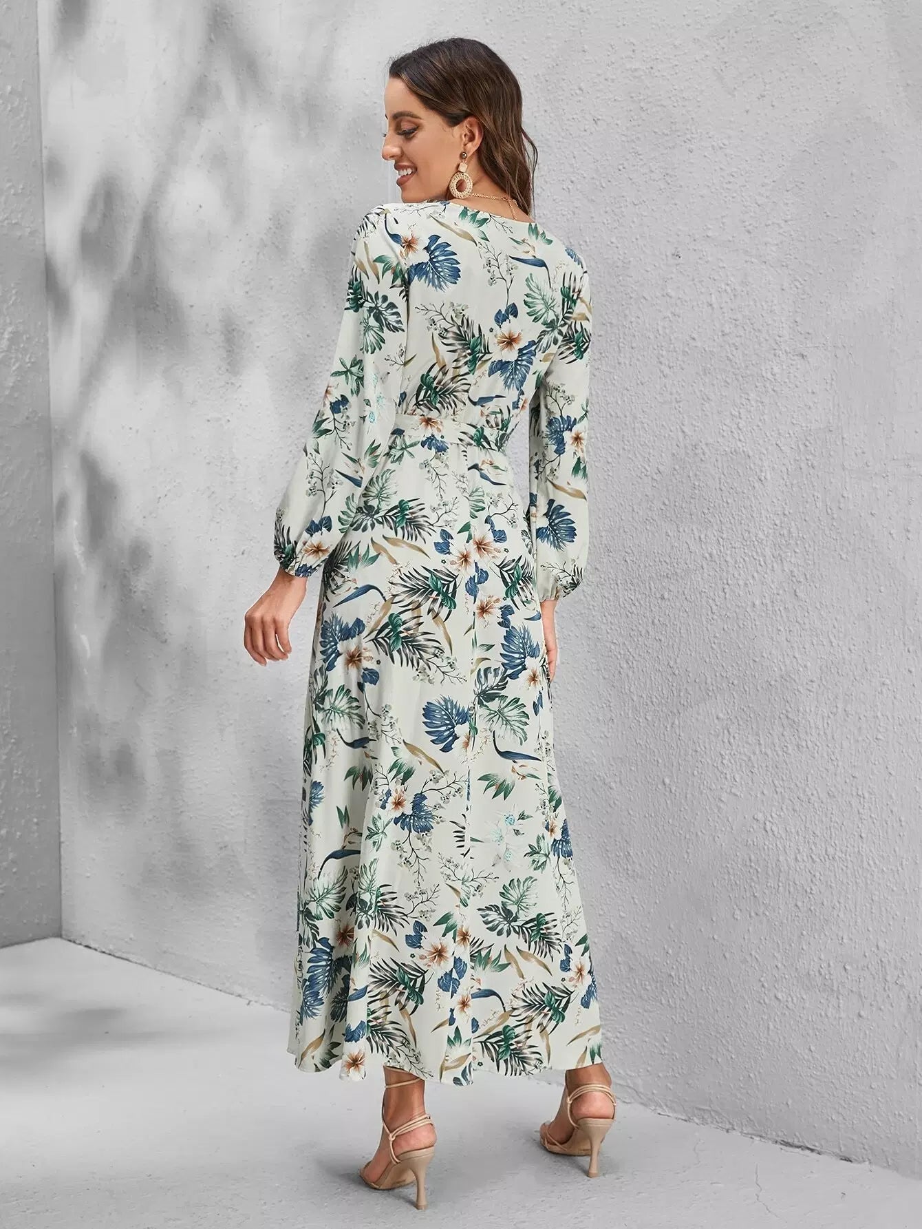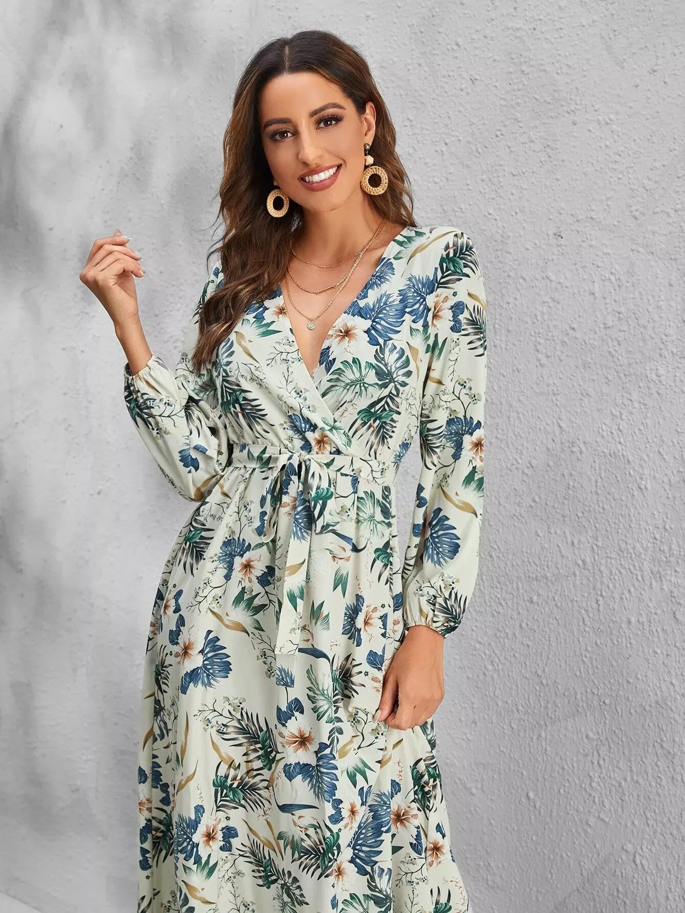 فستان بطبعات استوائية وياقة متداخلة وأكمام أسقف بدون حزام