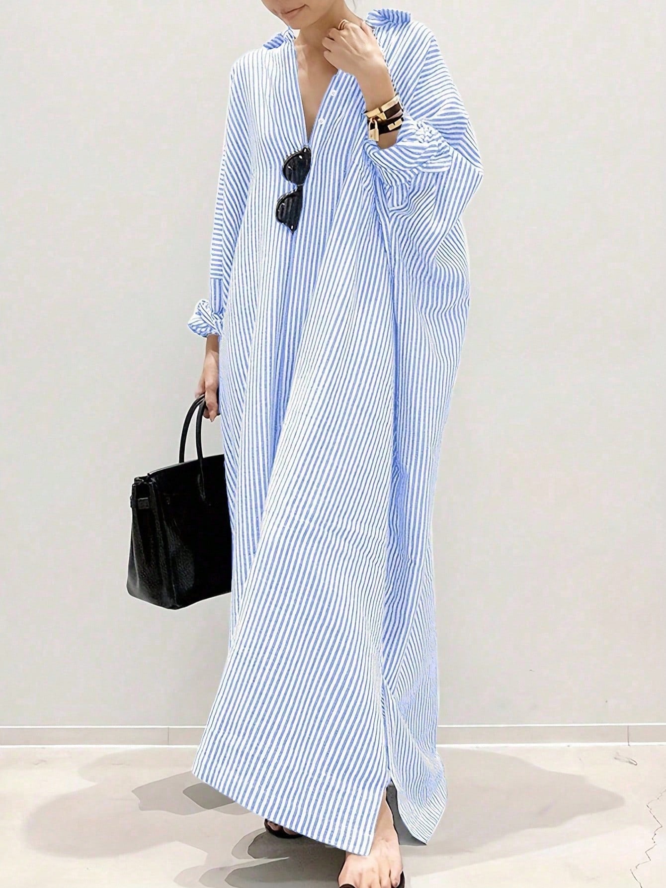 ملابس نسائية من Uhlyne لخريف هذا العام: فستان ماكسي فضفاض مخطط بأكتاف منسدلة، طقم ملابس نسائية
