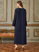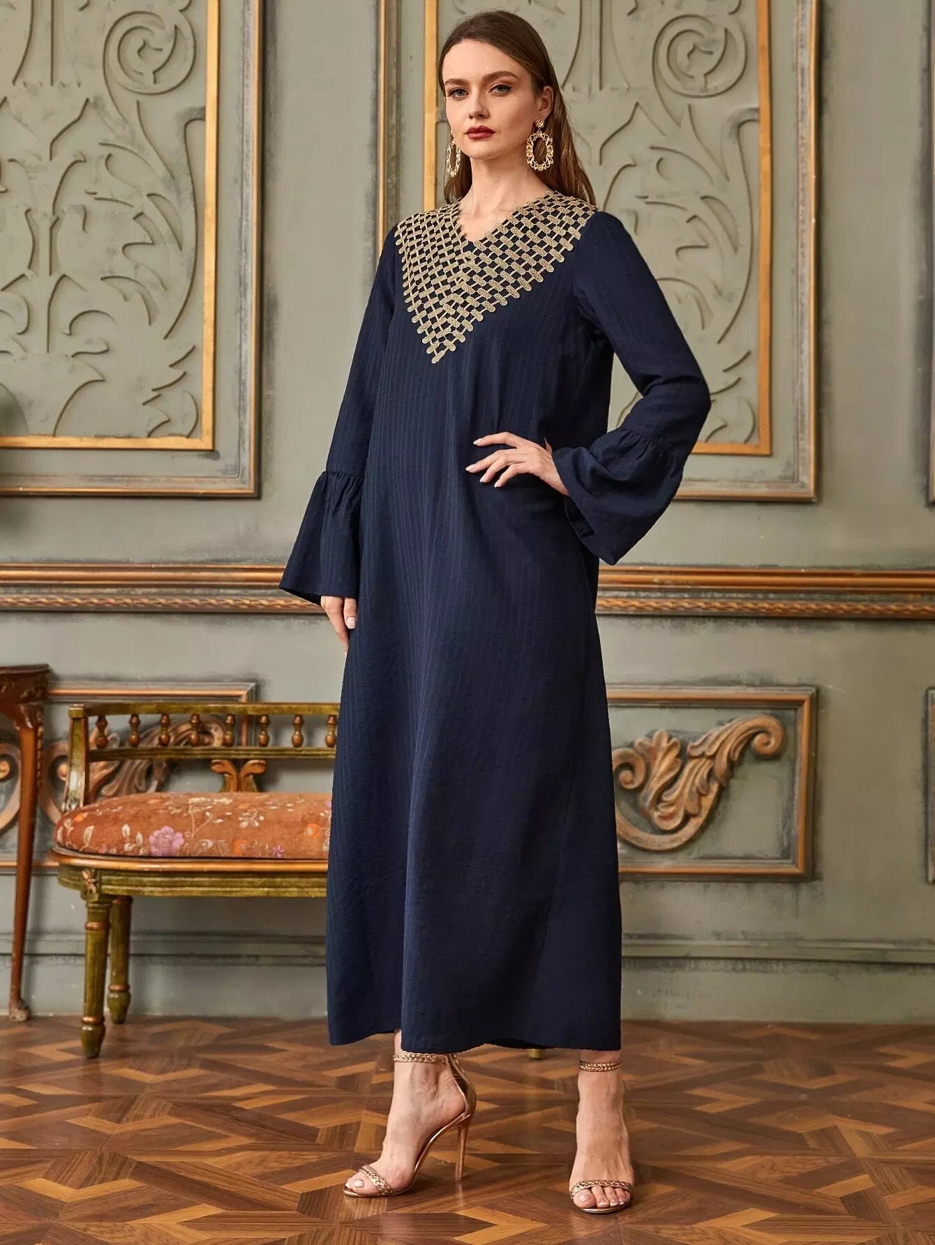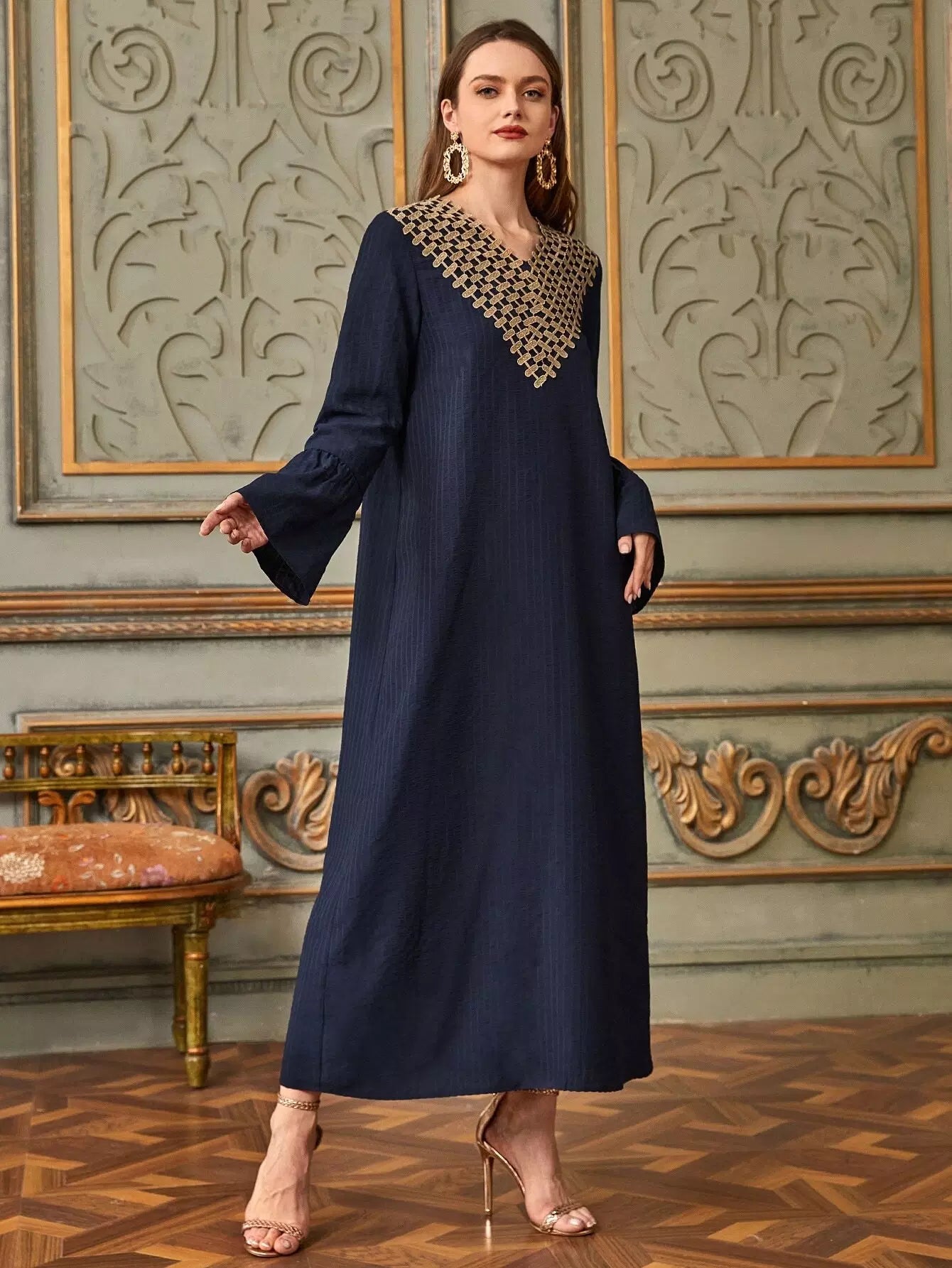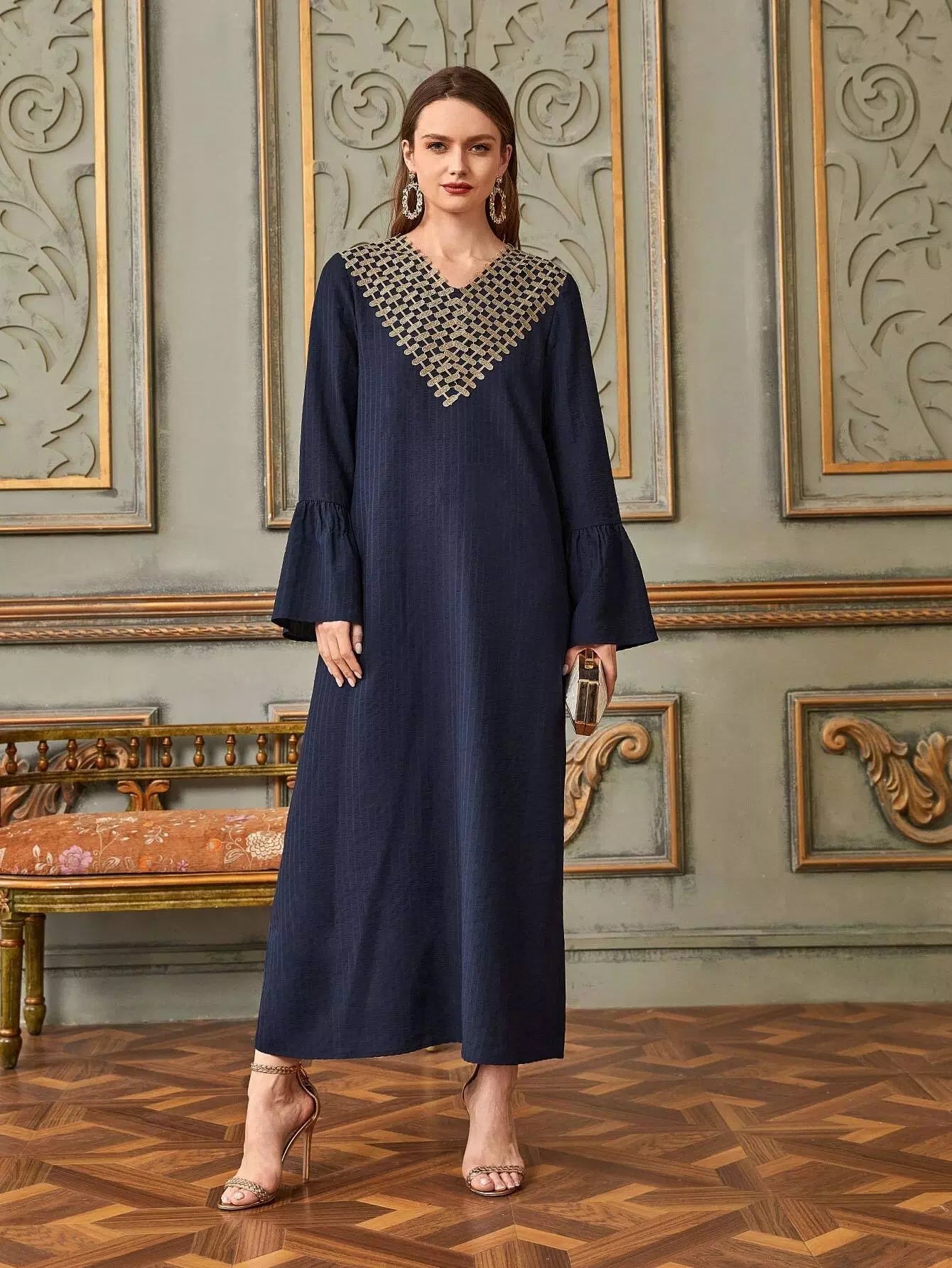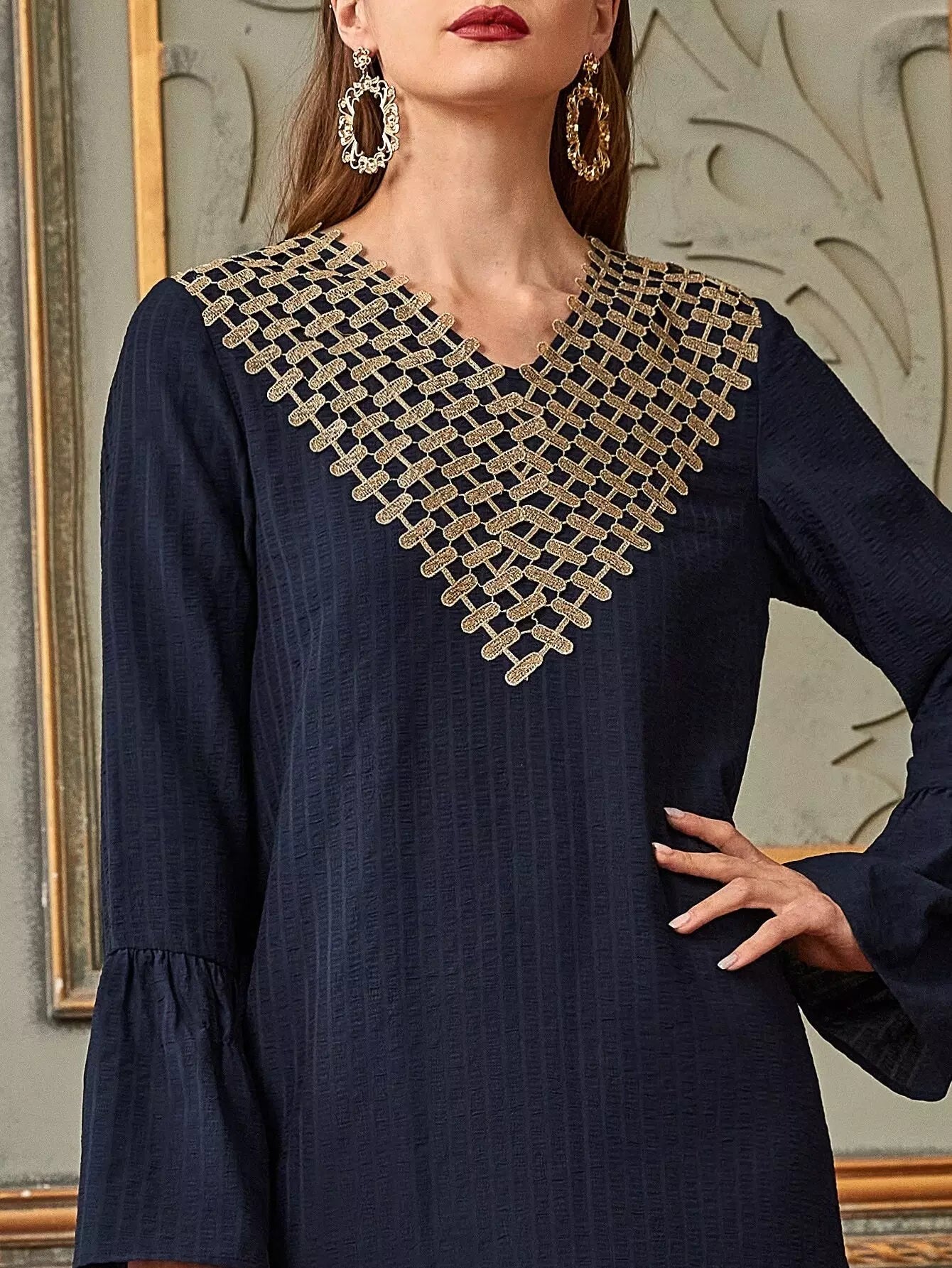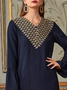 فستان تونيك بأكمام على شكل V بياقة على شكل V يزين على شكل حرف V