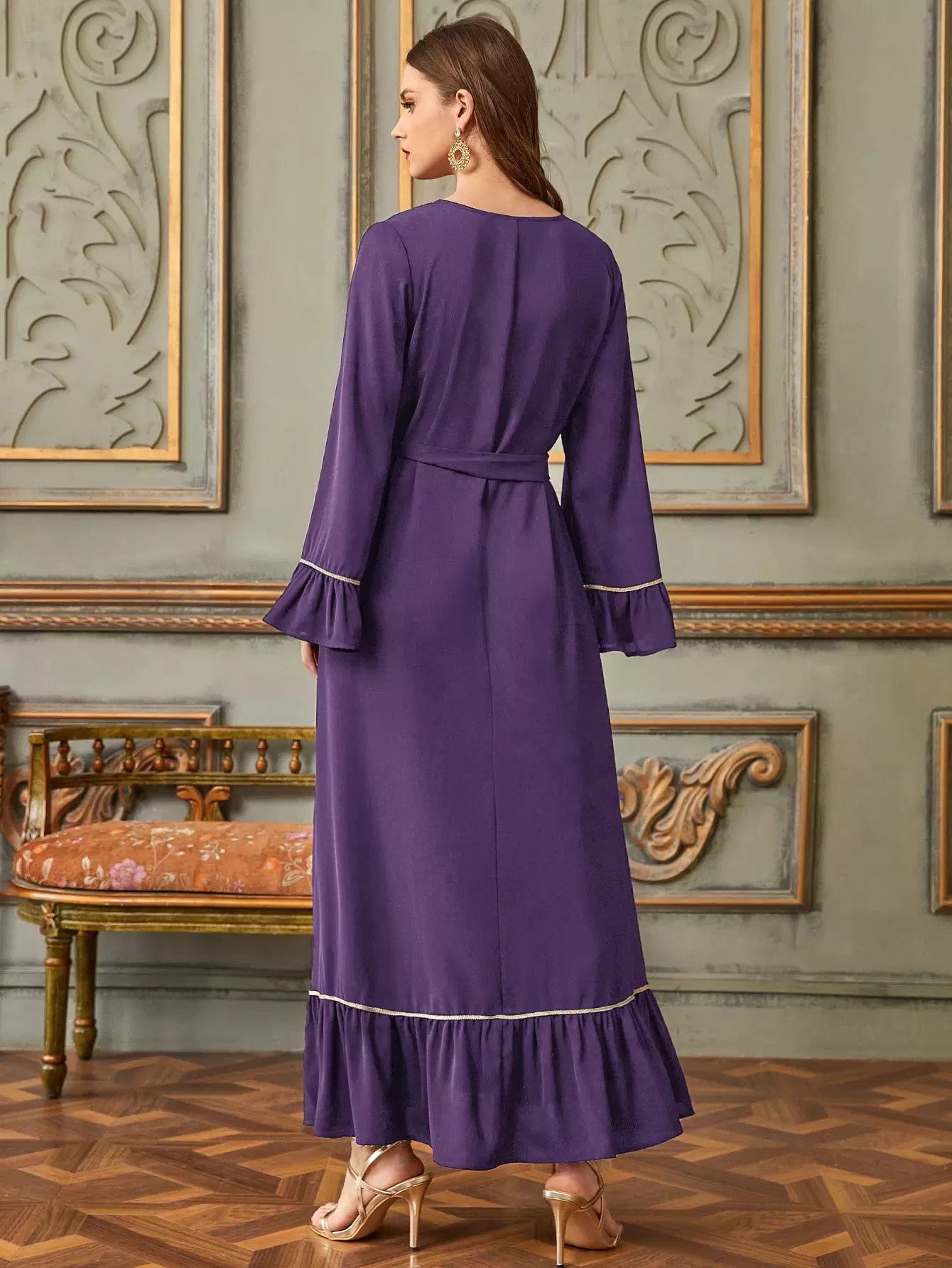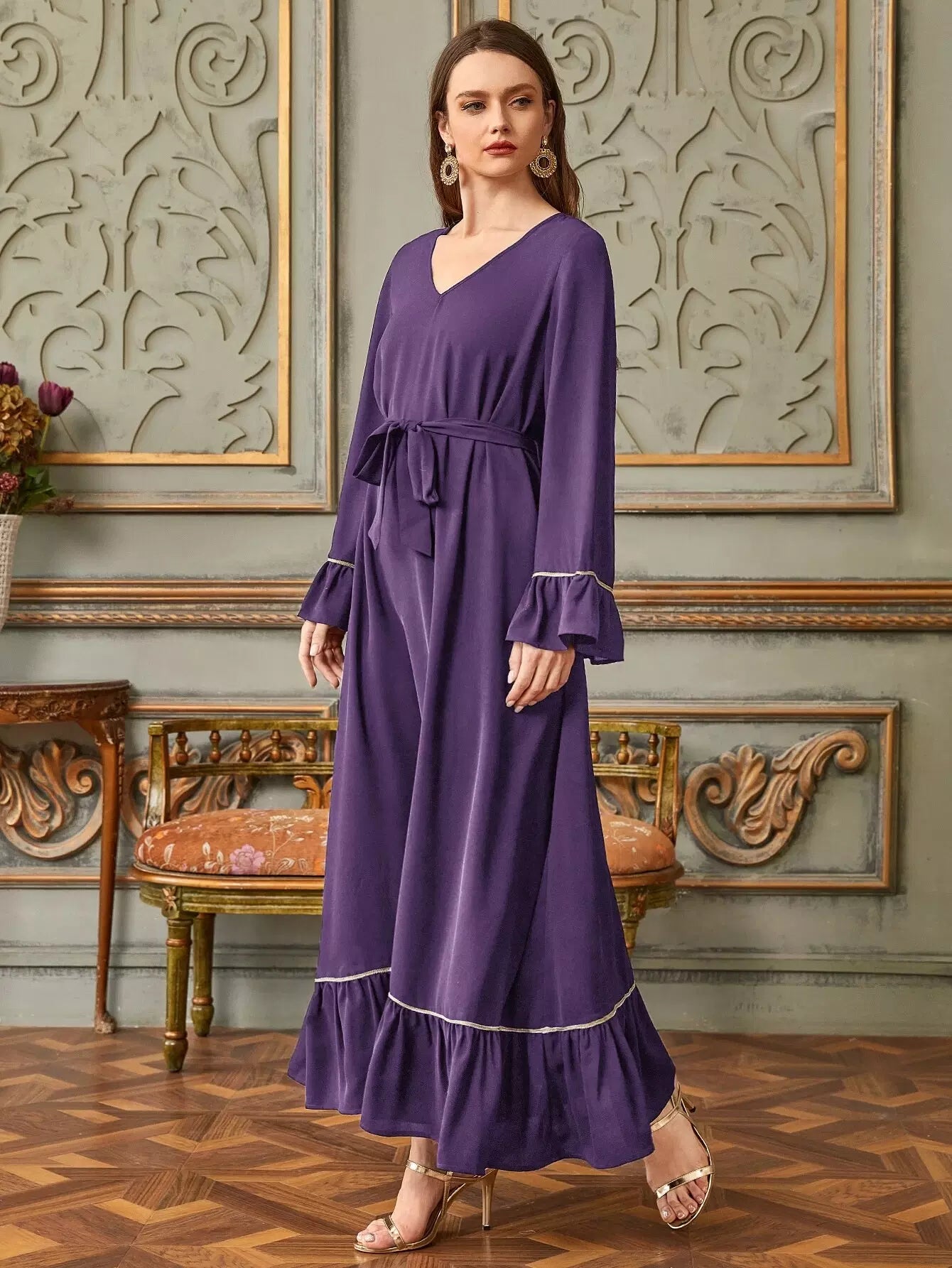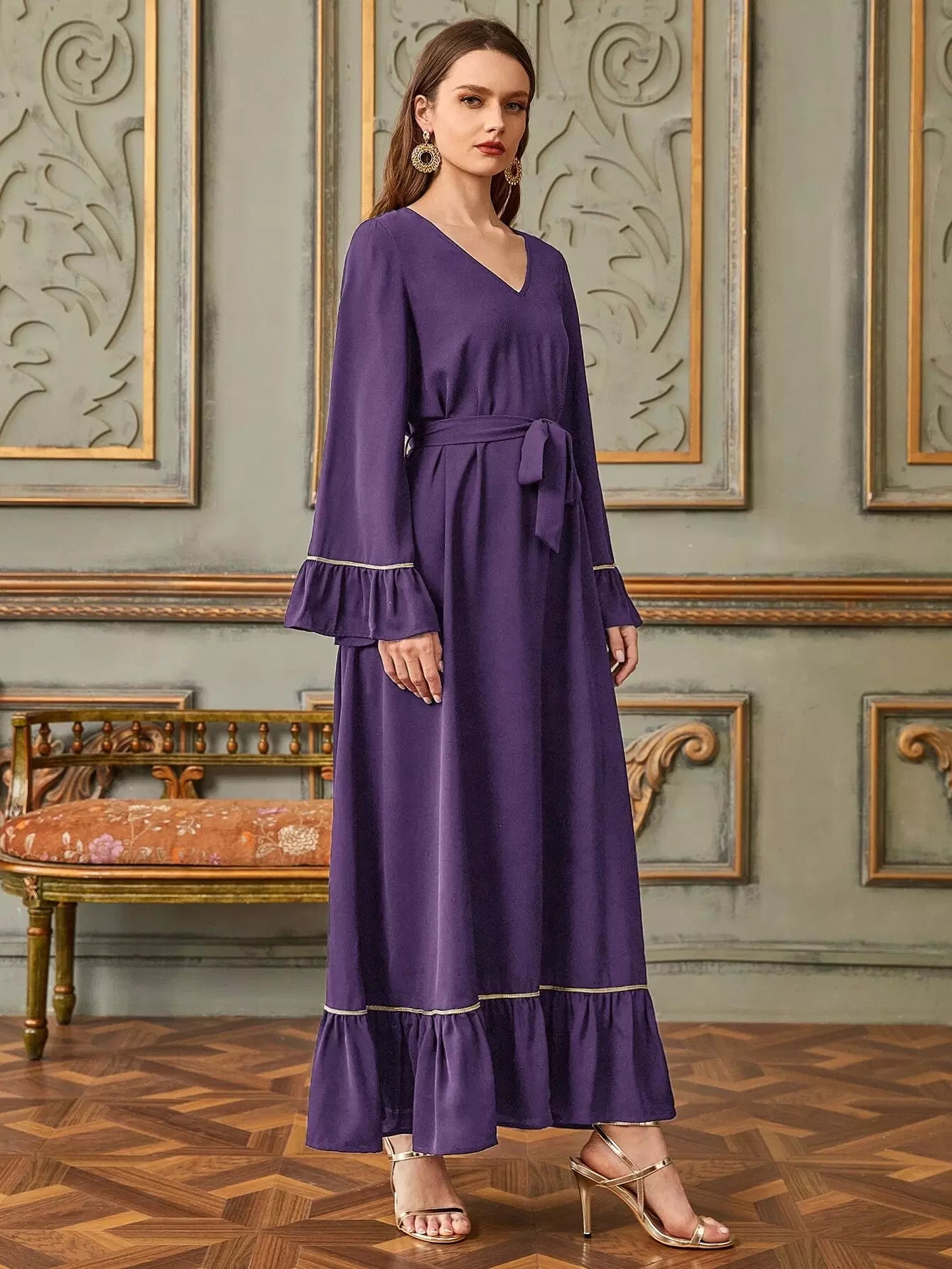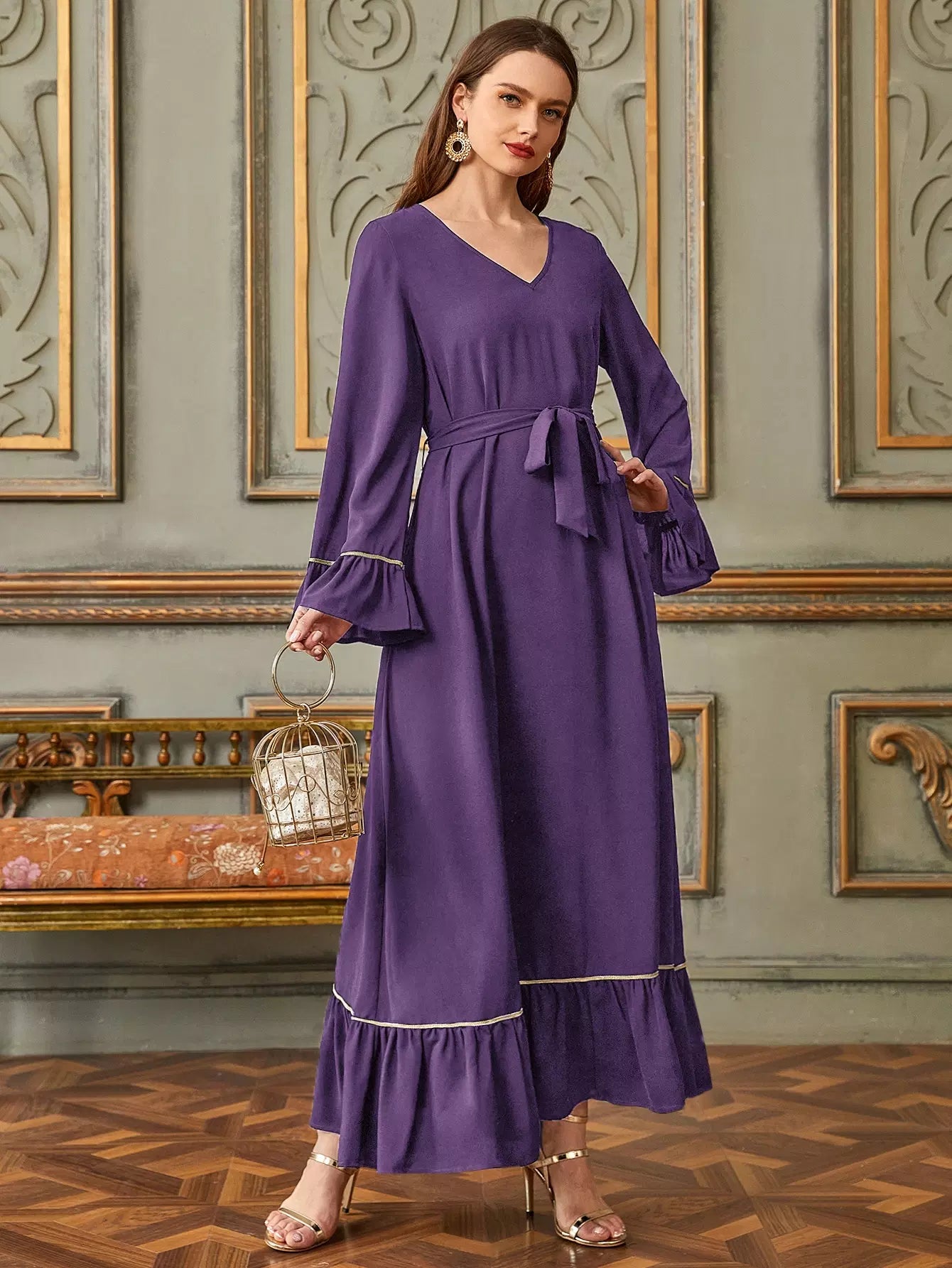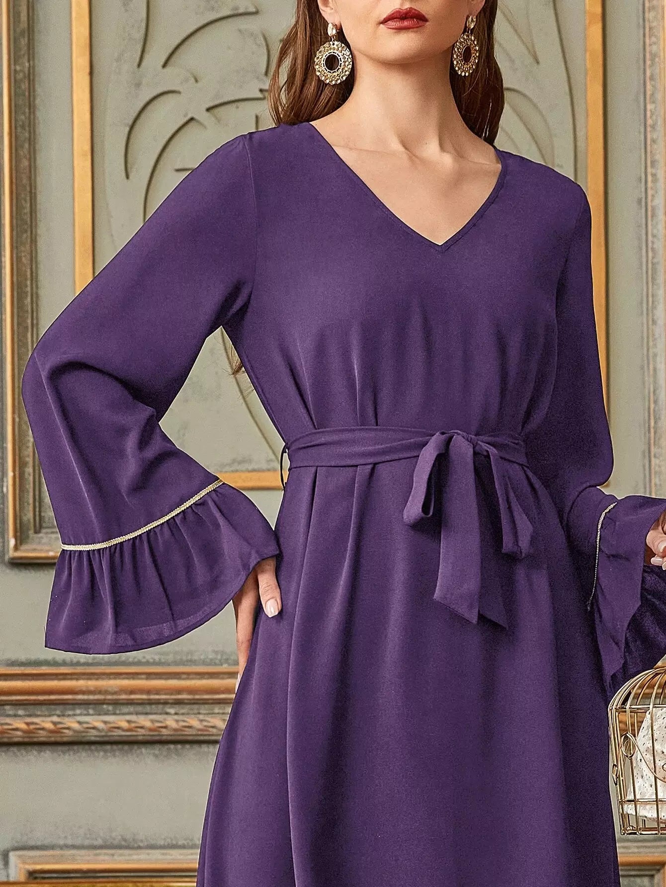 فستان بياقة على شكل V بياقة على شكل V وأكمام منفوشة بربطة عنق على شكل V