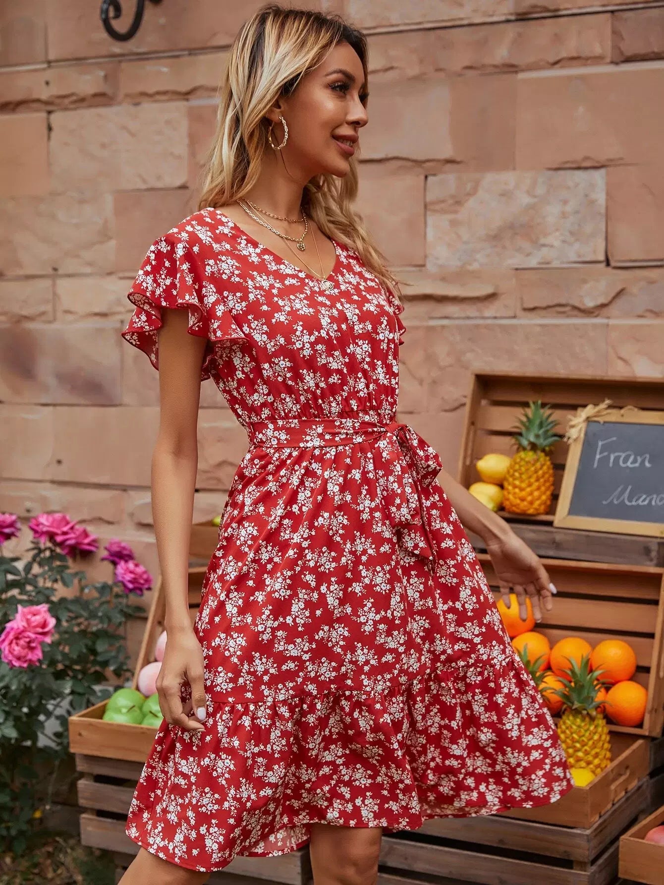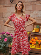 فستان على شكل حرف A بأكمام فراشة وطبعات زهور بالكامل بدون حزام