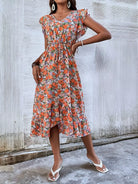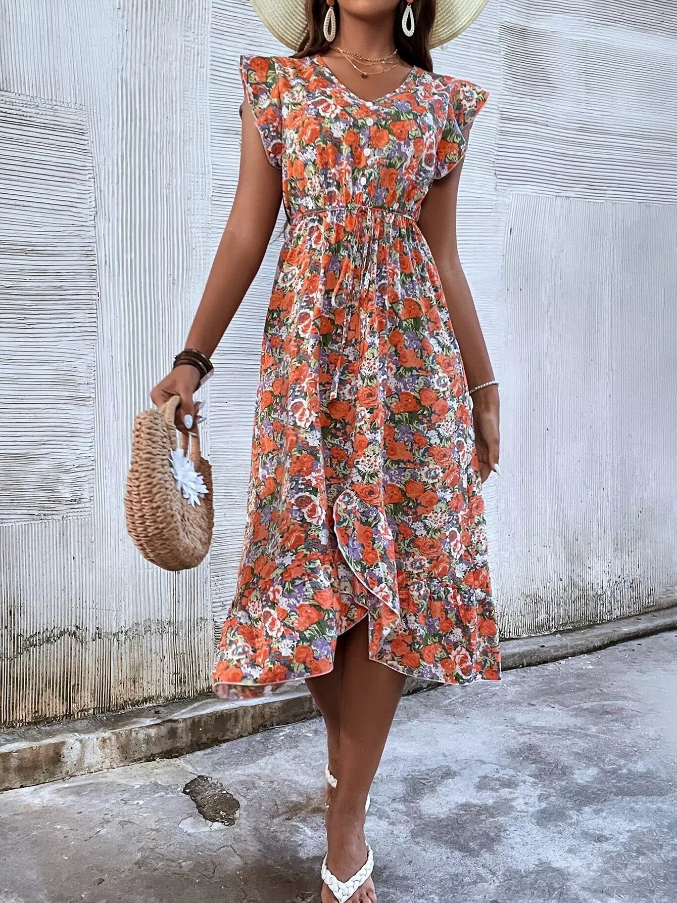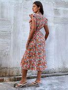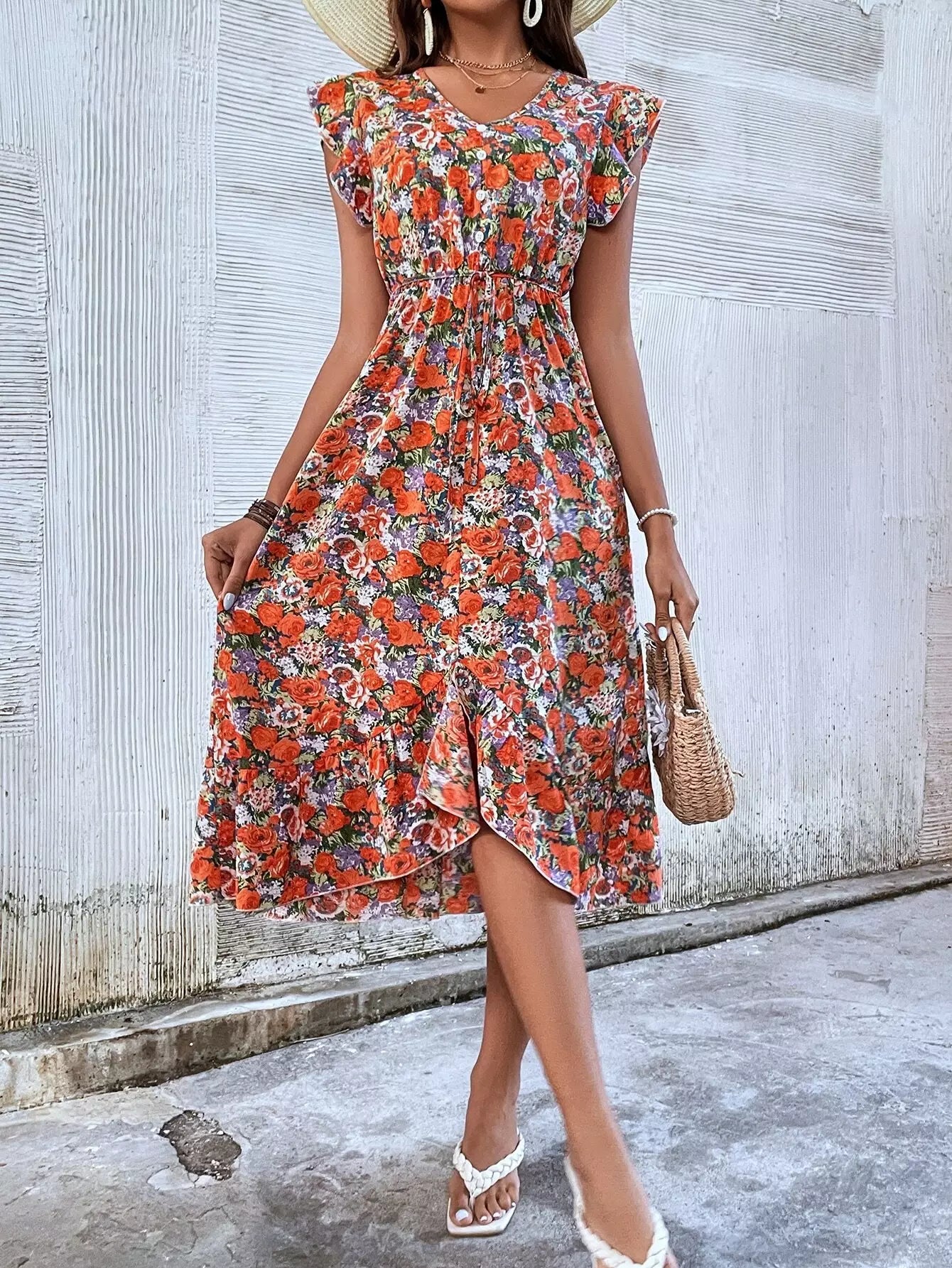 فستان مزين بكشكش مزين بالزهور بدون حزام