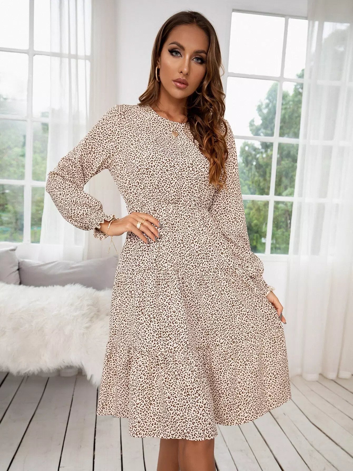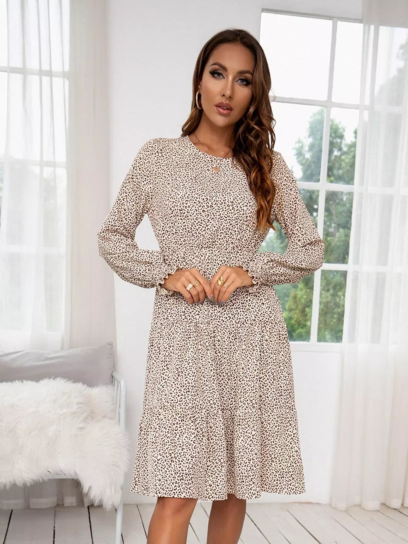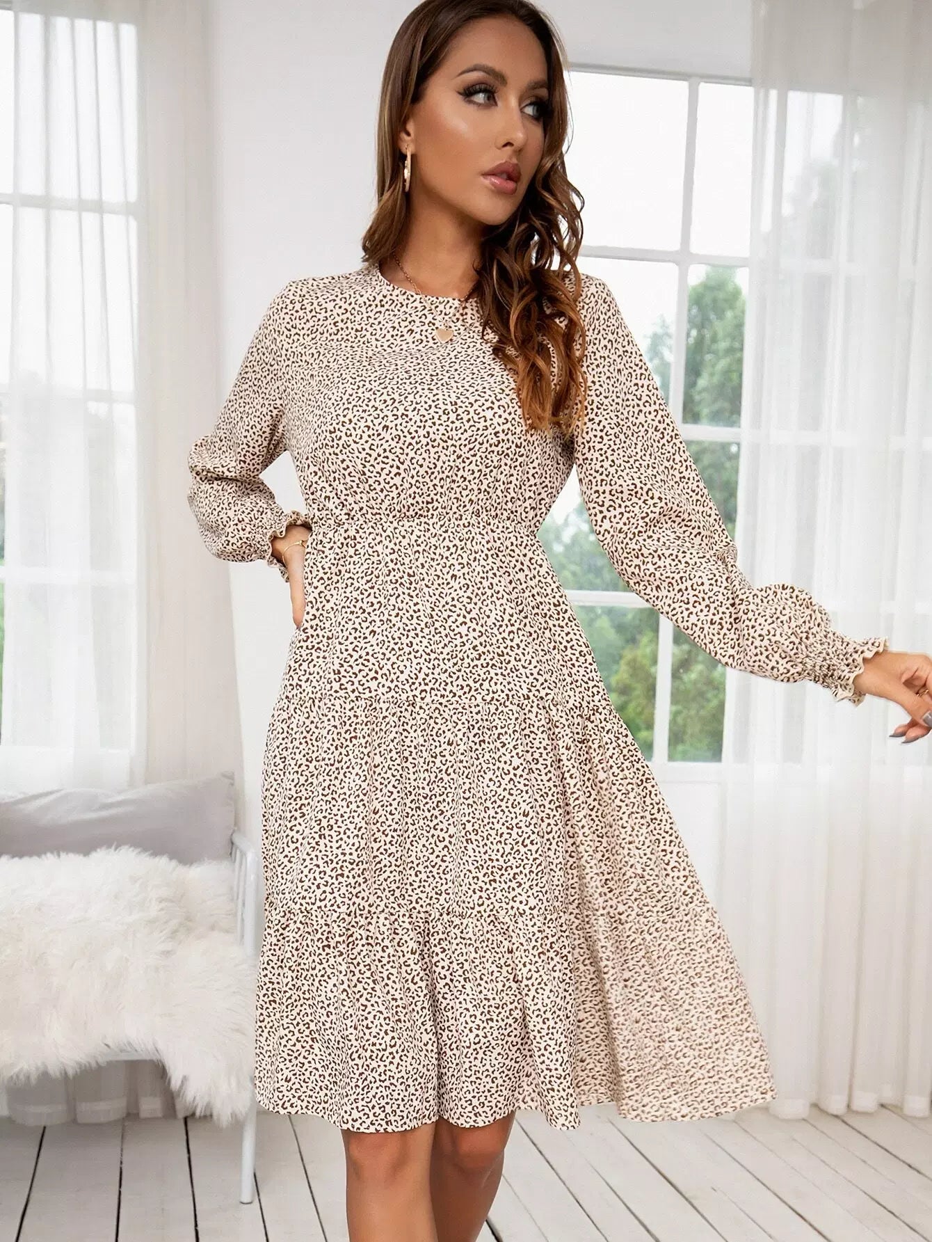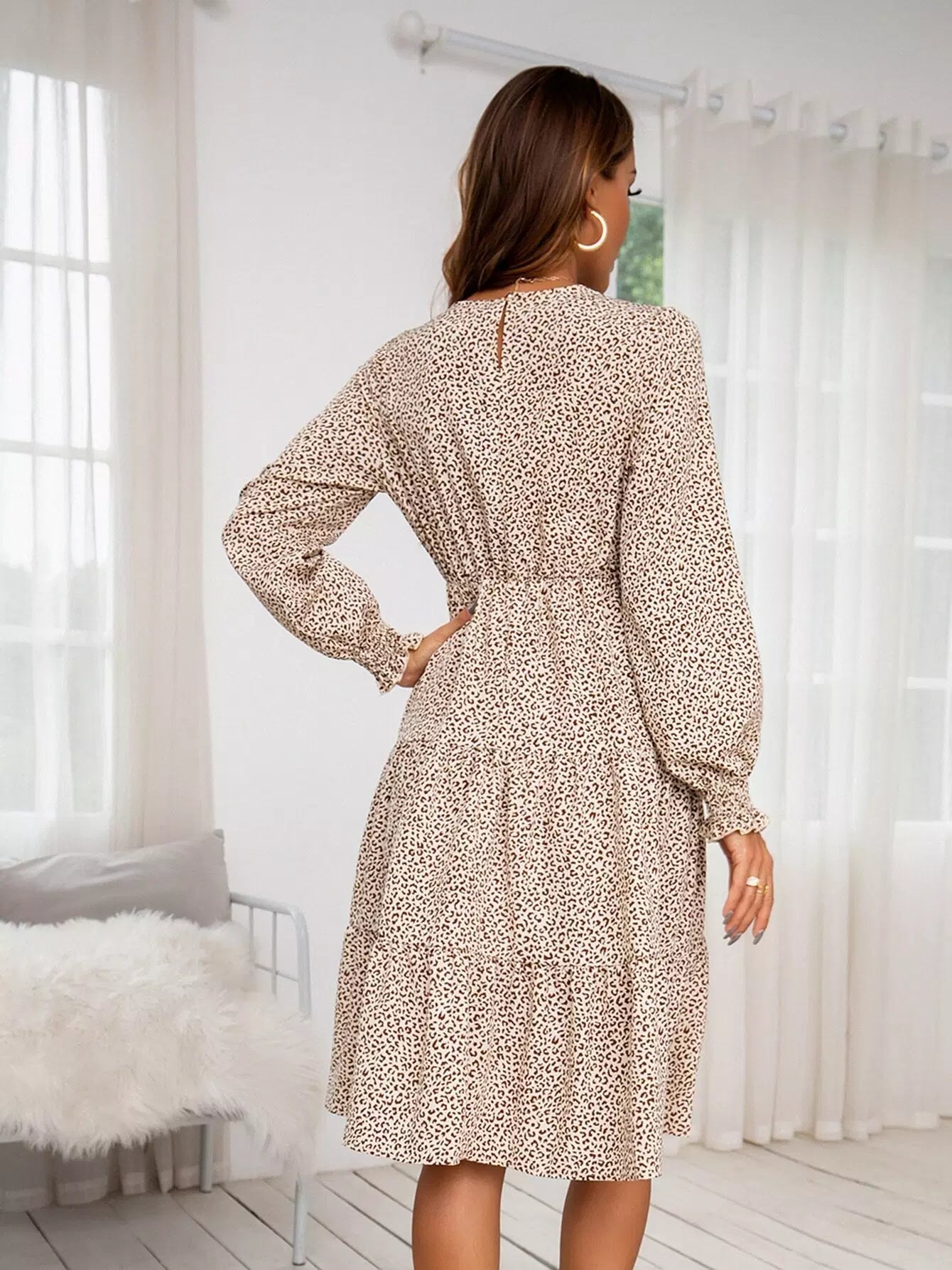 فستان بأكمام كشكش بأكمام منفوشة مطبوعة بالكامل