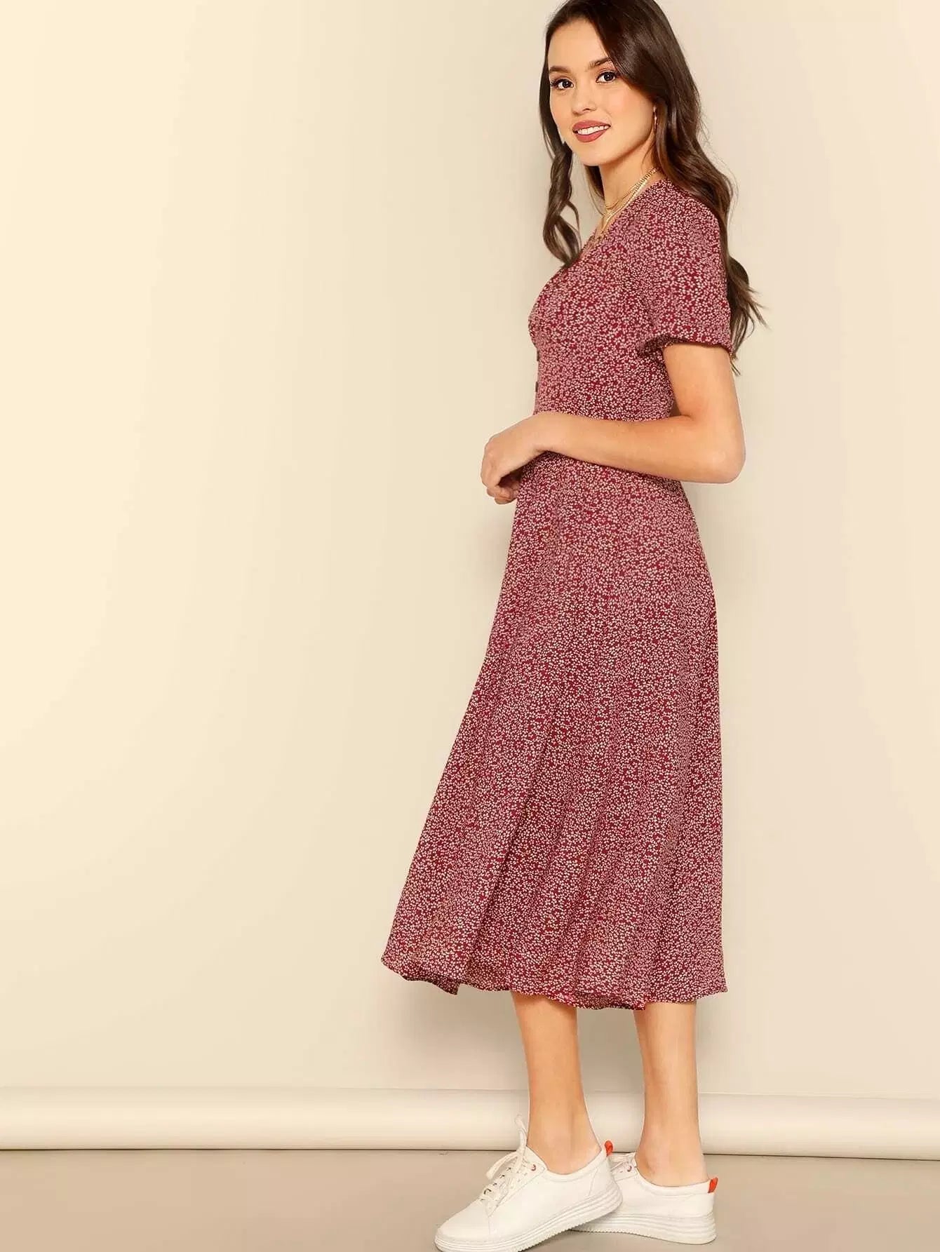 فستان بطبعة أزرار أمامية مطبوع بالكامل على شكل حرف V برقبة على شكل حرف V