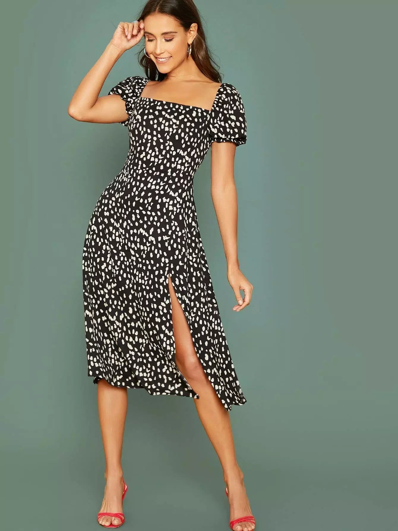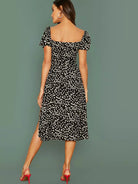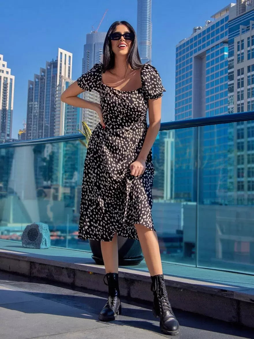 فستان بأكمام منفوشة بأكمام منفوخة بطبعة مرقش