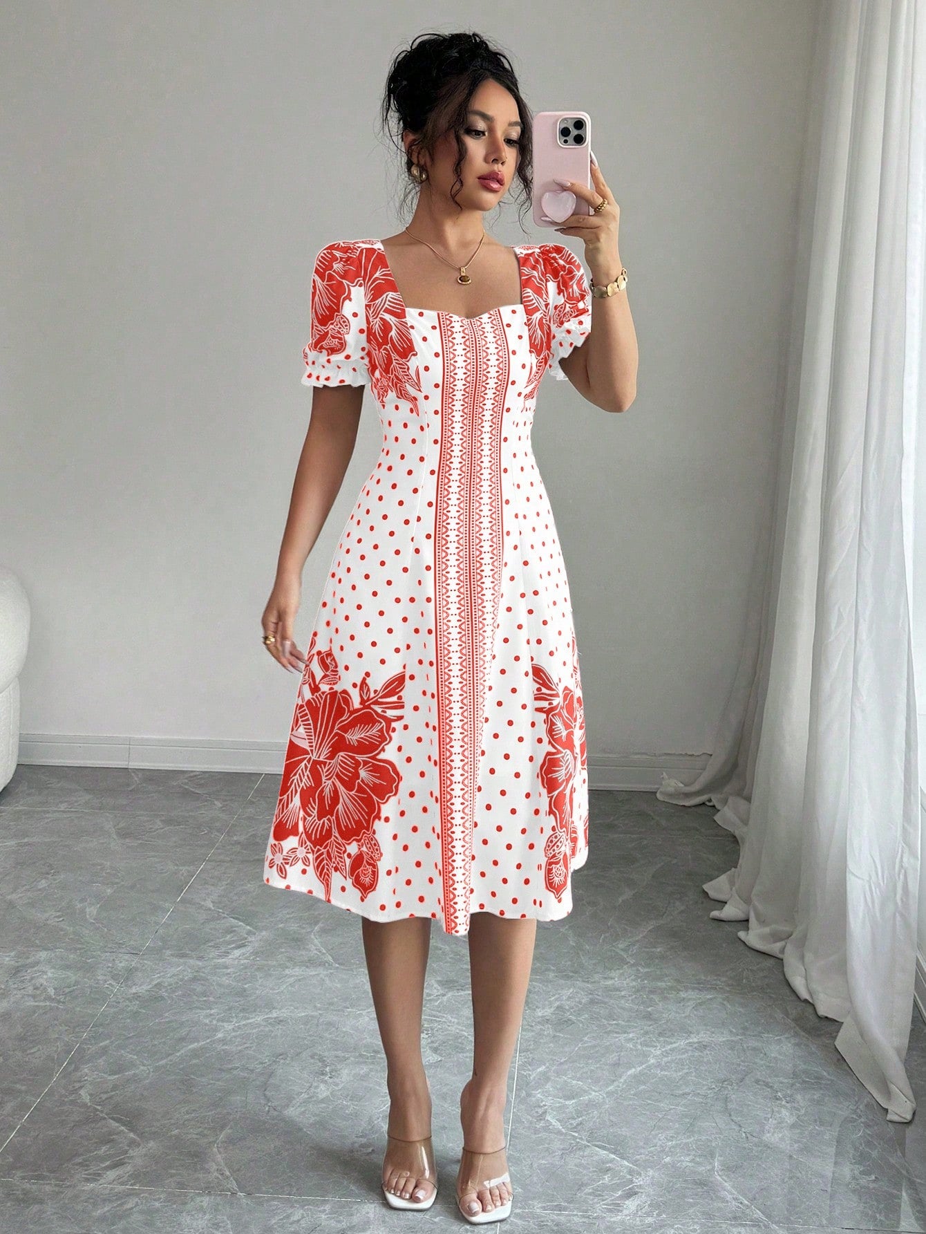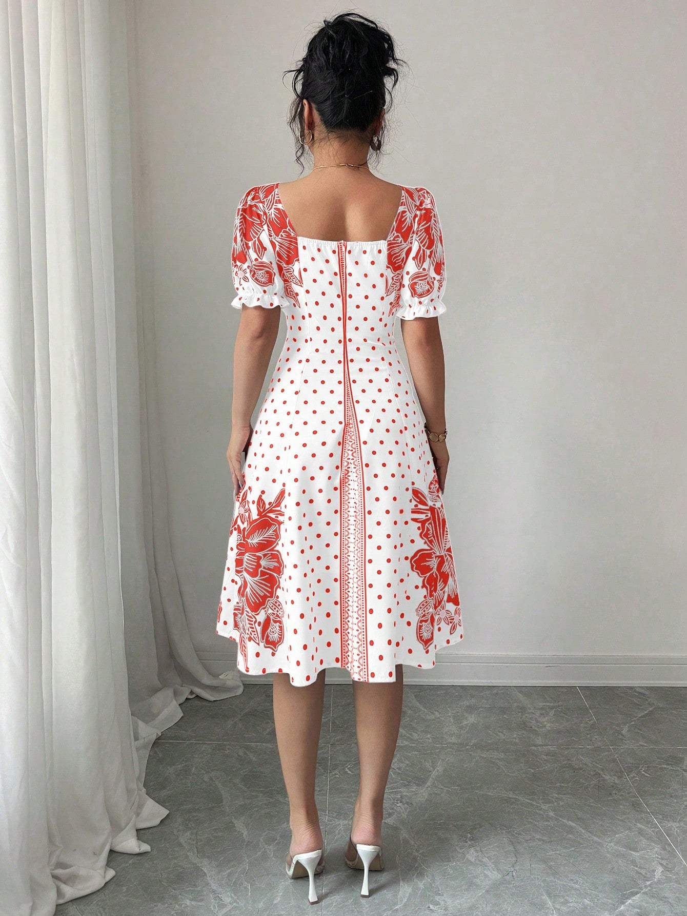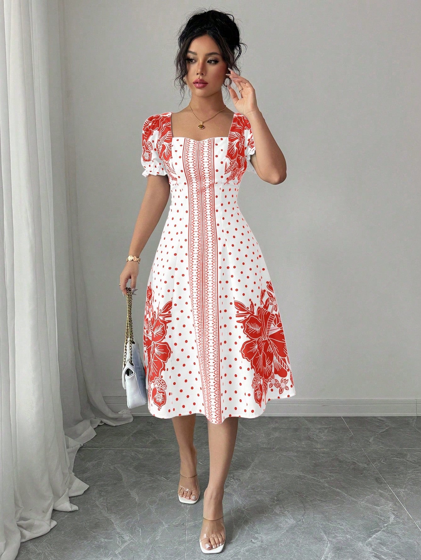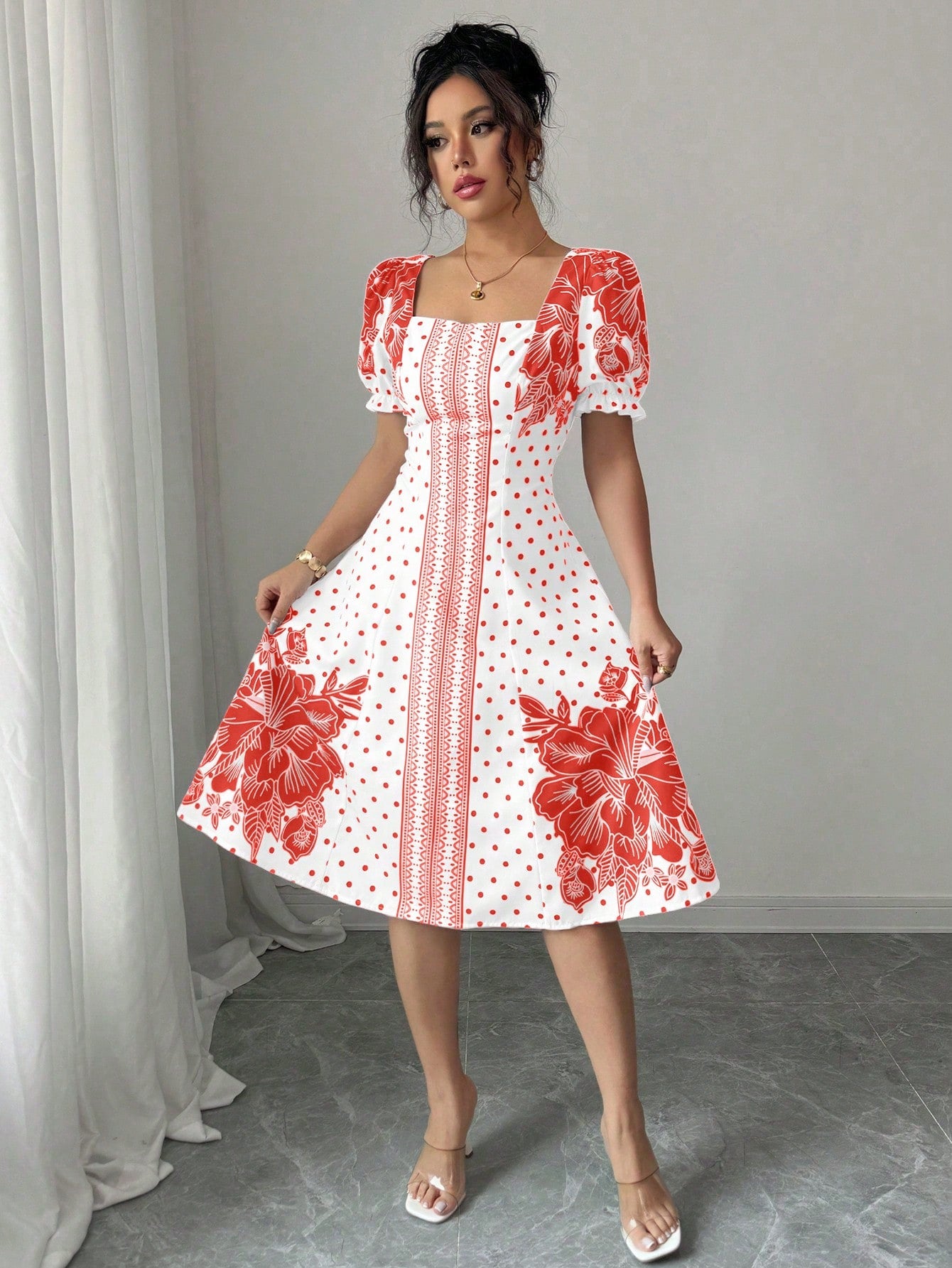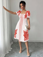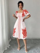 women Elenzga Bubble Short Sleeve Floral Polka Dot Print A-Line Elegant Dress