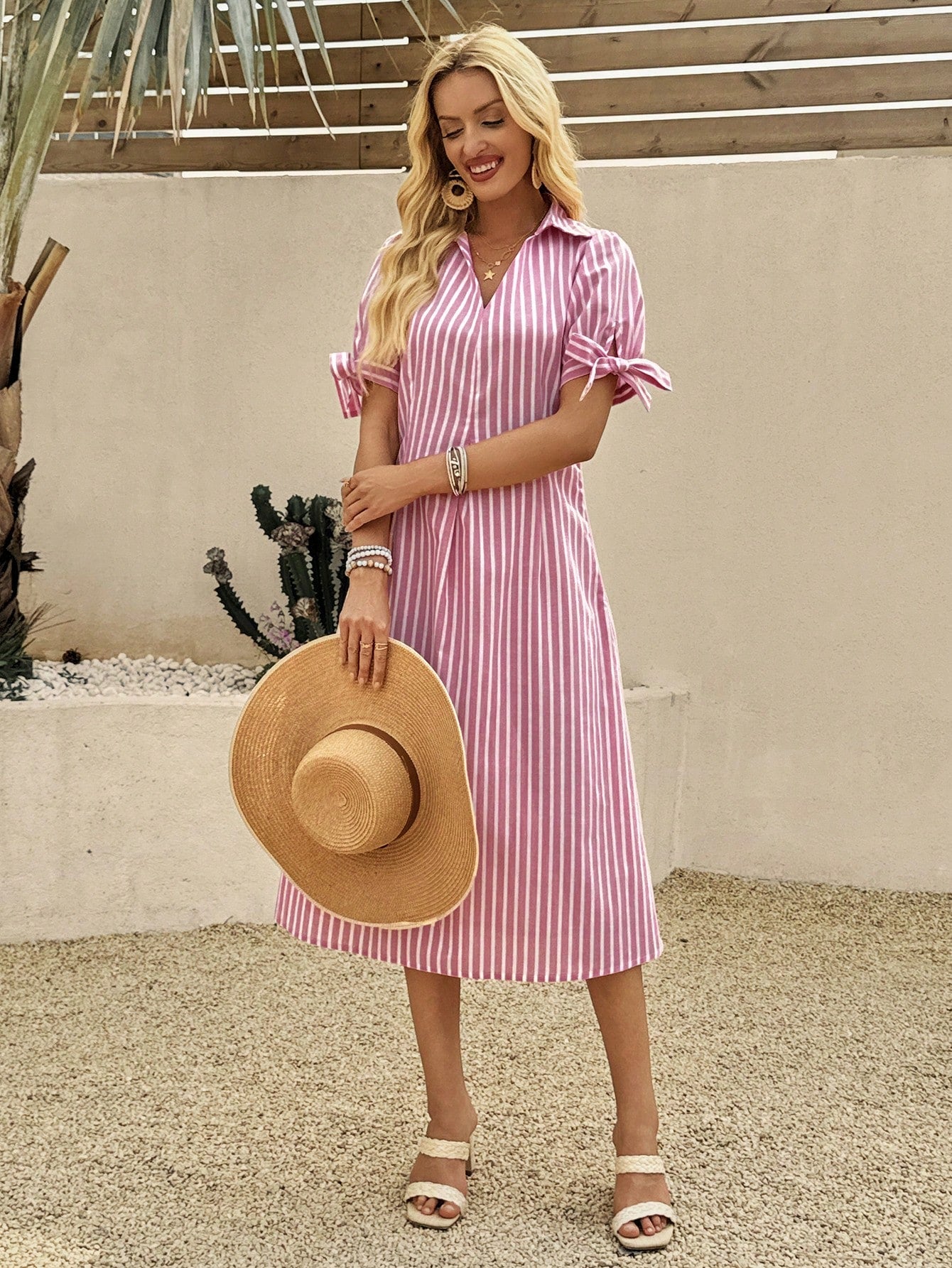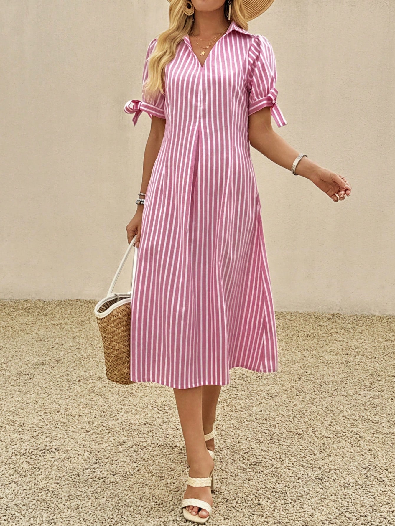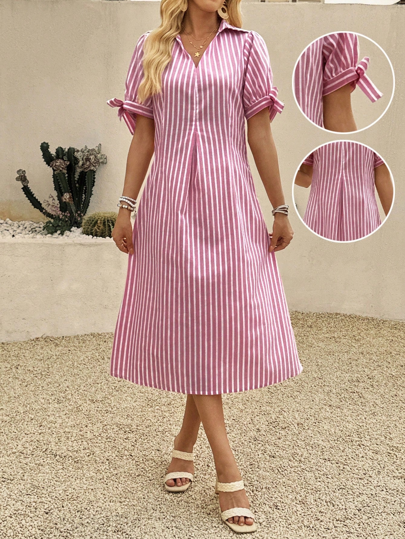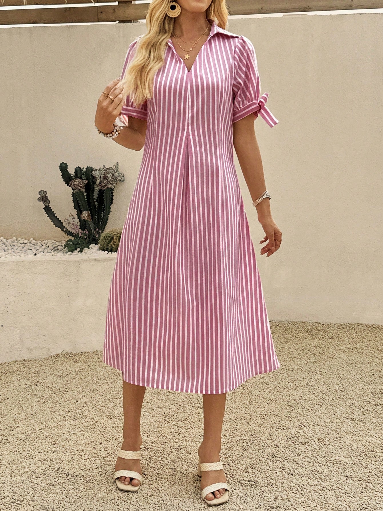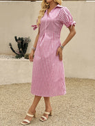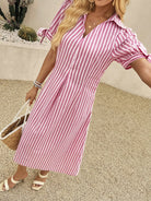 women EMERY ROSE Women's Casual Striped Polo Collar Short Sleeve Knotted Midi Dress