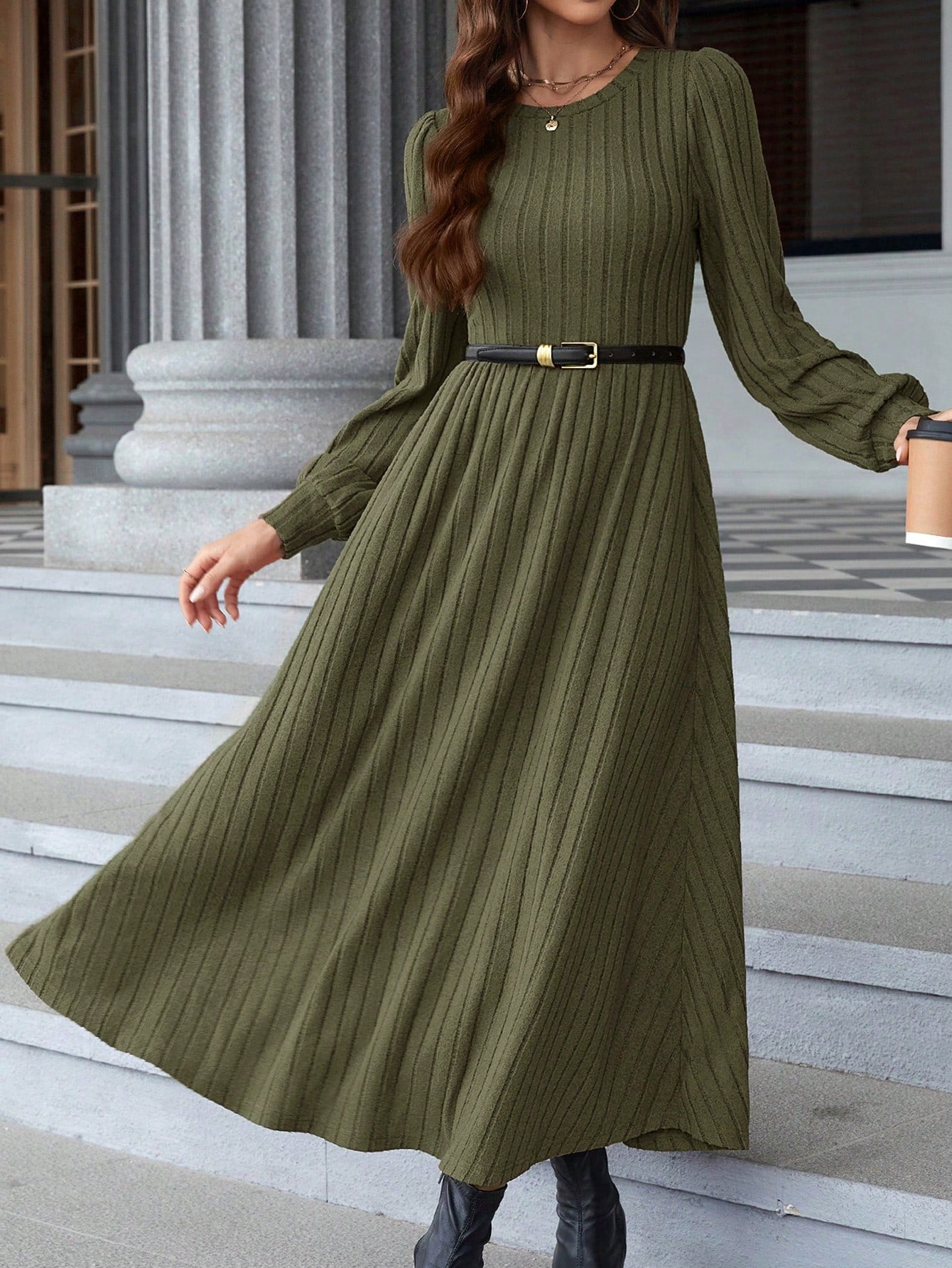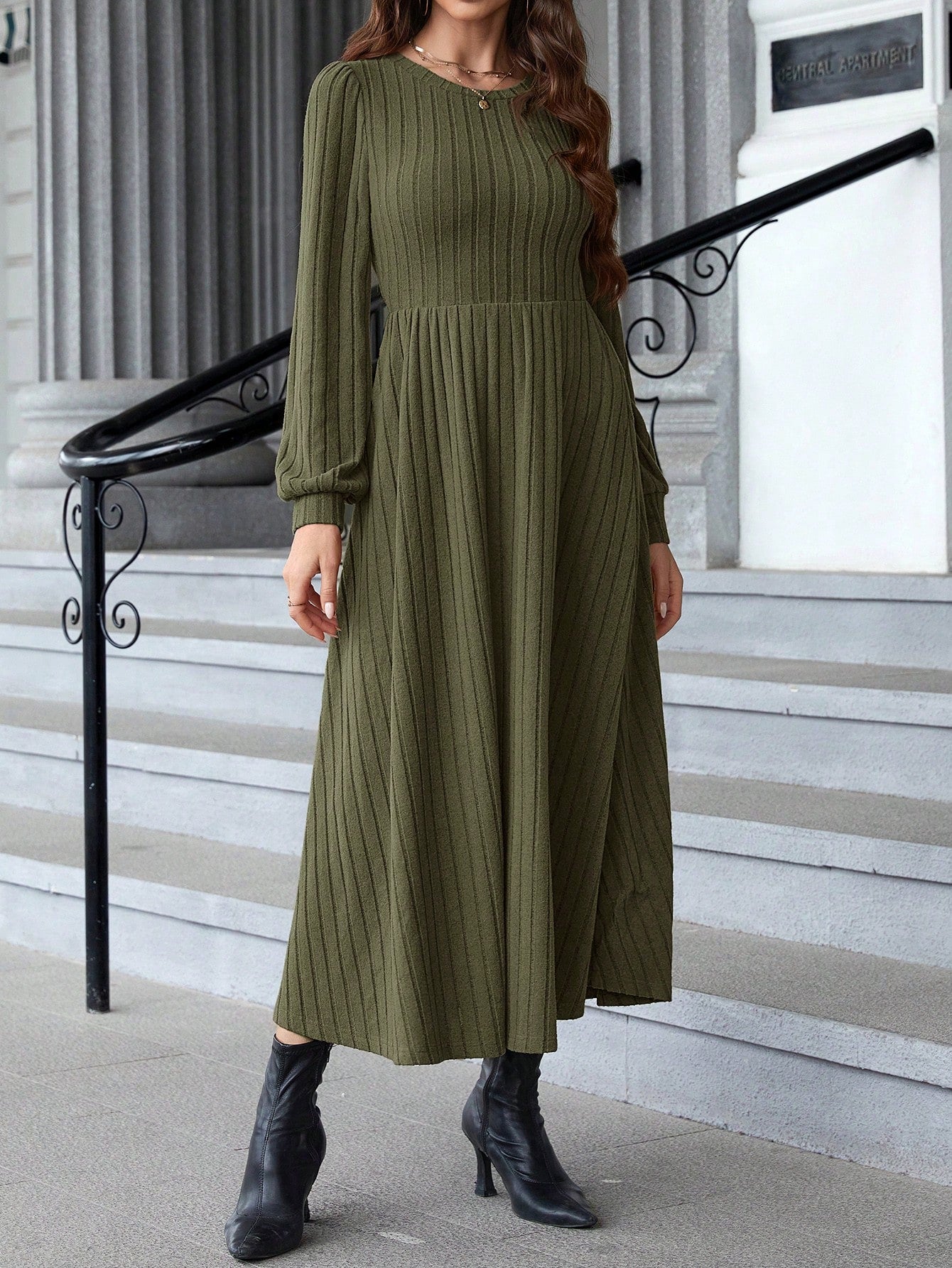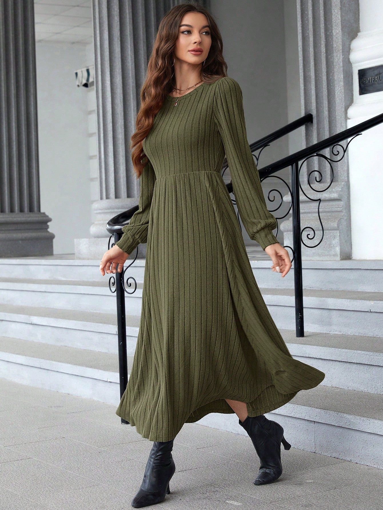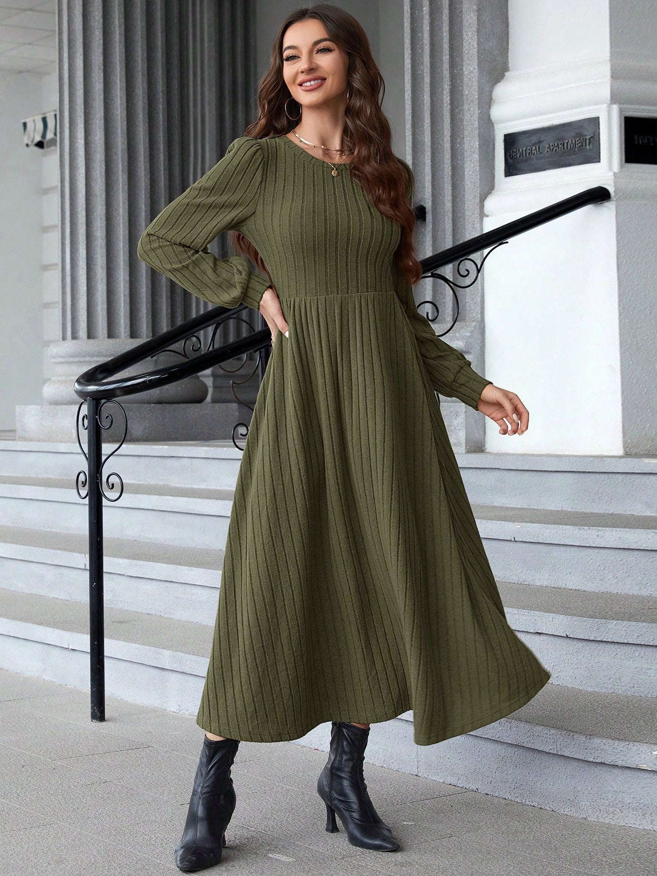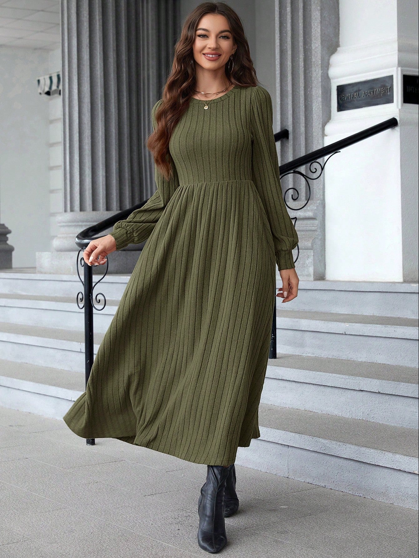 women EMERY ROSE Women's Round Neck Long Sleeve Pleated Casual Everyday Dress Fall Women Dresses Prom Dress Black Long Sleeve Dress