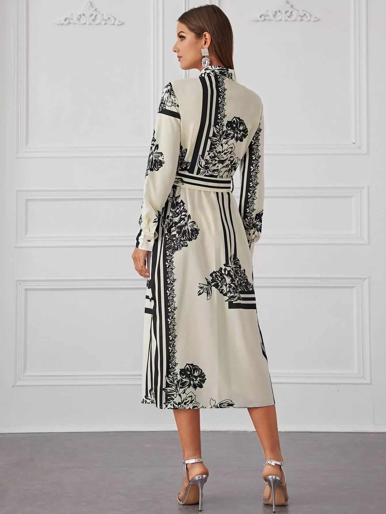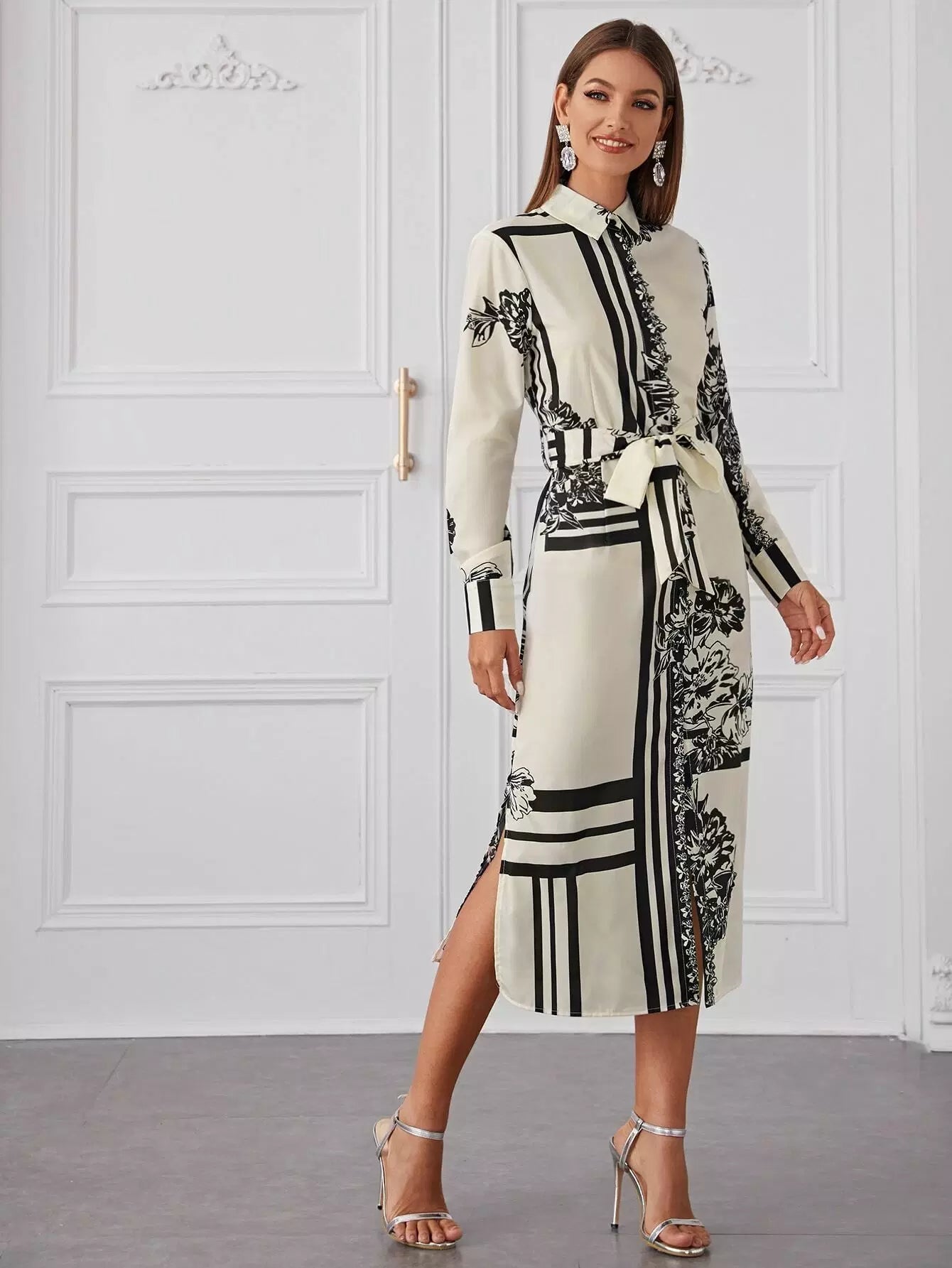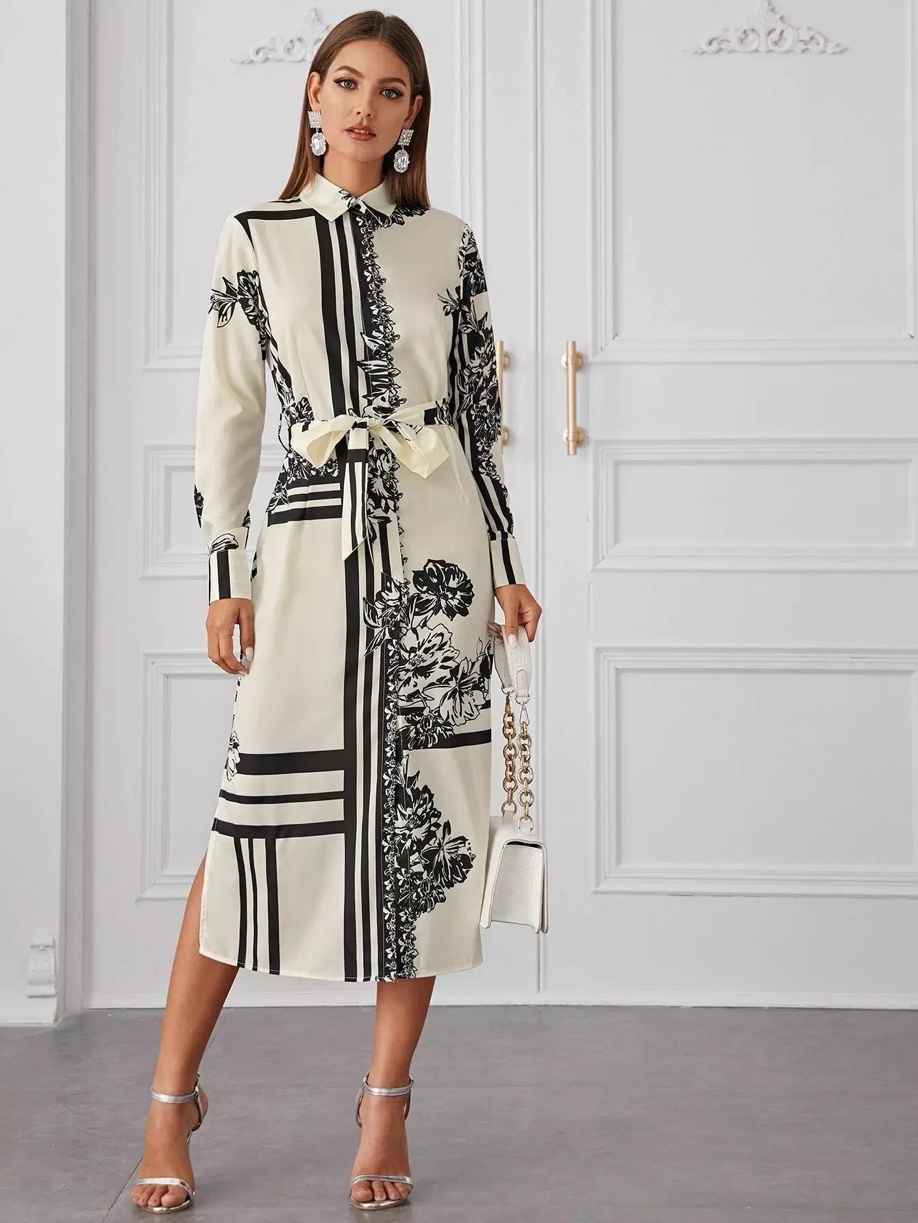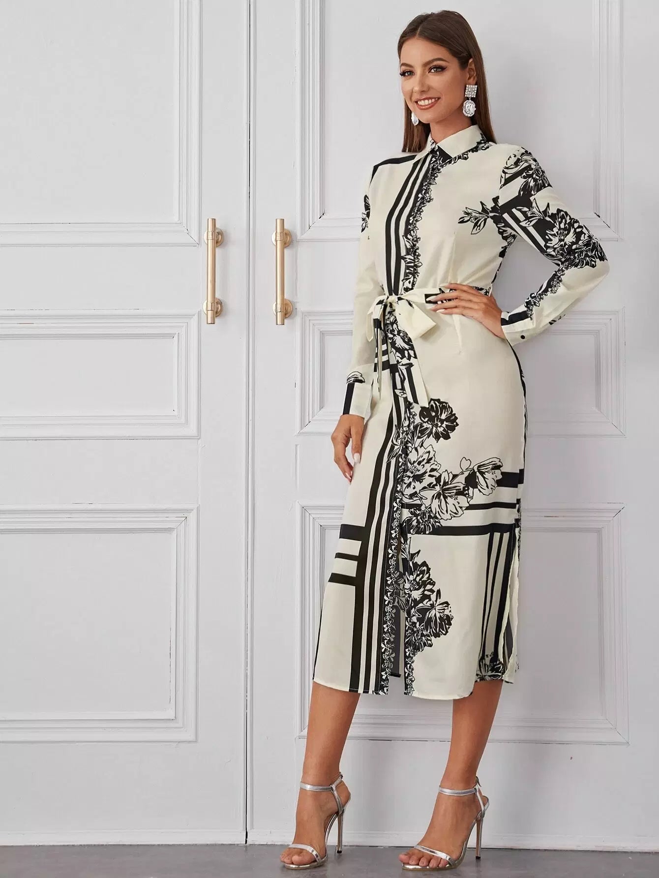 فستان قميص بحاشية مقسمة وطبعات زهرية وجيو بدون حزام