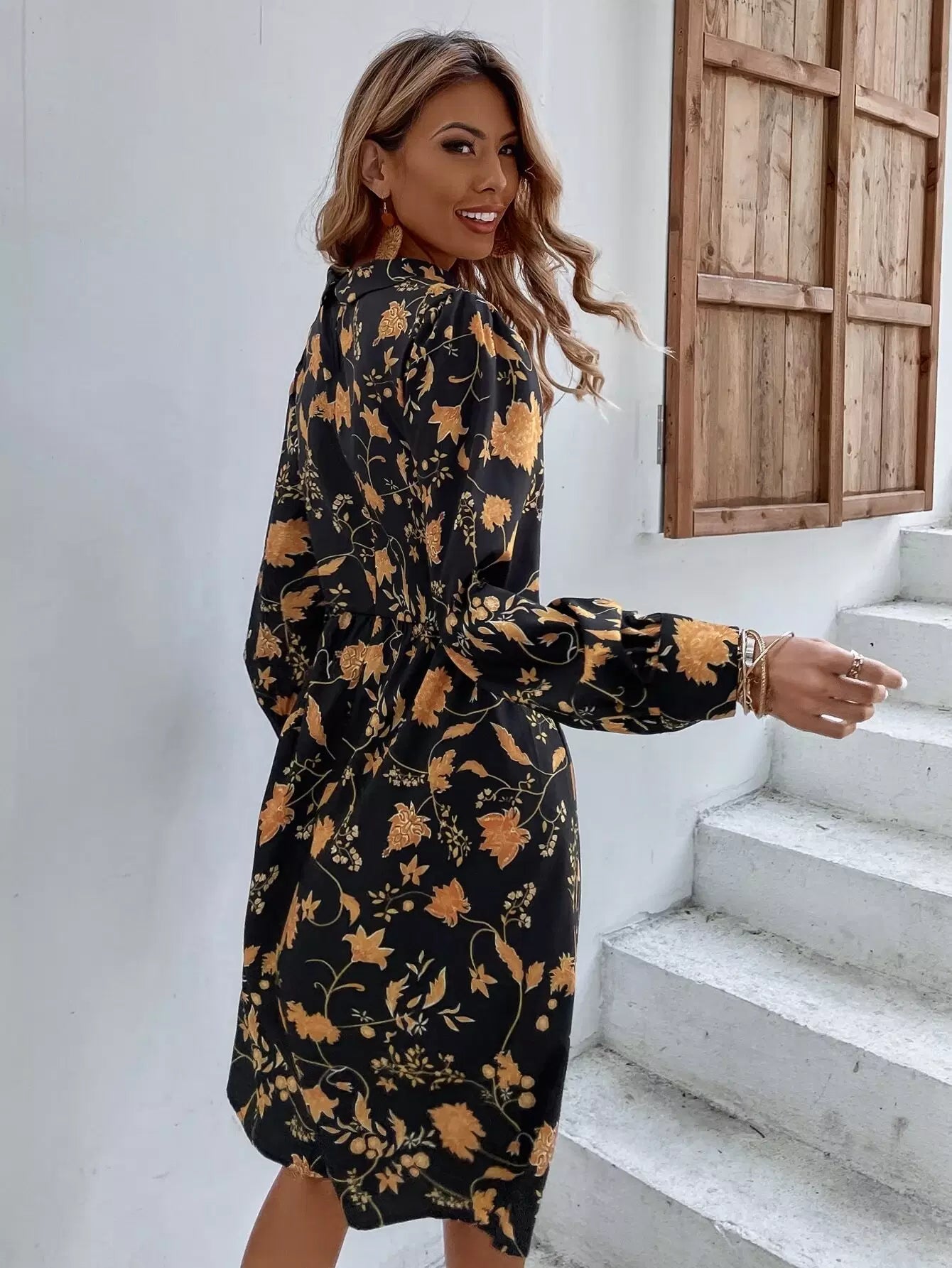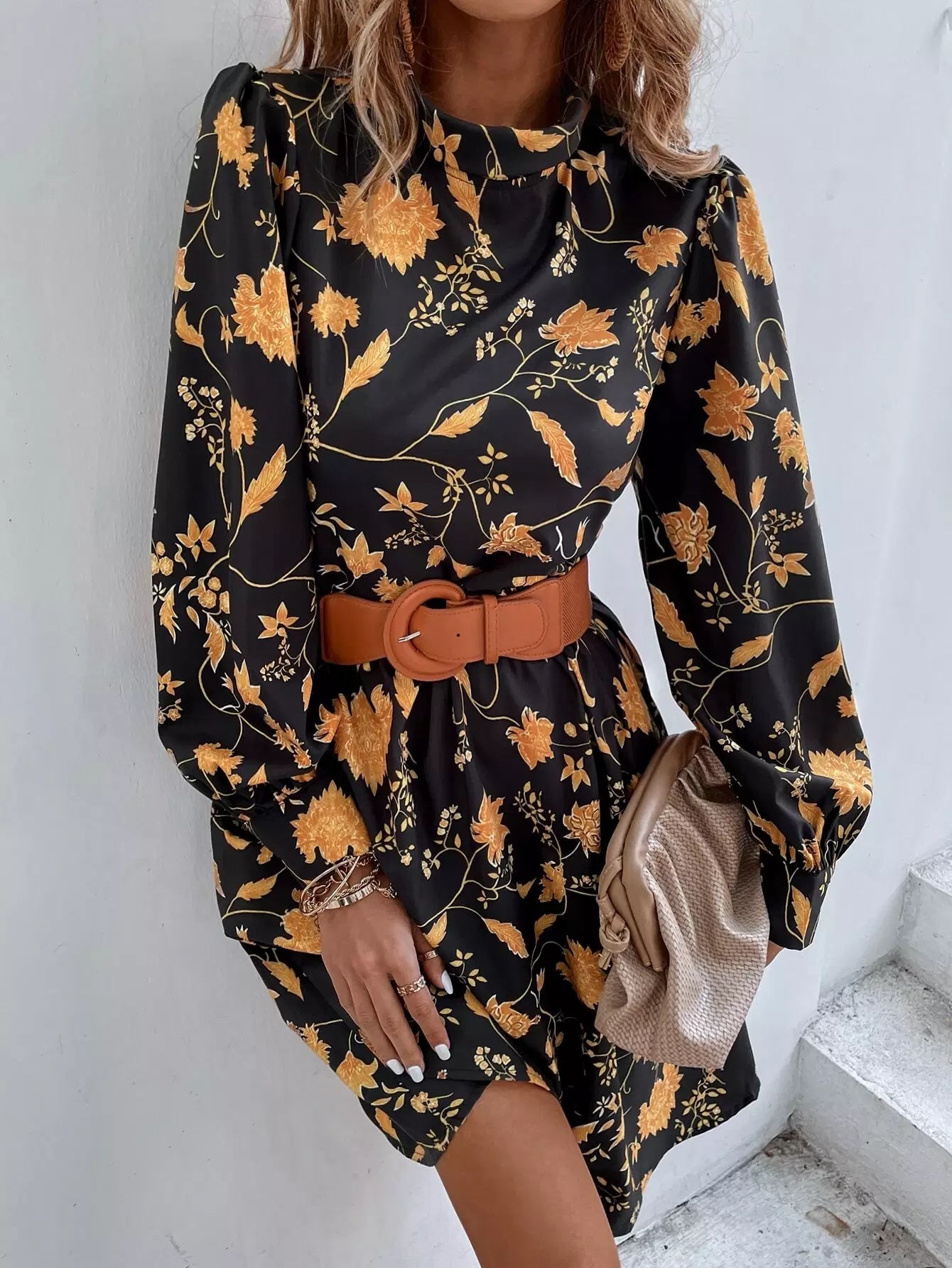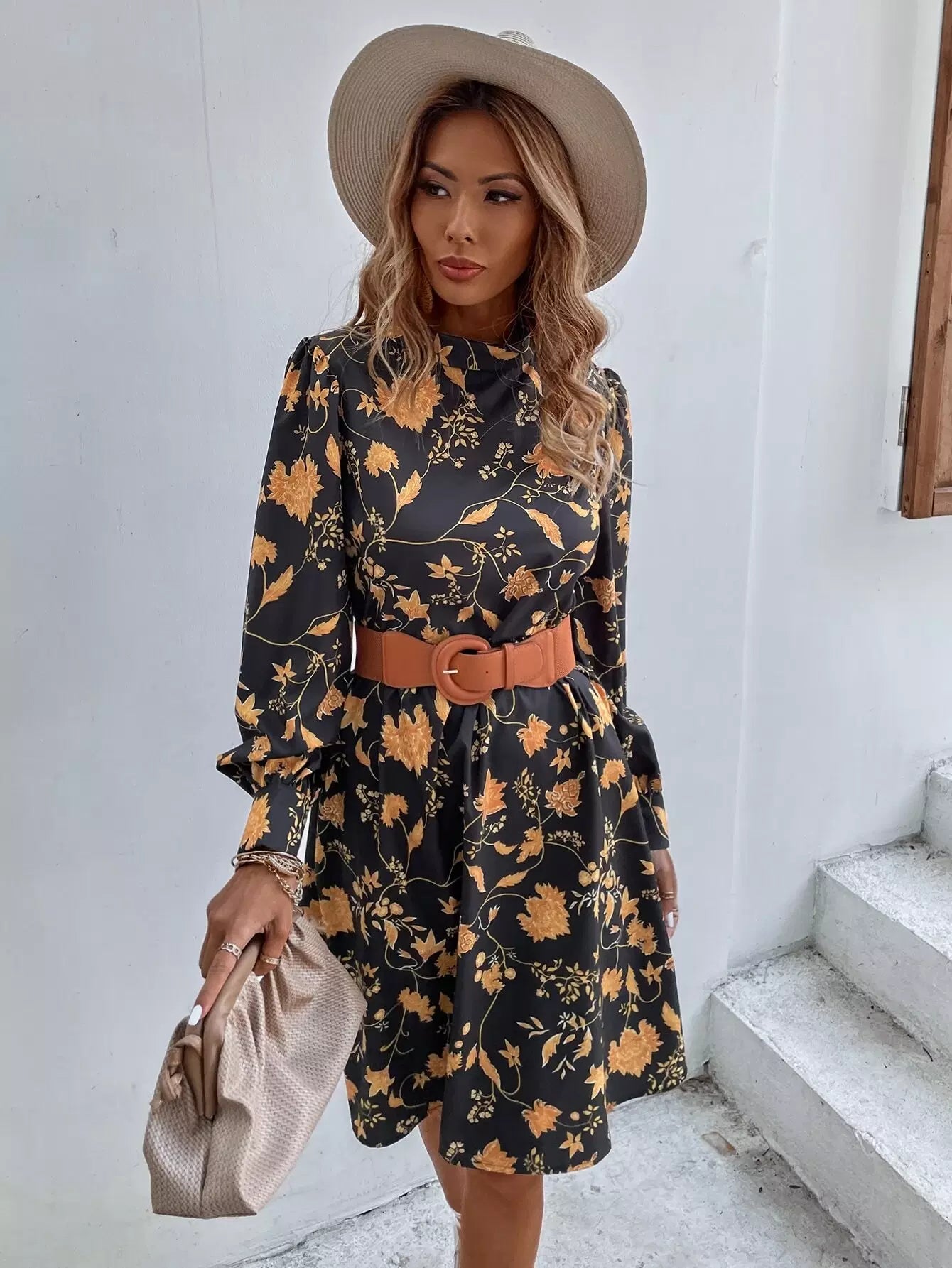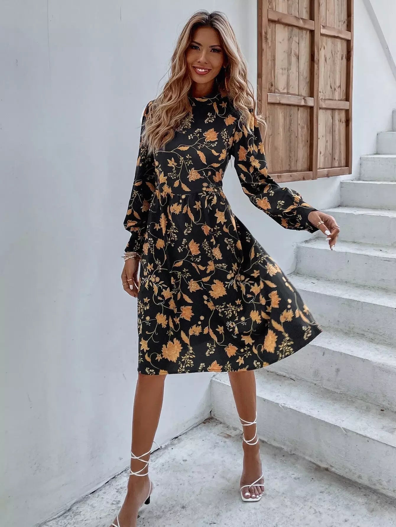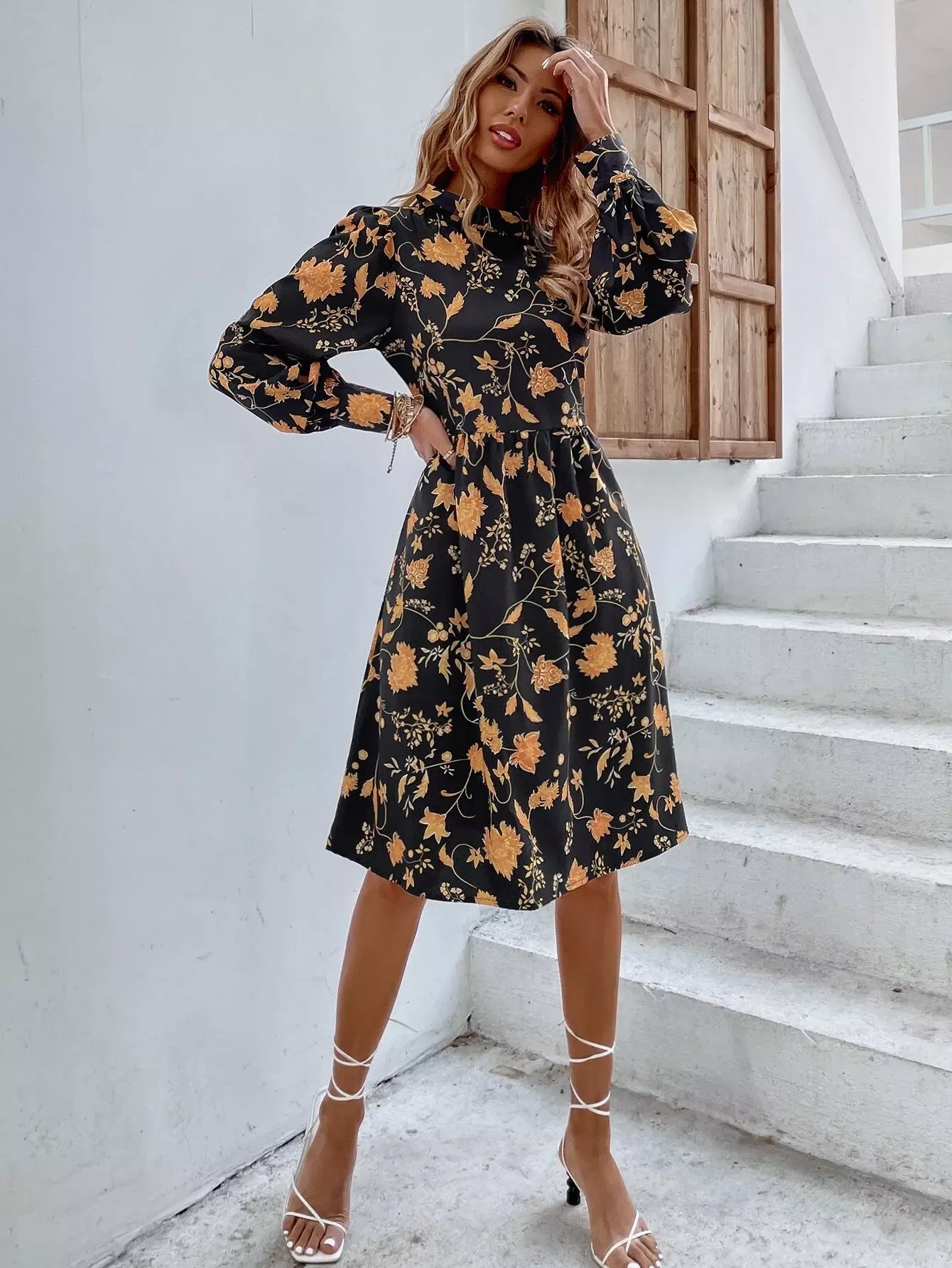 للنساء - فستان على شكل حرف A بطباعة زهور ورقبة وهمية بدون حزام