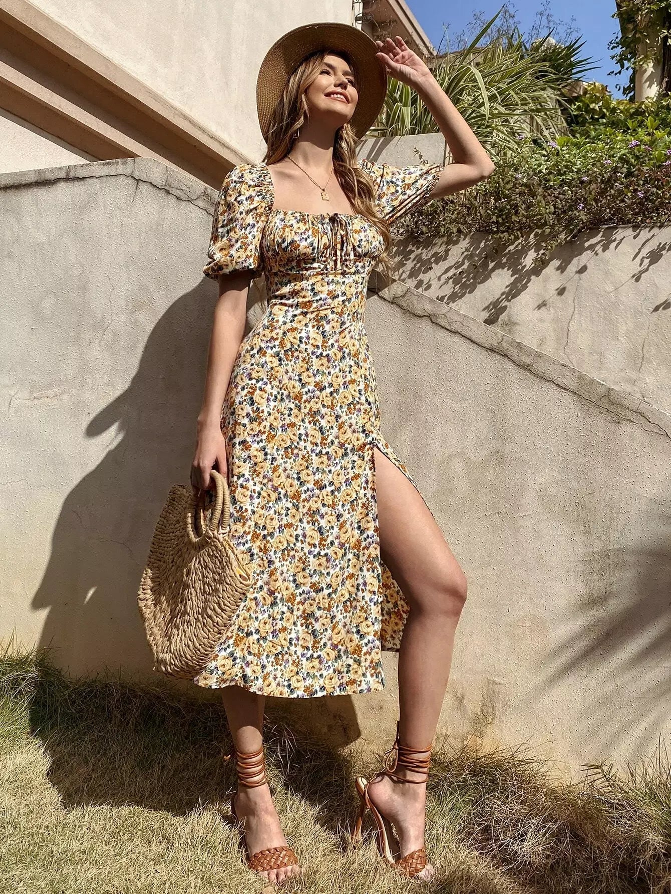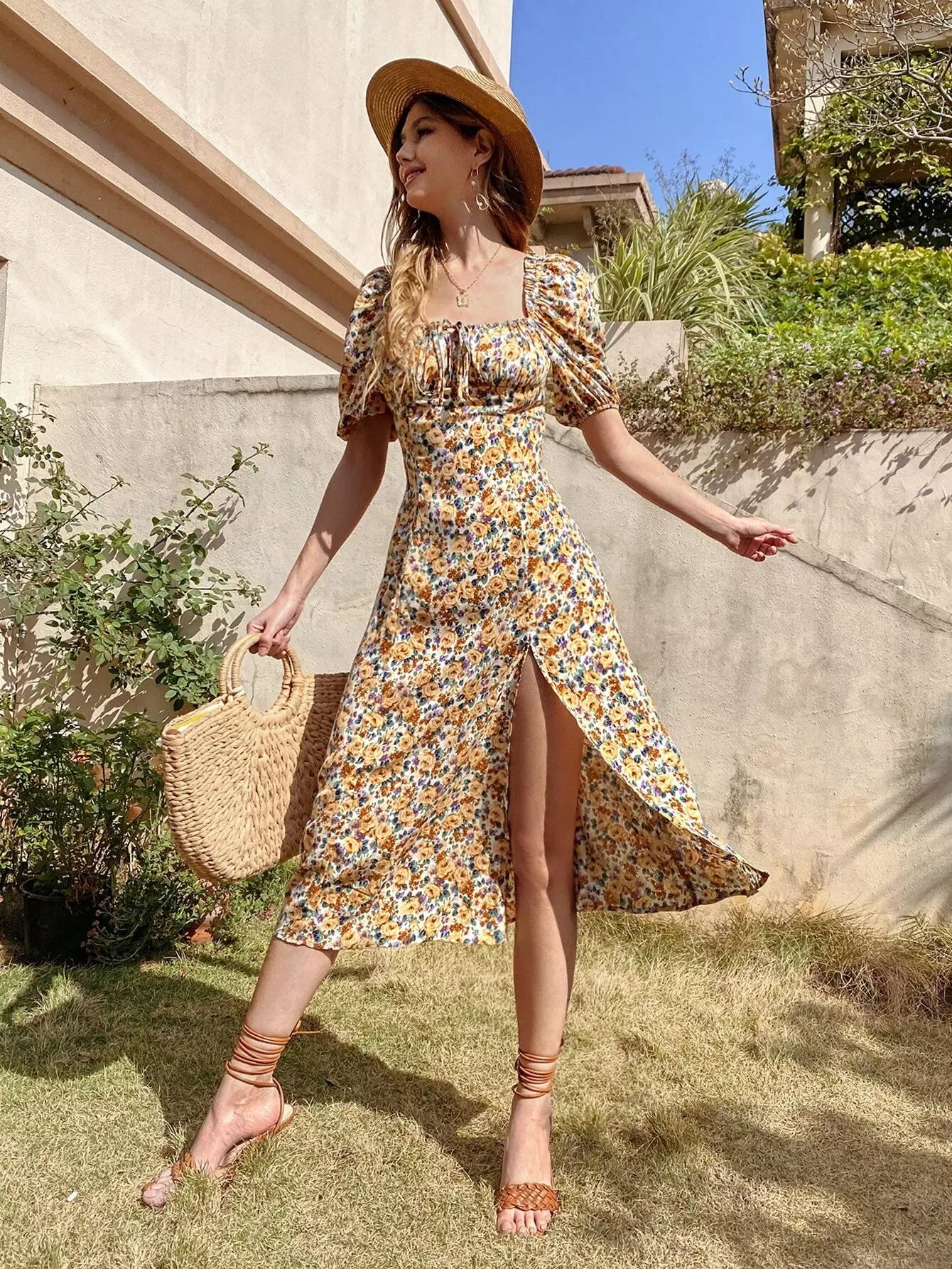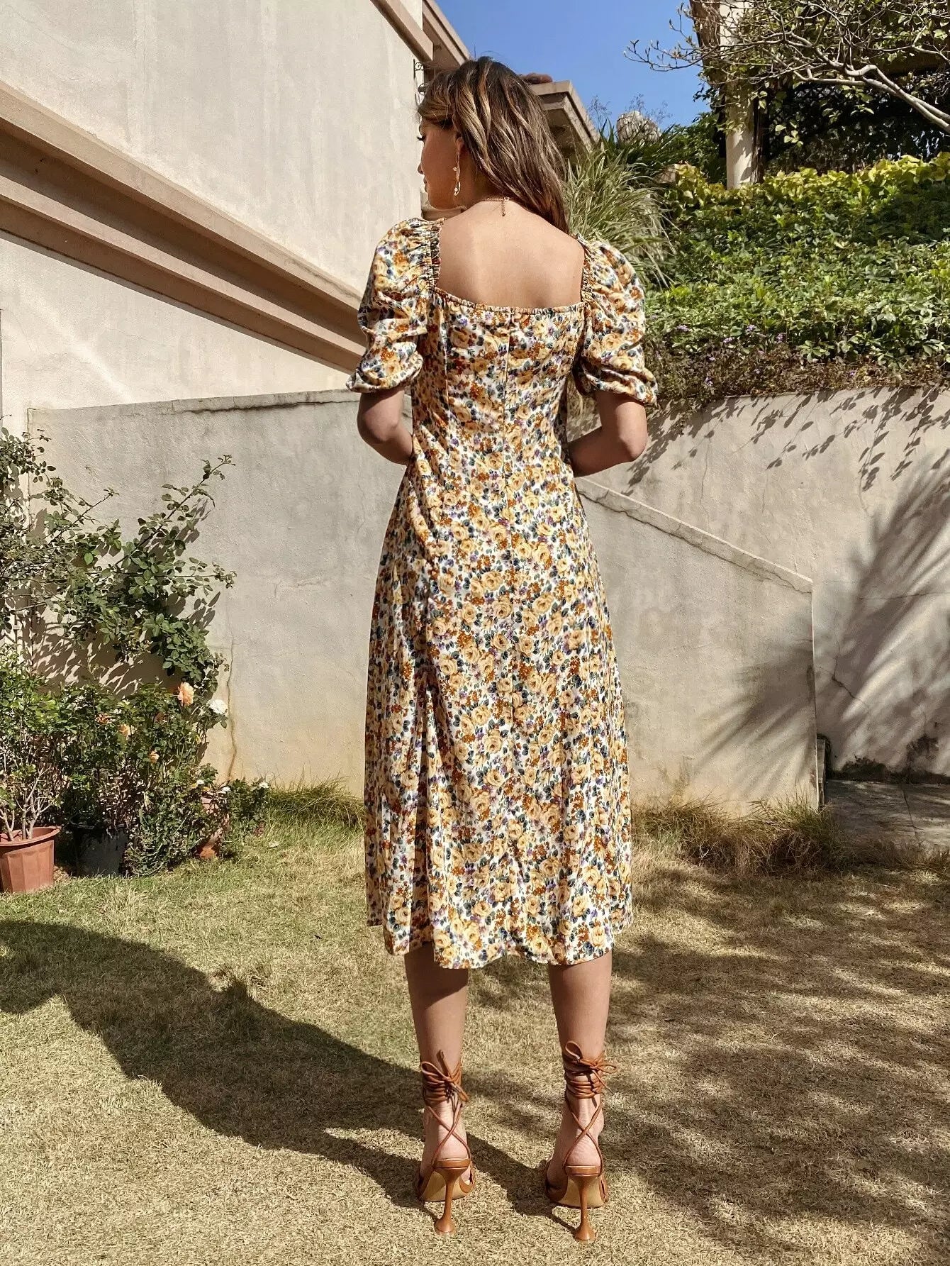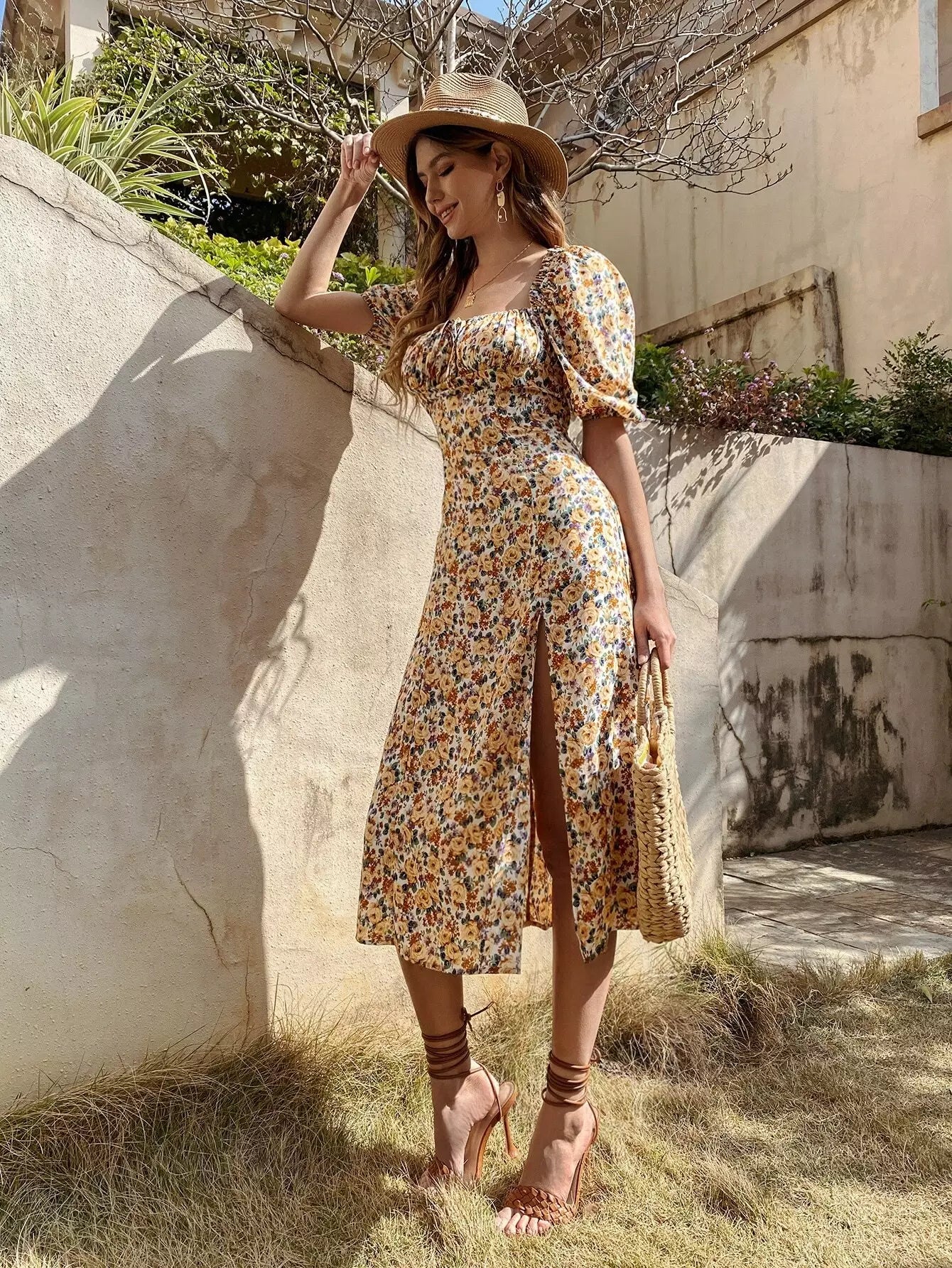 فستان مكشكش منقوش الزهور بحافة منقسمة على الصدر