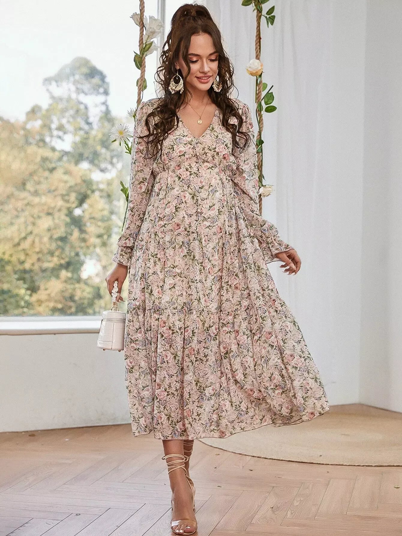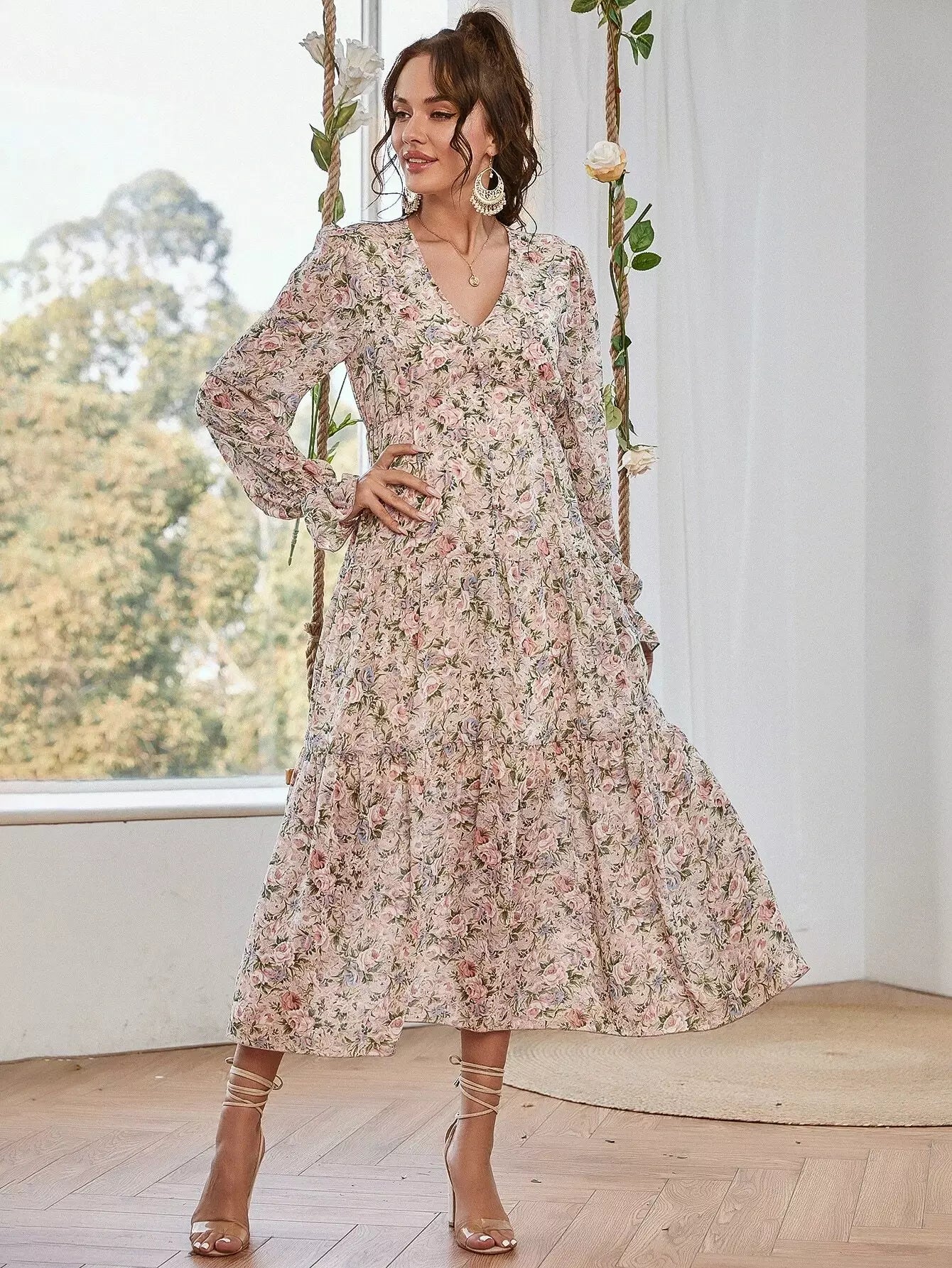 فستان بفتحة رقبة على شكل V بياقة زهرية على شكل كشكش بحافة طويلة