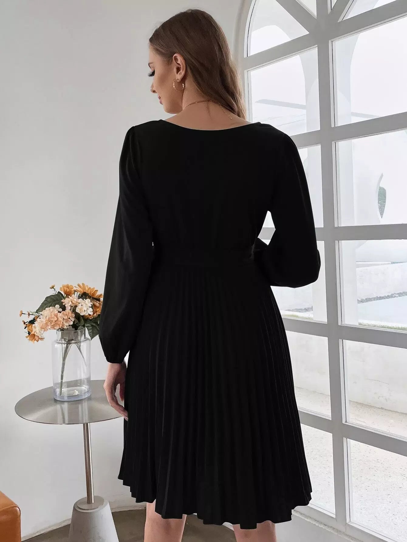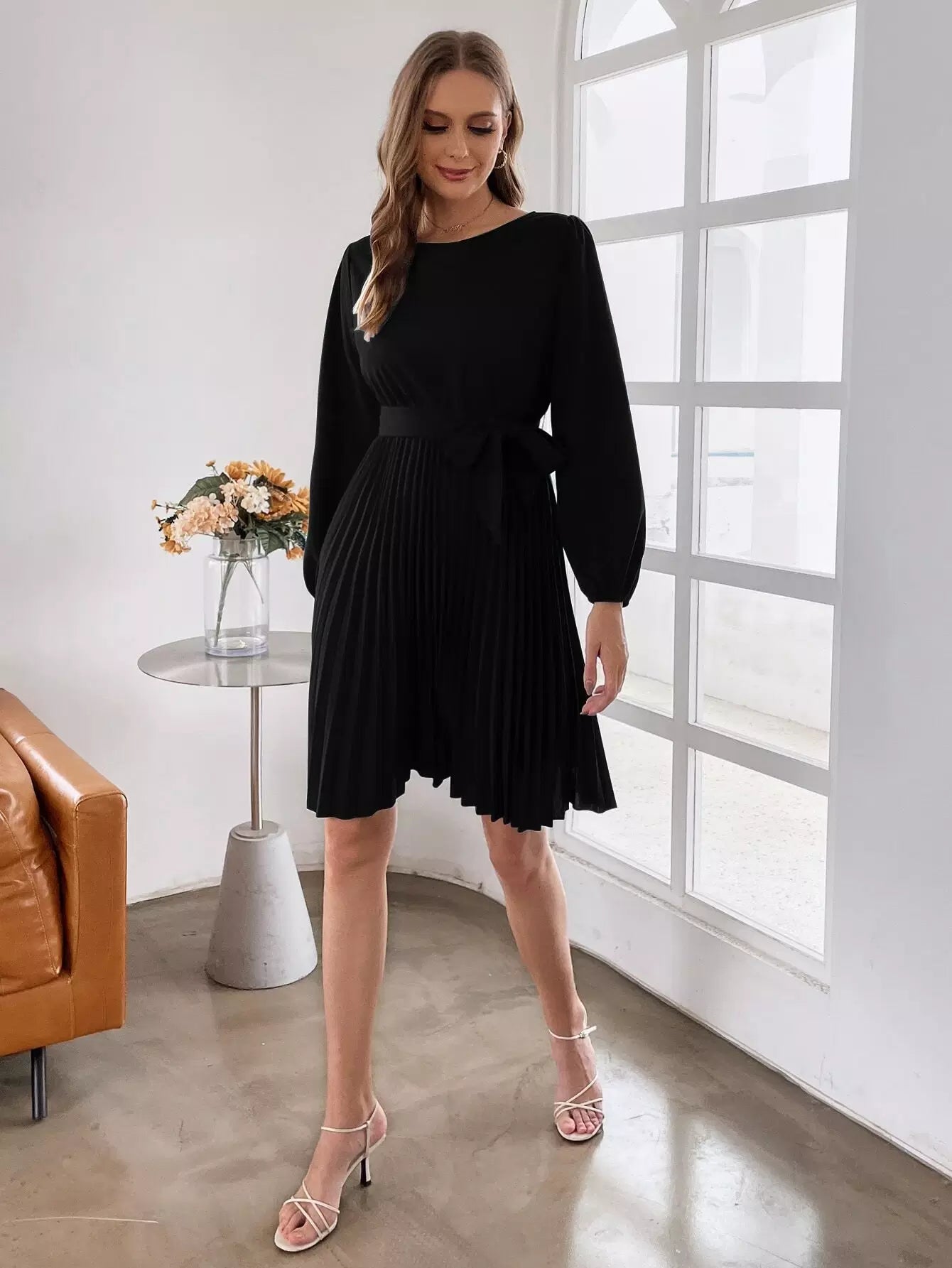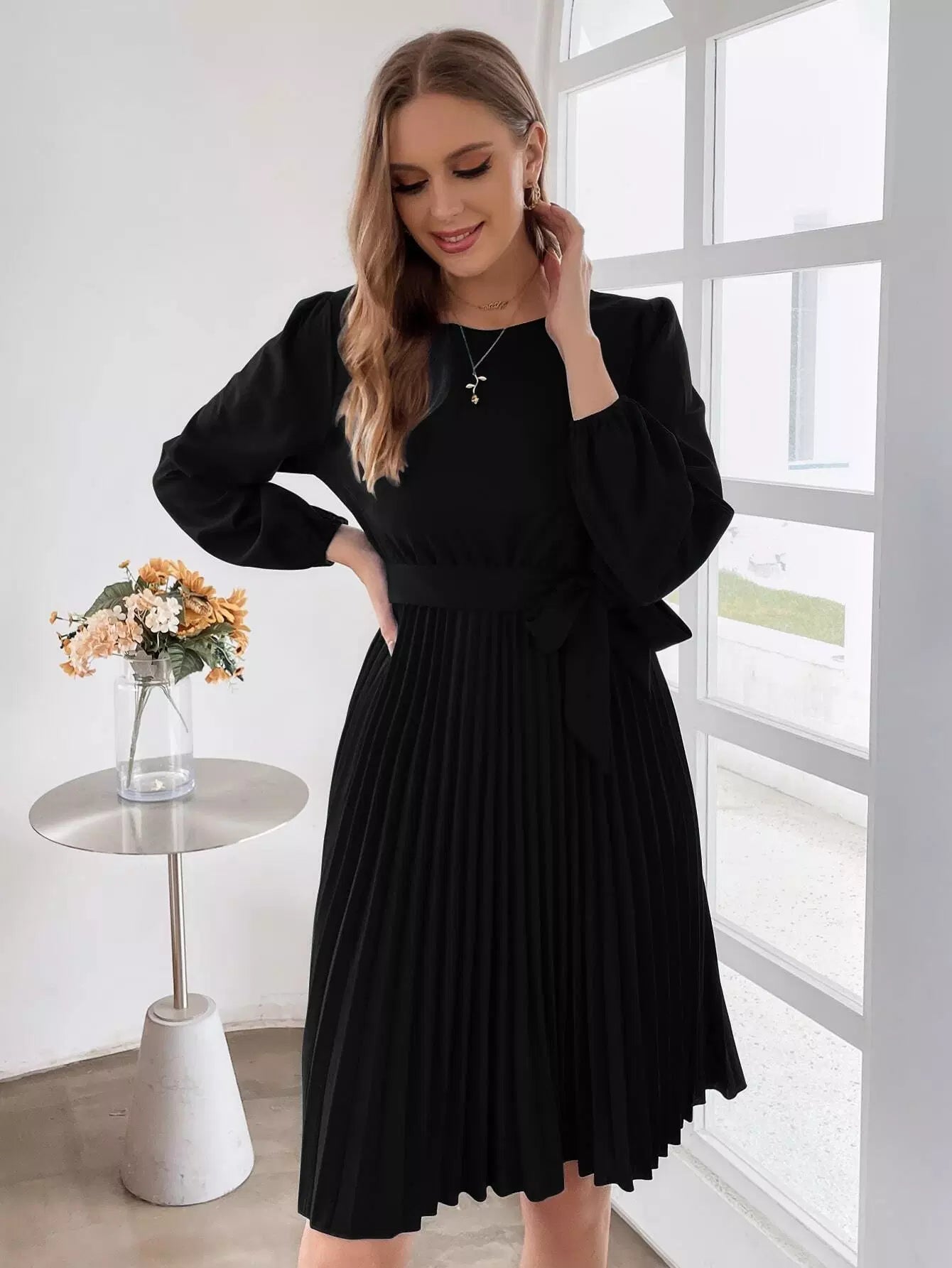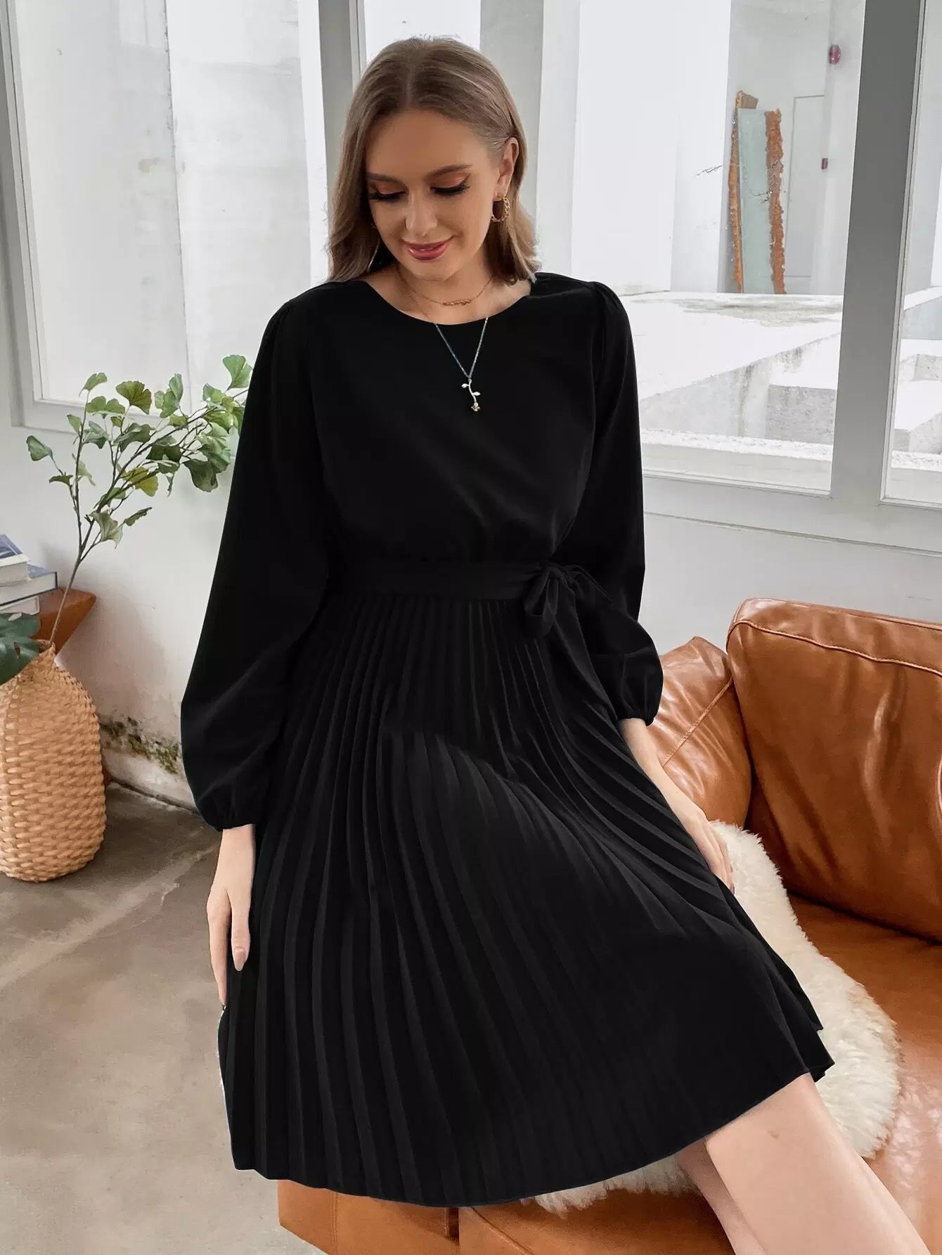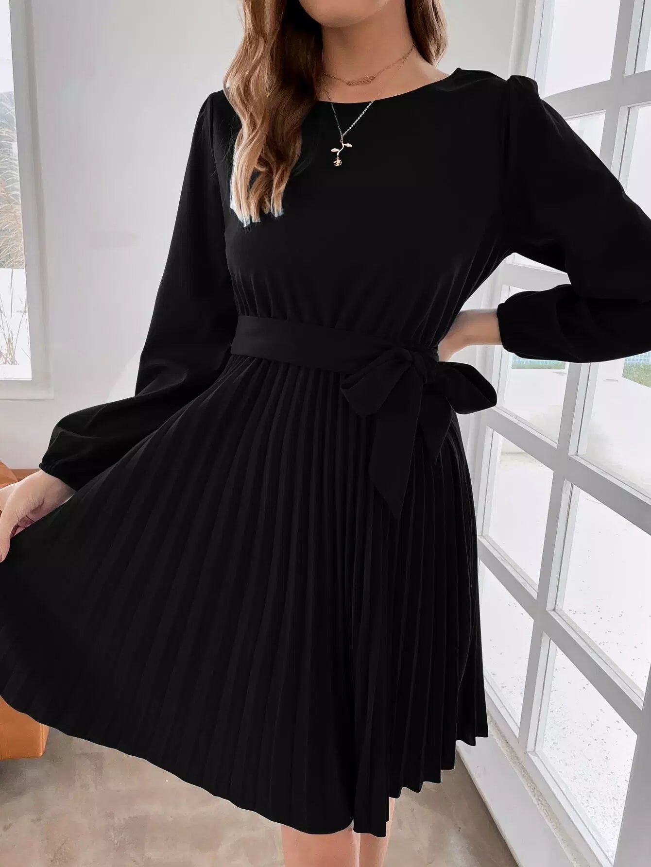فستان على شكل حرف A بأكمام فانوس ورباط أمامي وحاشية مطوية