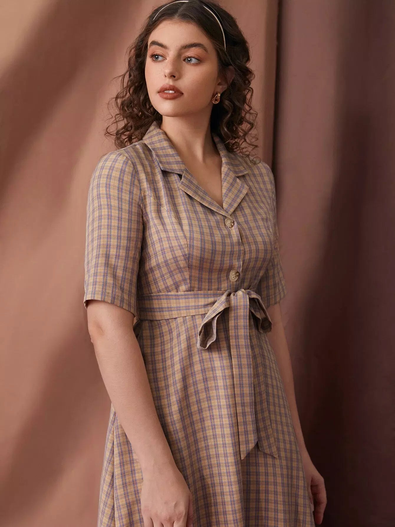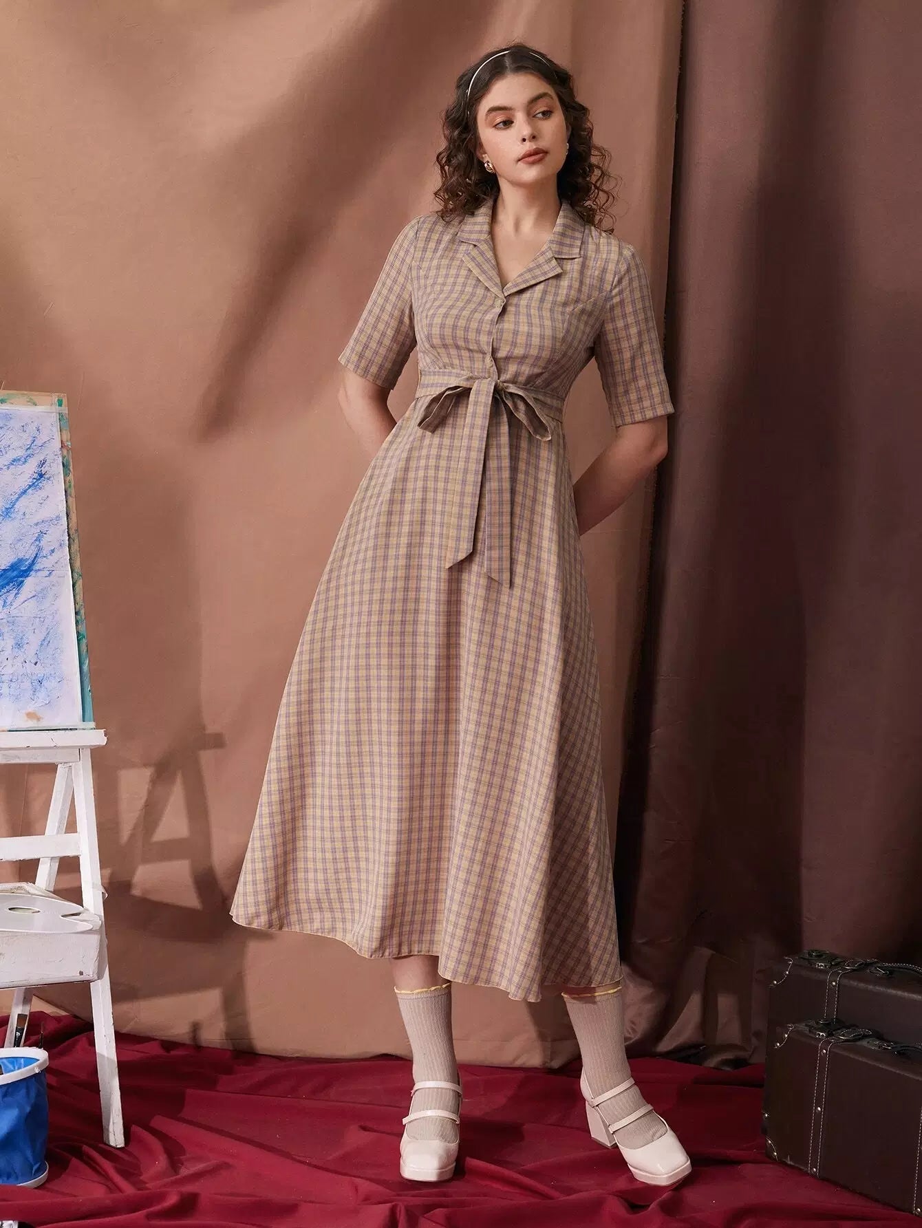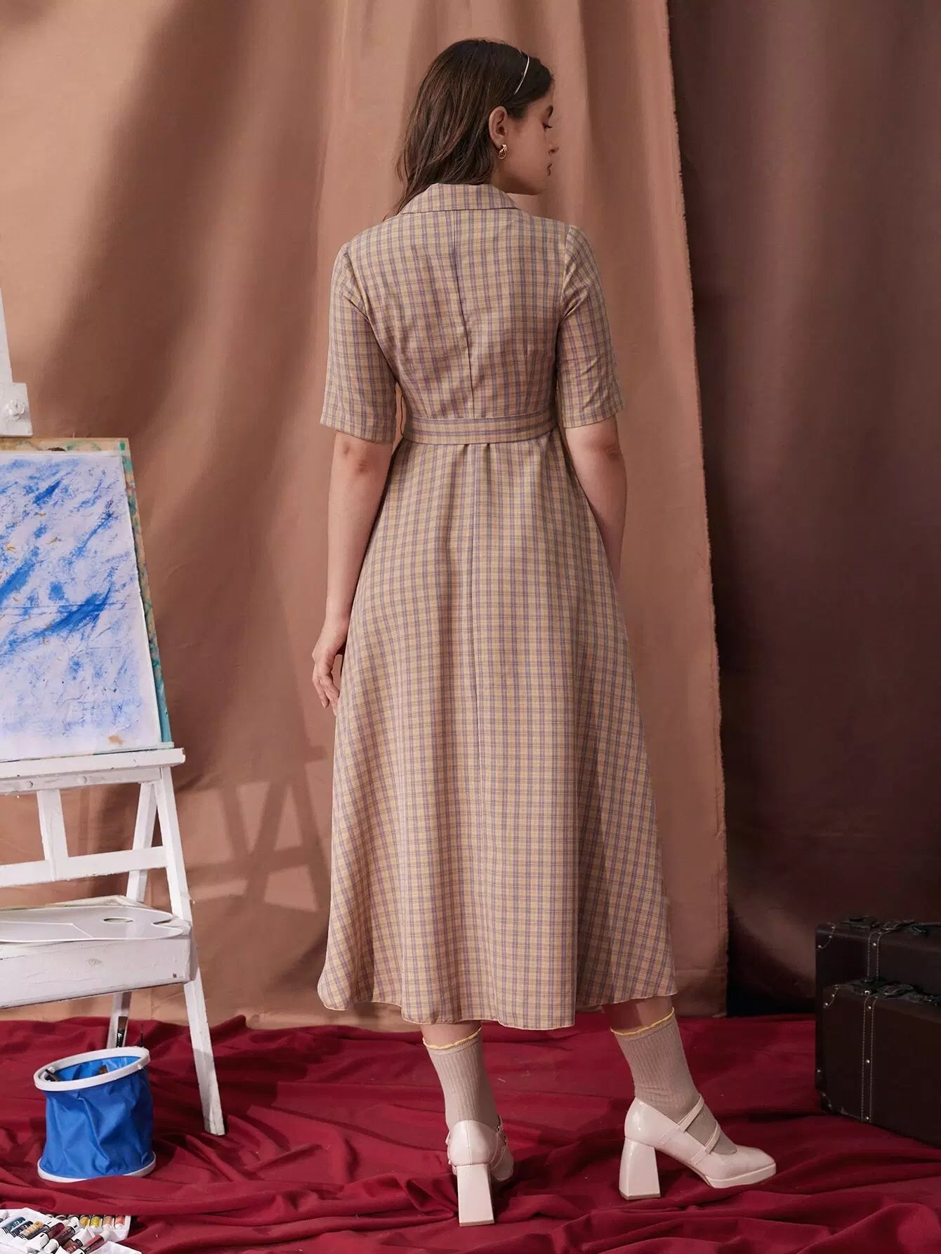 فستان منقوش بياقة طية صدر السترة بدون حزام