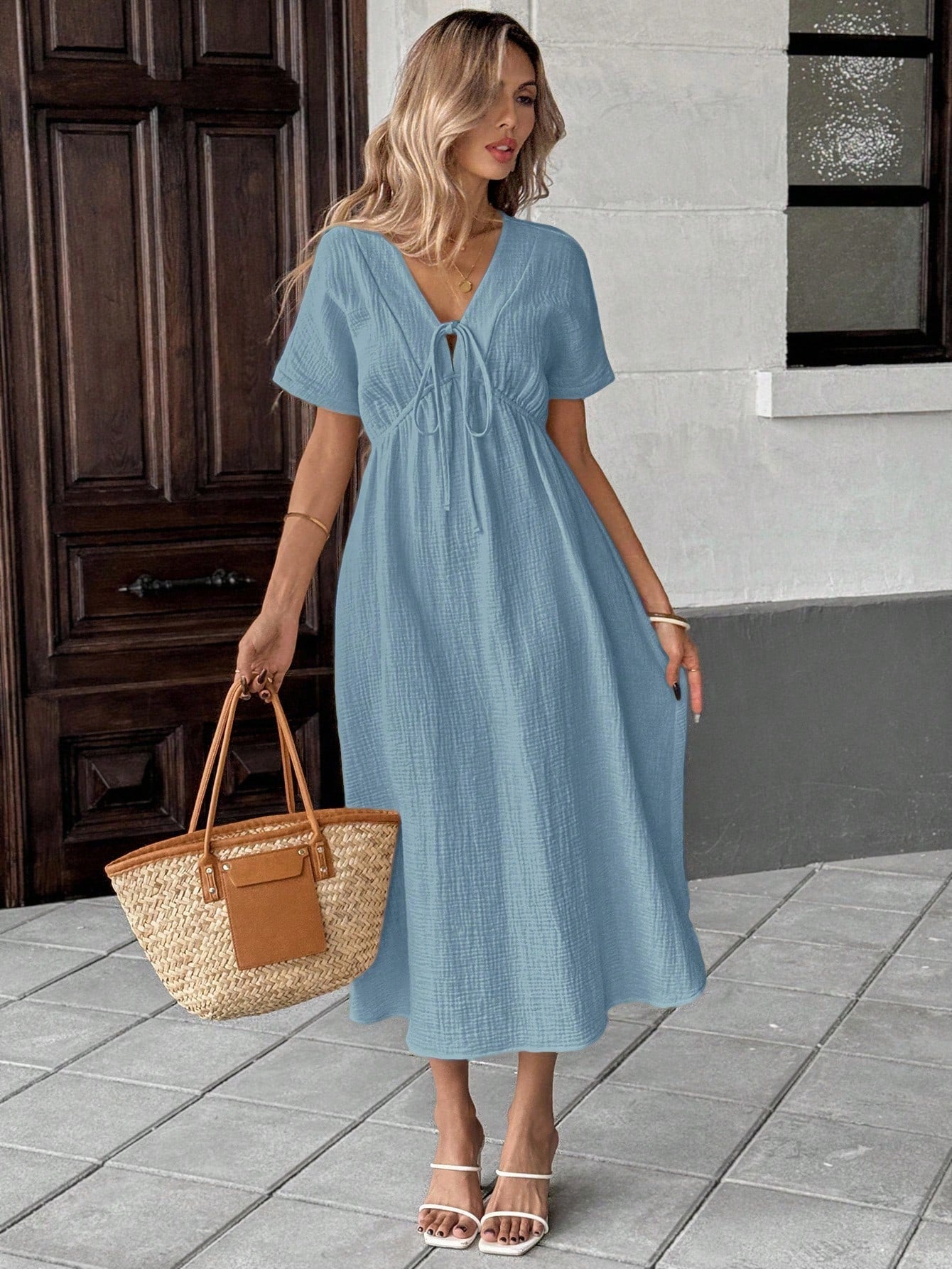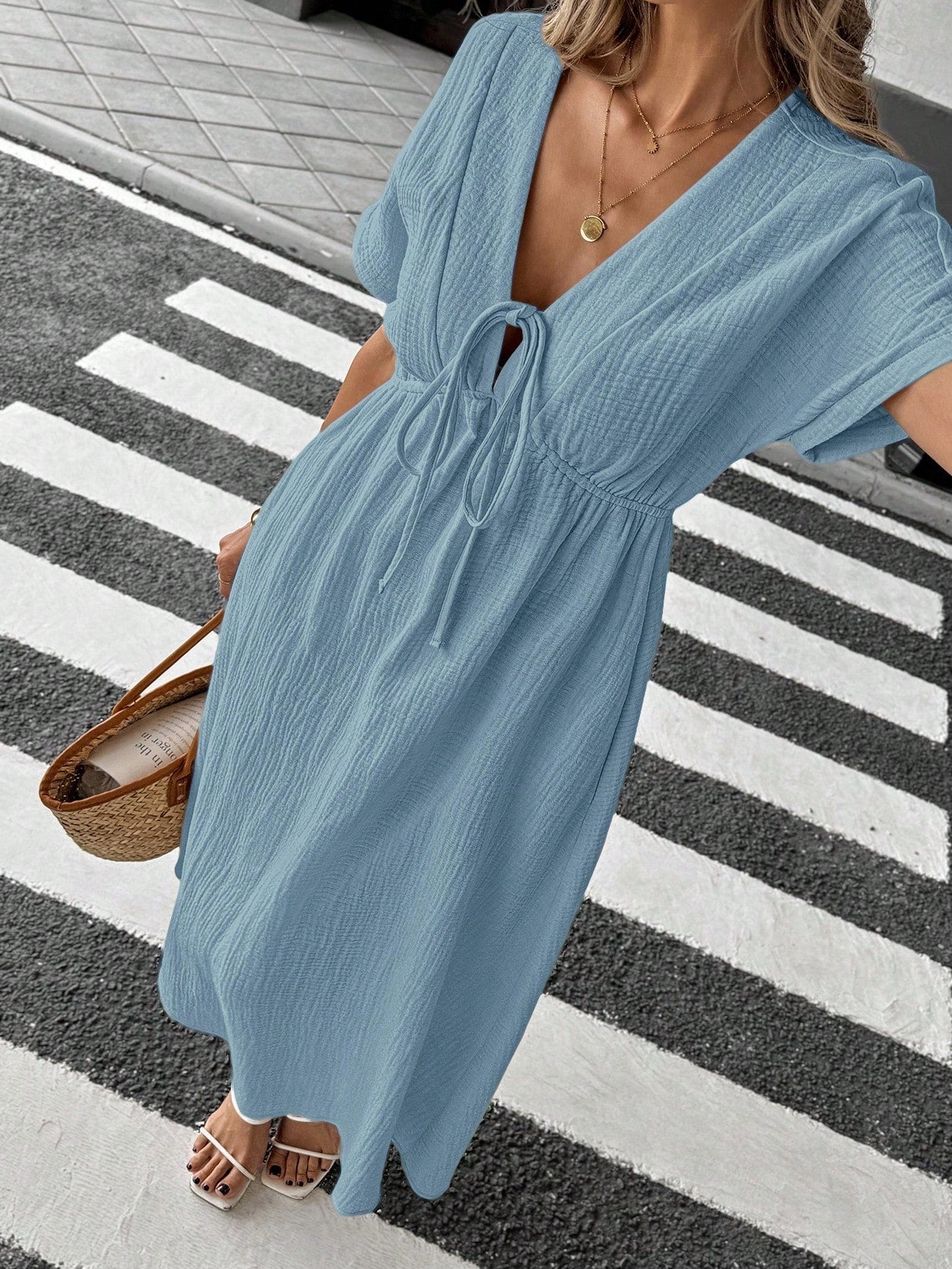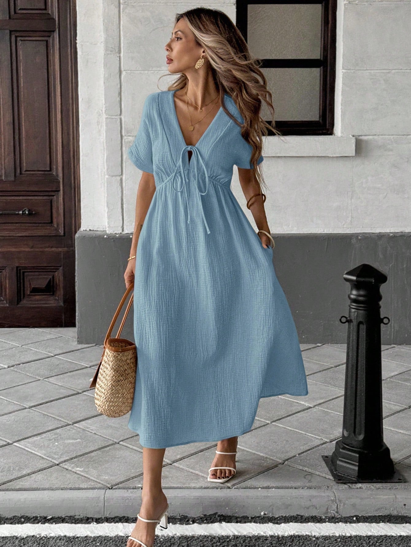 women SHEIN LUNE Apricot Bowknot Casual Midi Dress For Women Baby Blue Dress