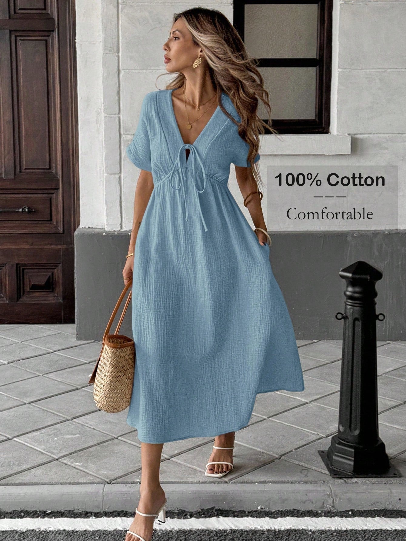 فستان شي إن لون متوسط الطول كاجوال بعقدة فيونكة بلون المشمش للنساء، فستان أزرق فاتح