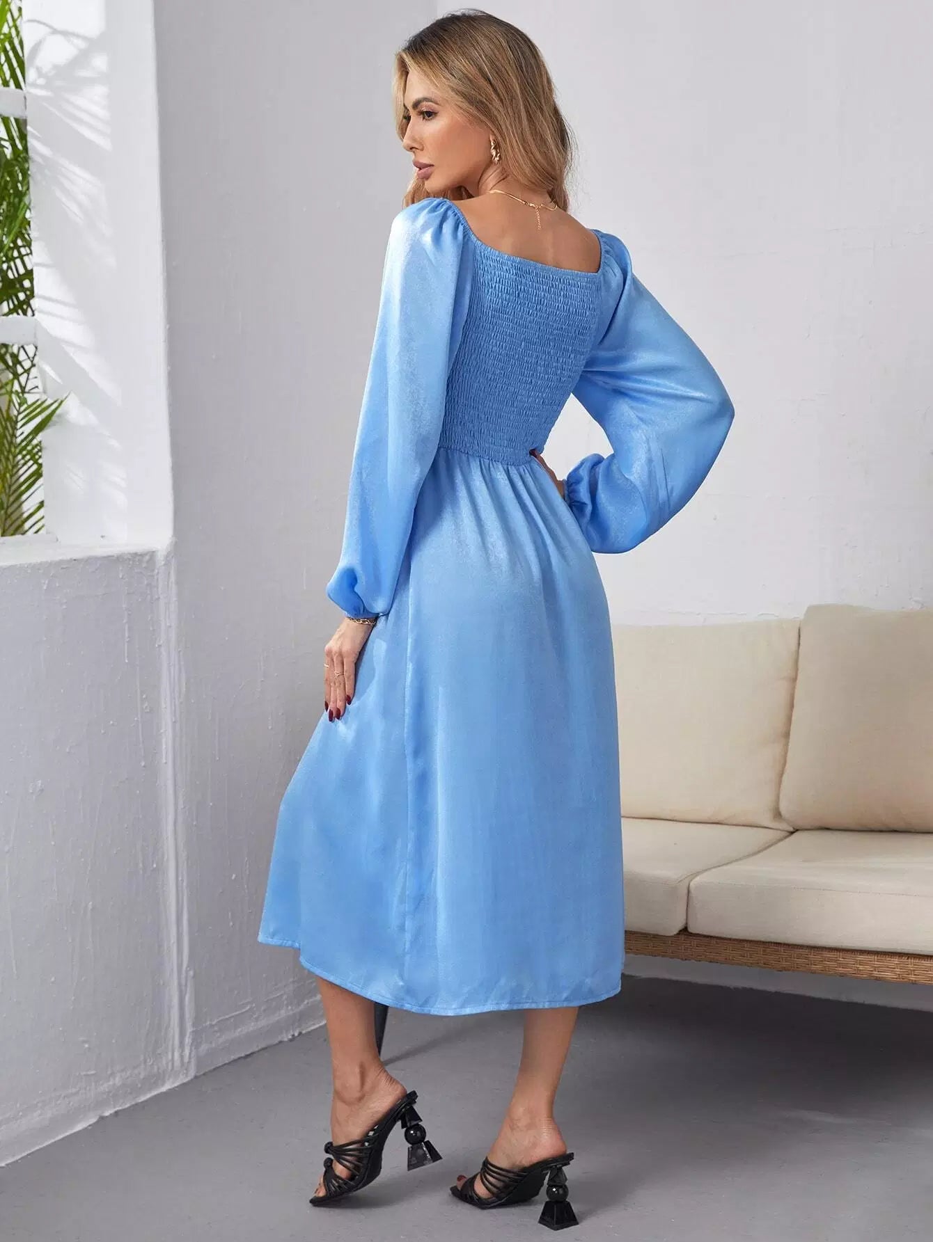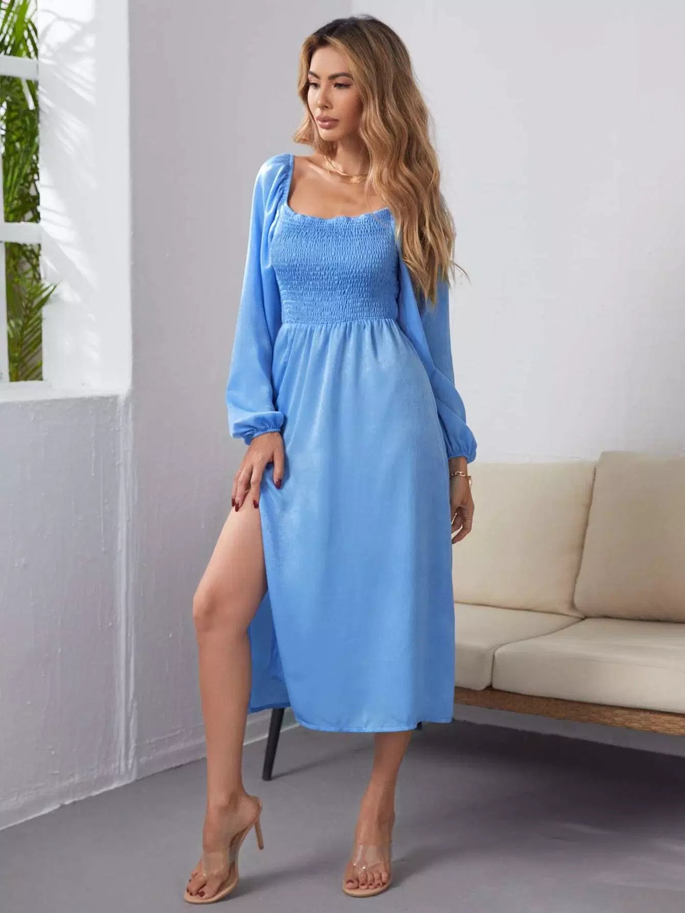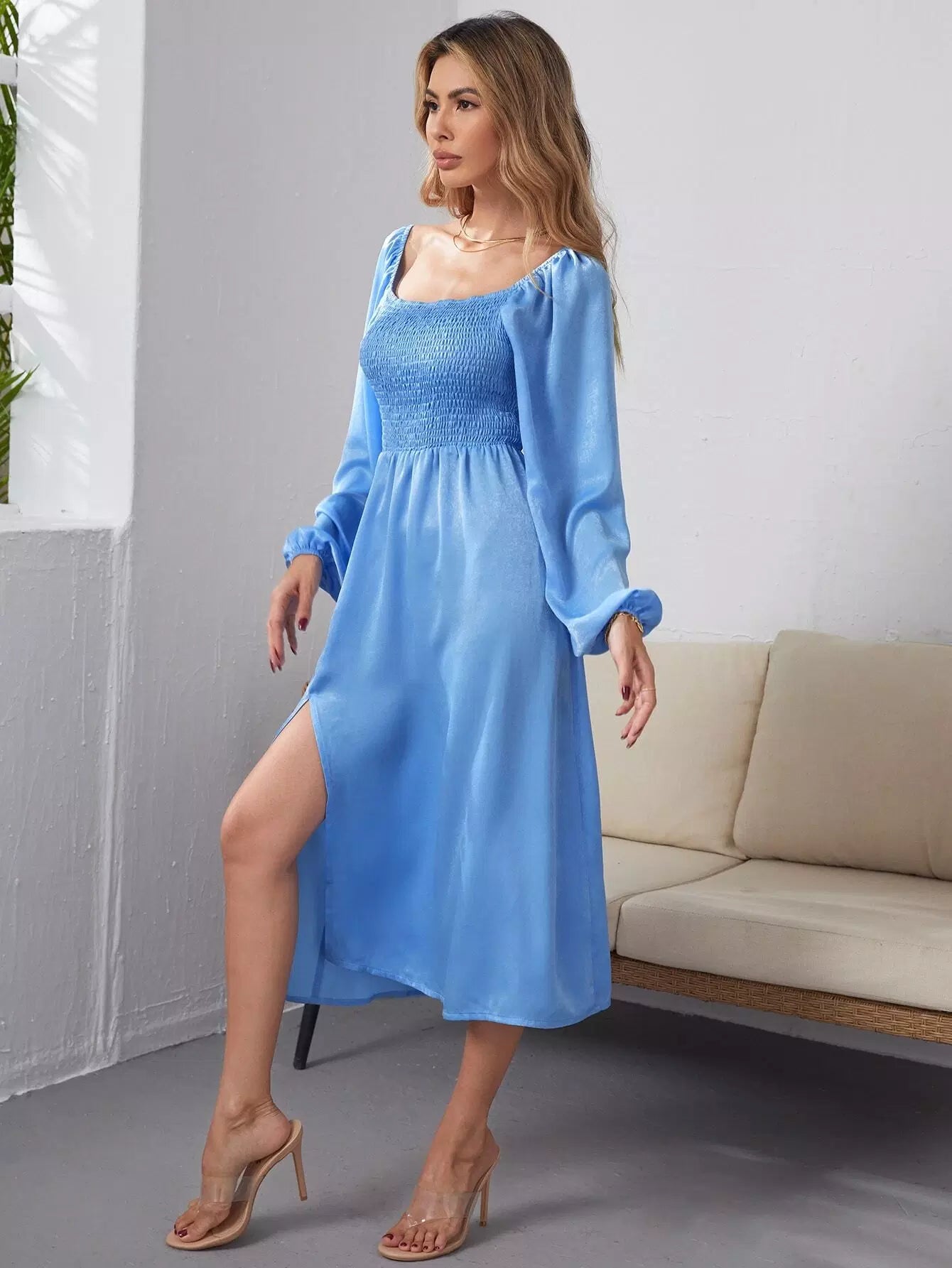 فستان مكشكش بأكمام فانوس وفتحة فخذ