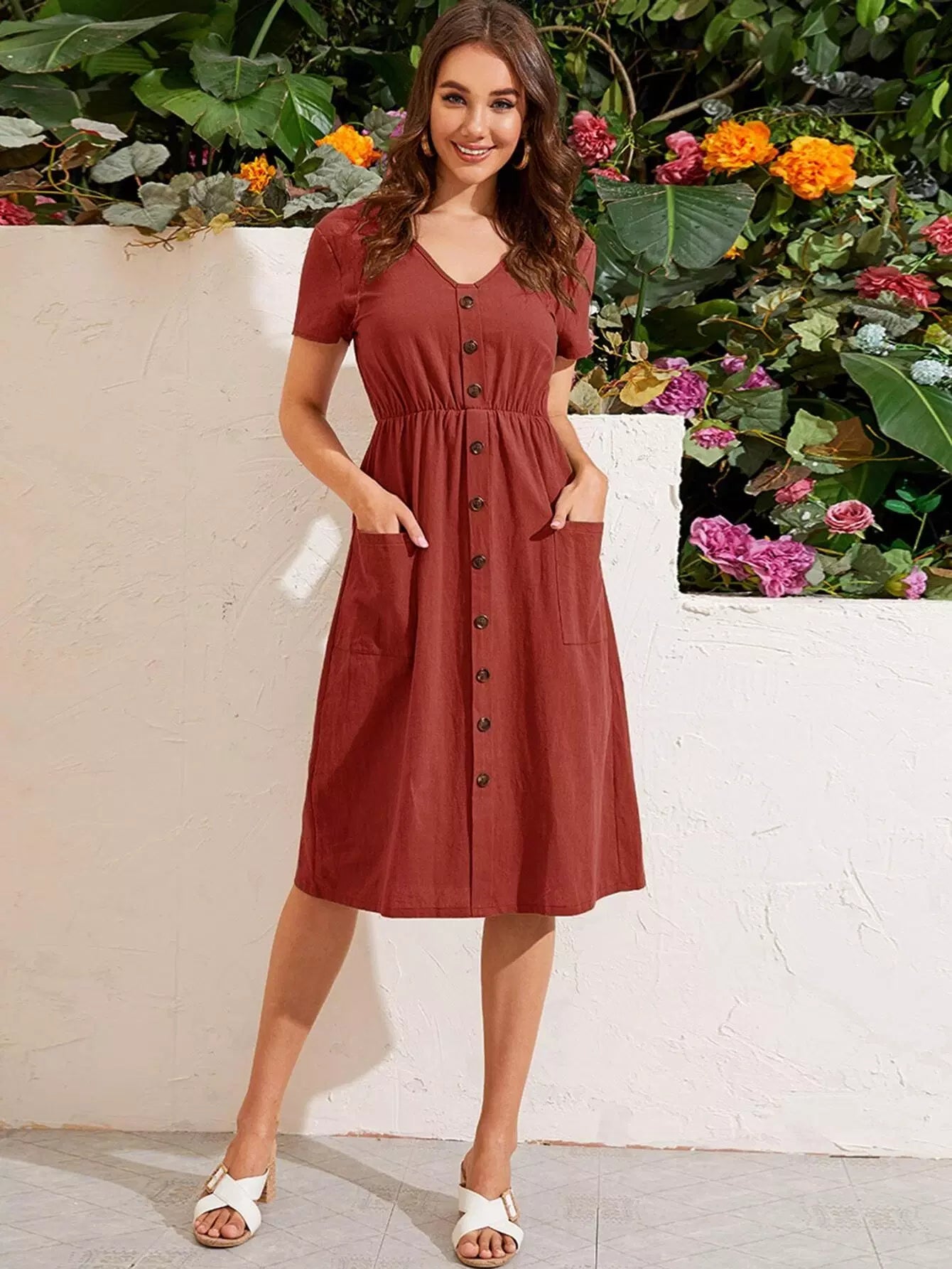 فستان سادة بتفاصيل جيب أمامي بأزرار سادة