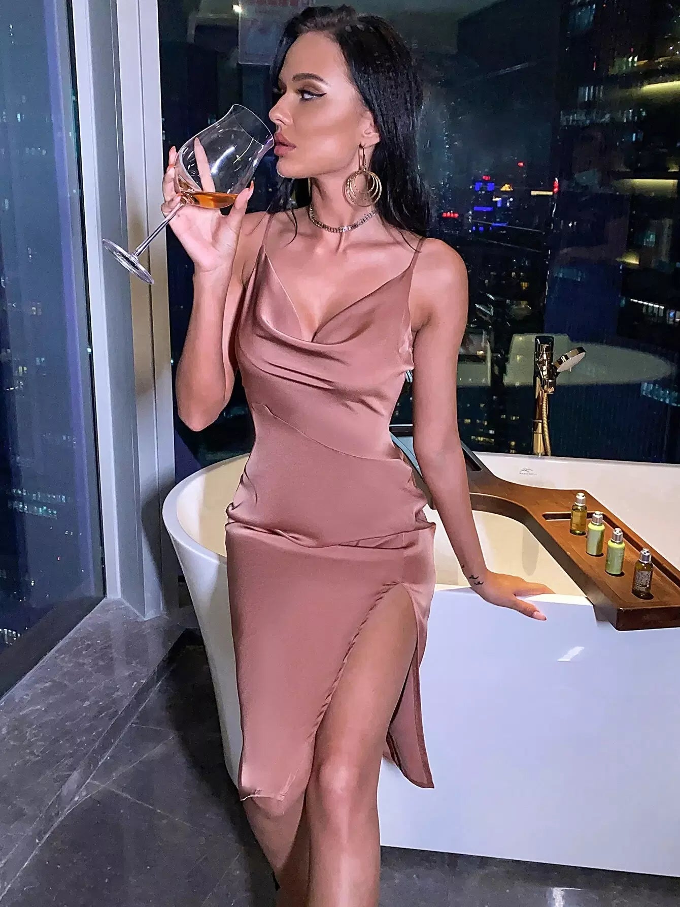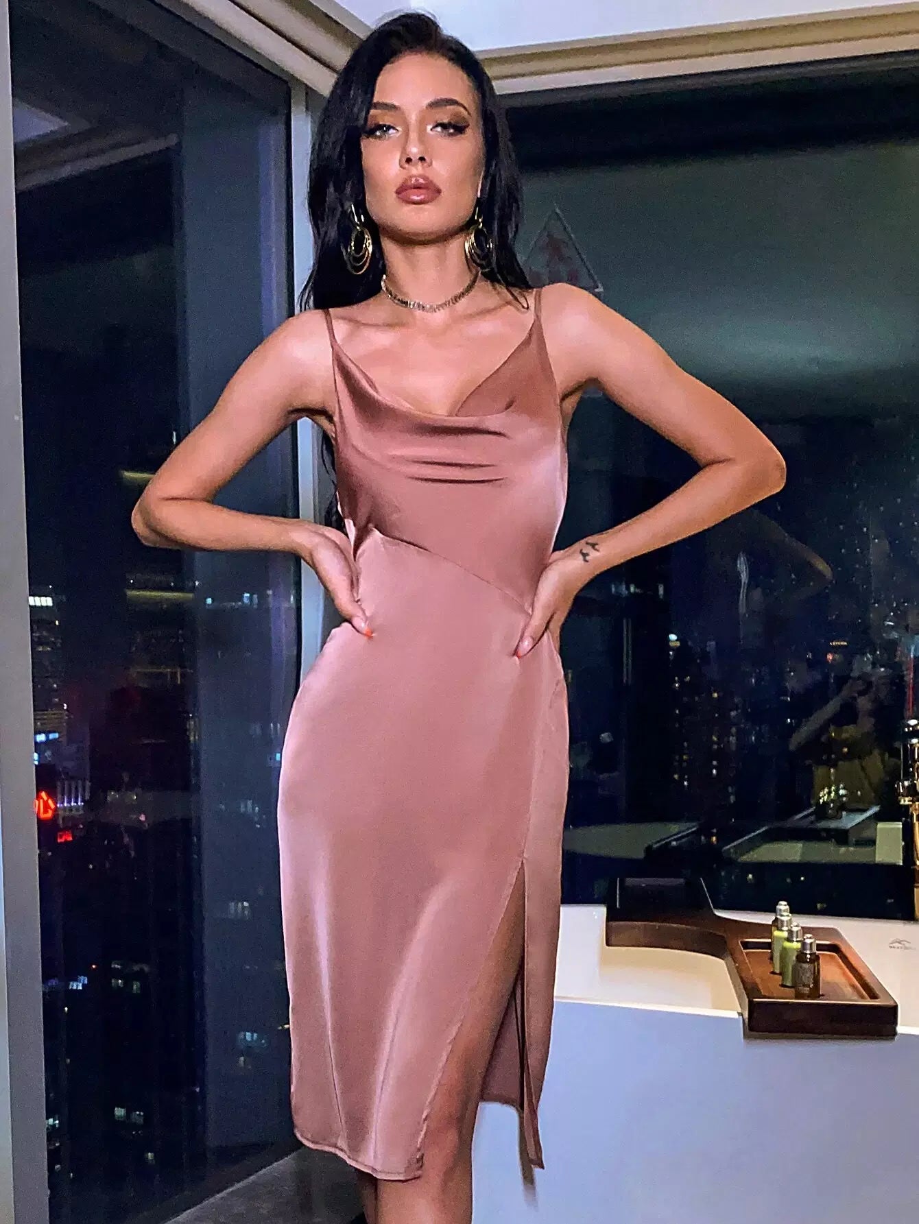 فستان ساتان كامي برقبة من الساتان برقبة منقسمة على الفخذين