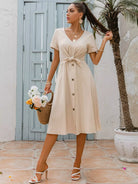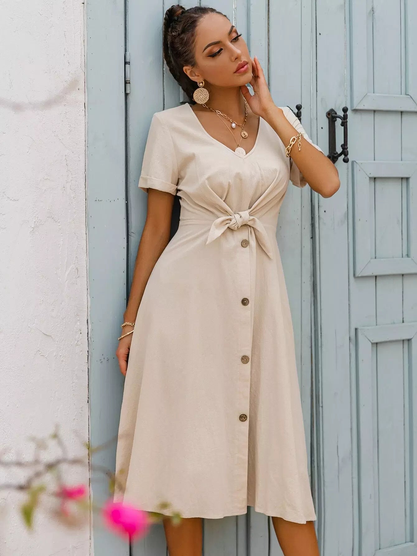 فستان سادة بربطة عنق أمامي بأزرار أمامية