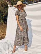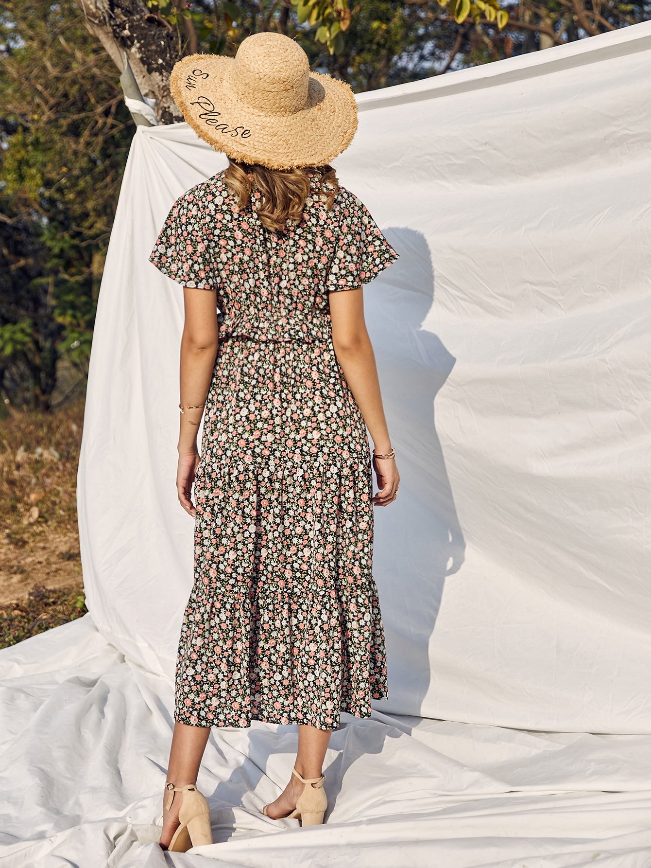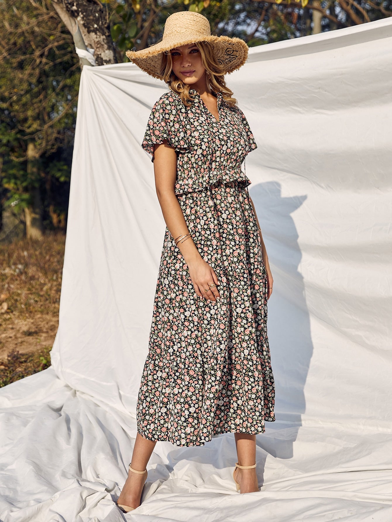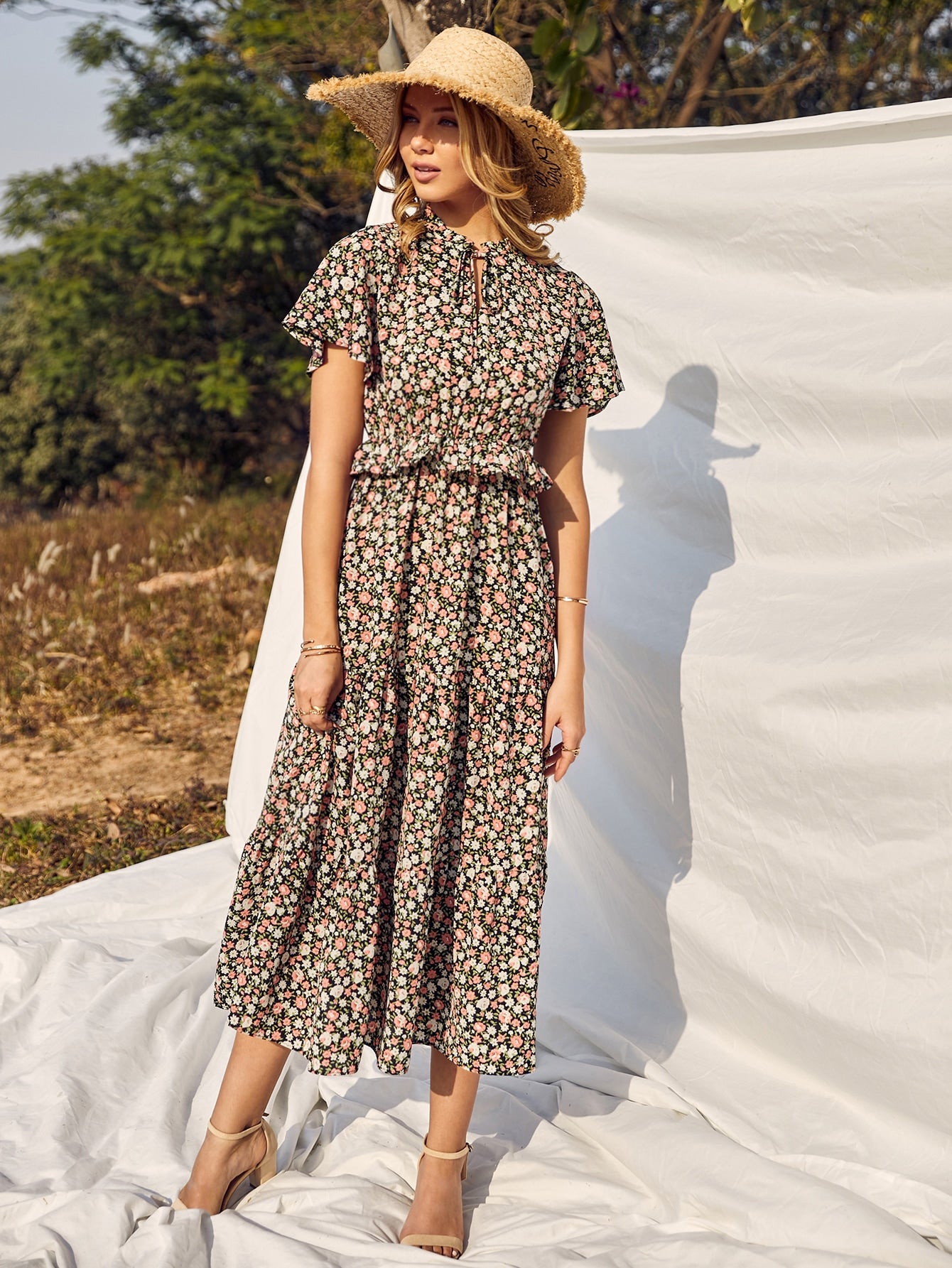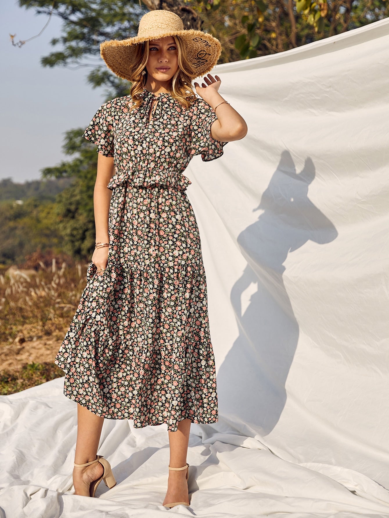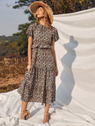 Floral Print Tie Neck Ruffle Trim Dress