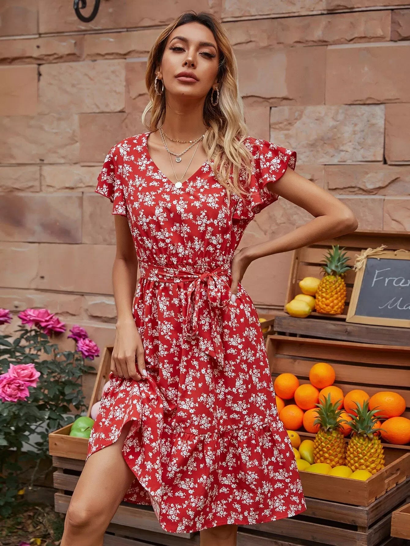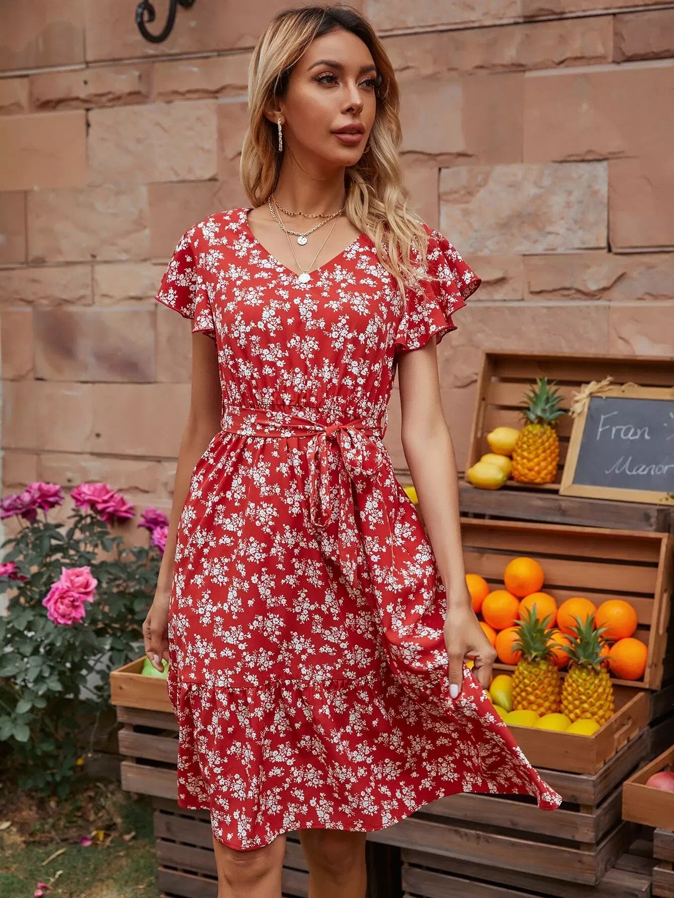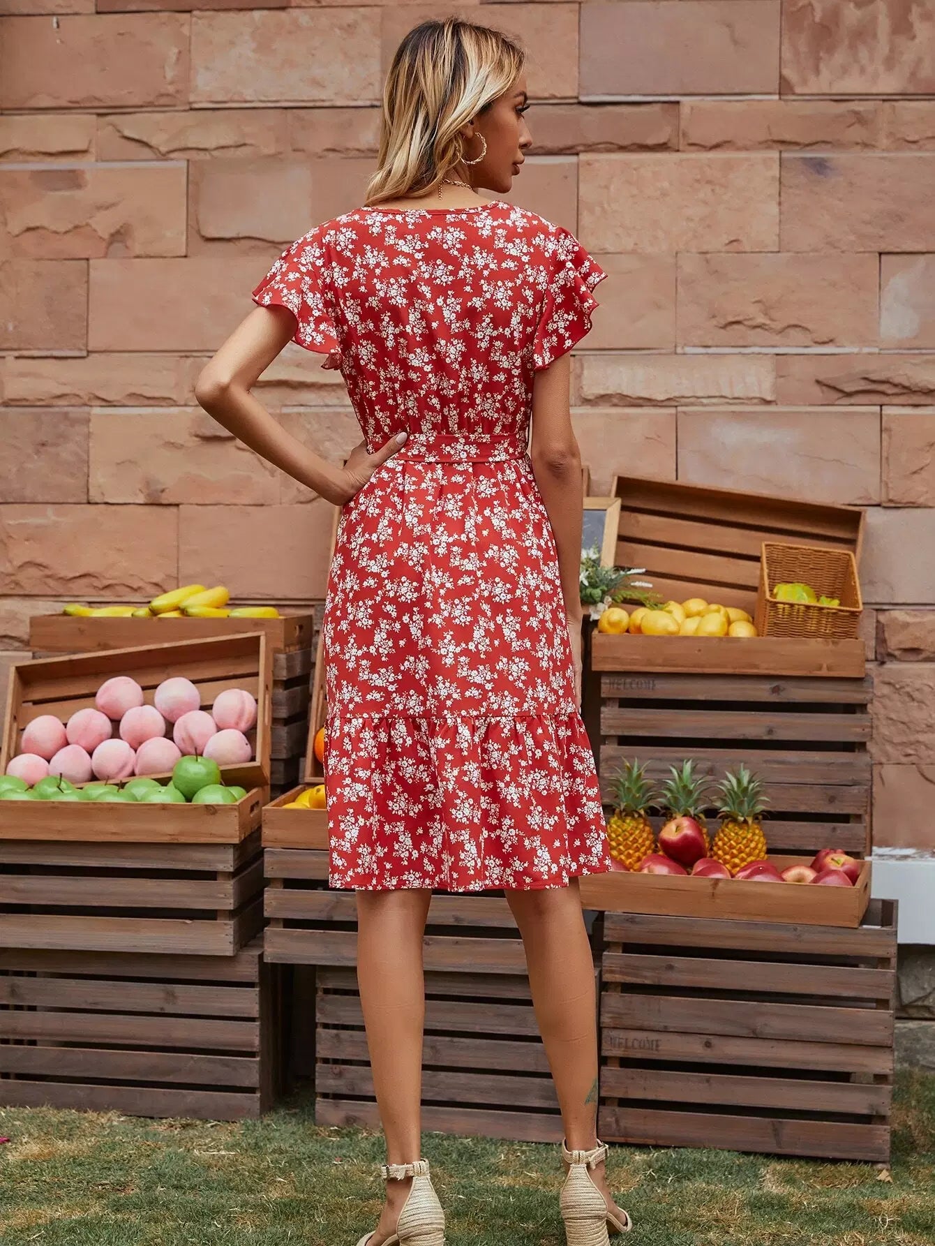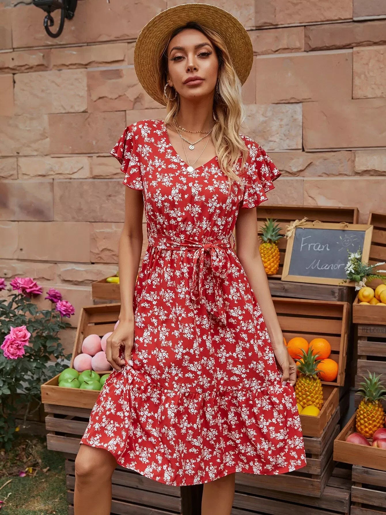 فستان على شكل حرف A بأكمام فراشة وطبعات زهور بالكامل بدون حزام