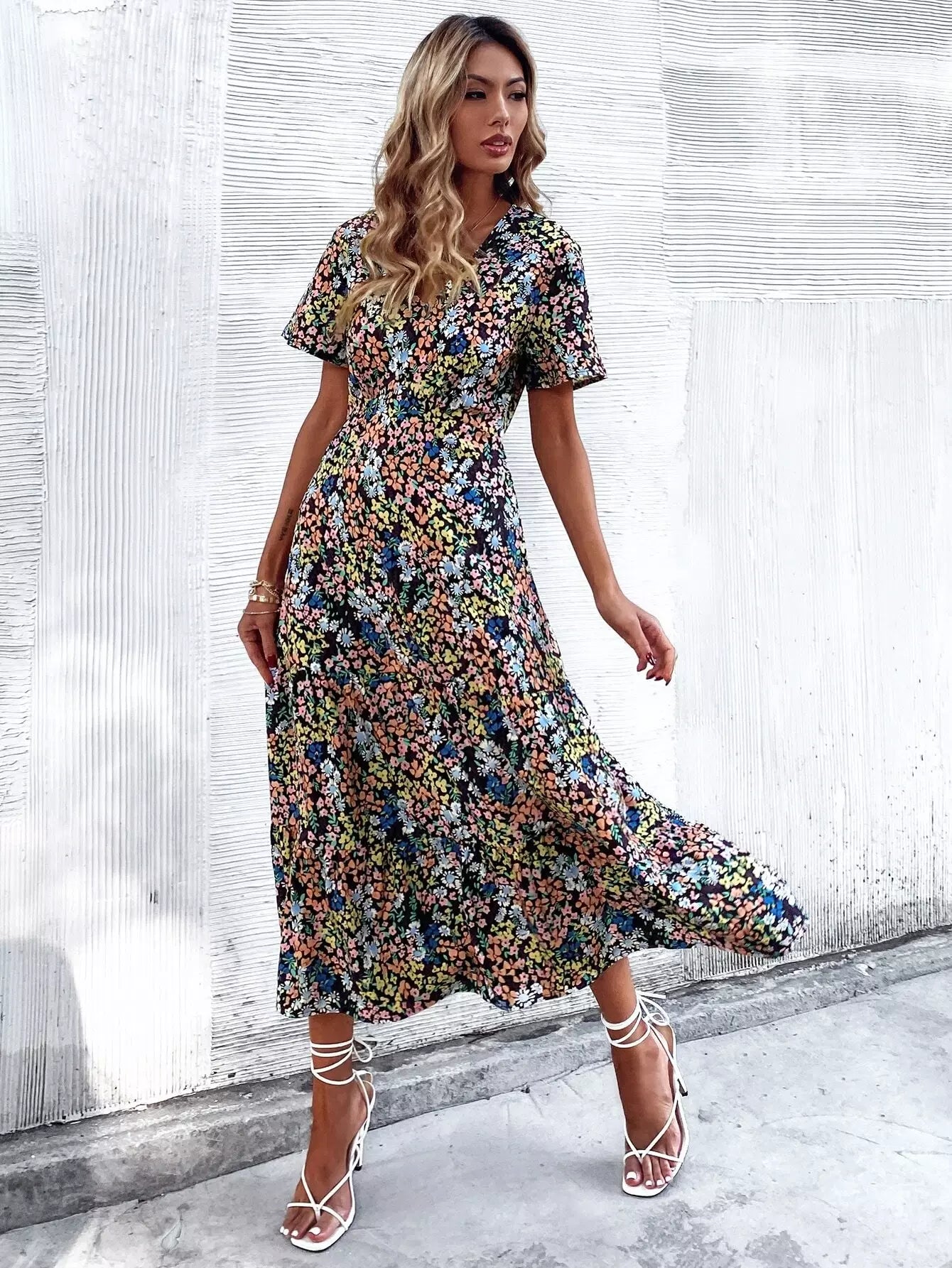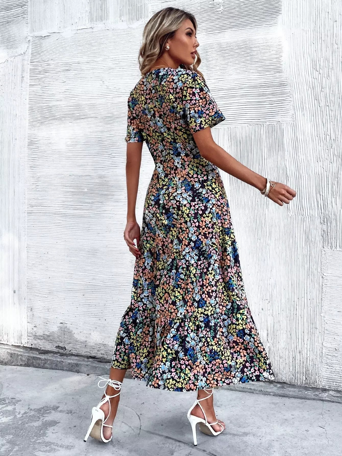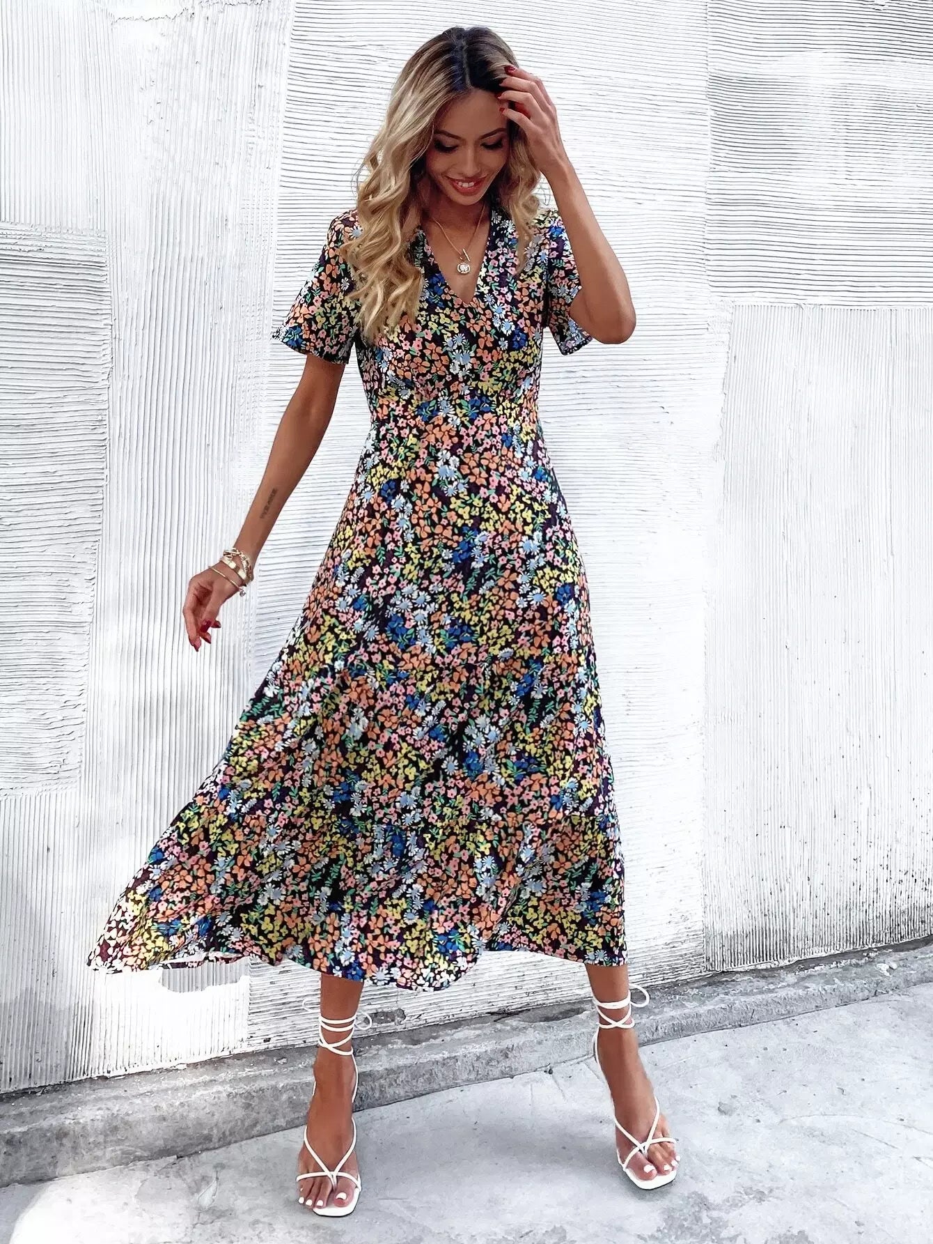 فستان بحافة كشكش مطبوع بالكامل بطبعة زهور على شكل حرف A