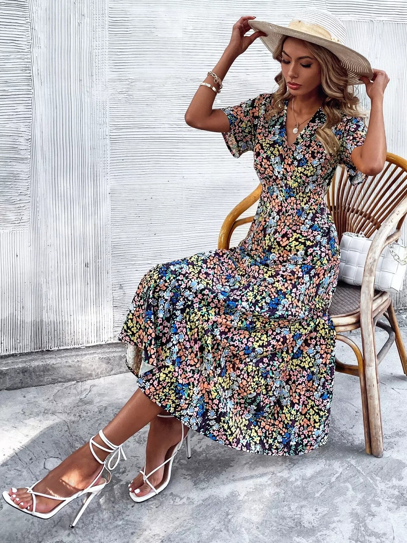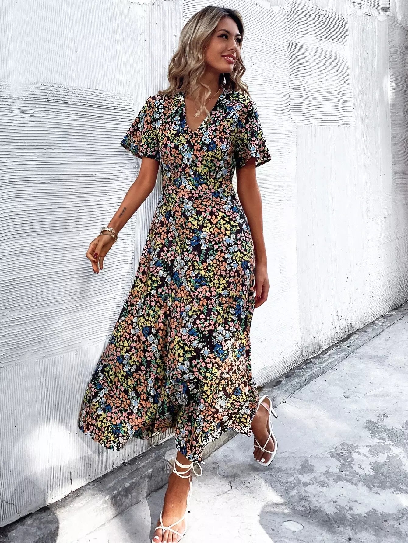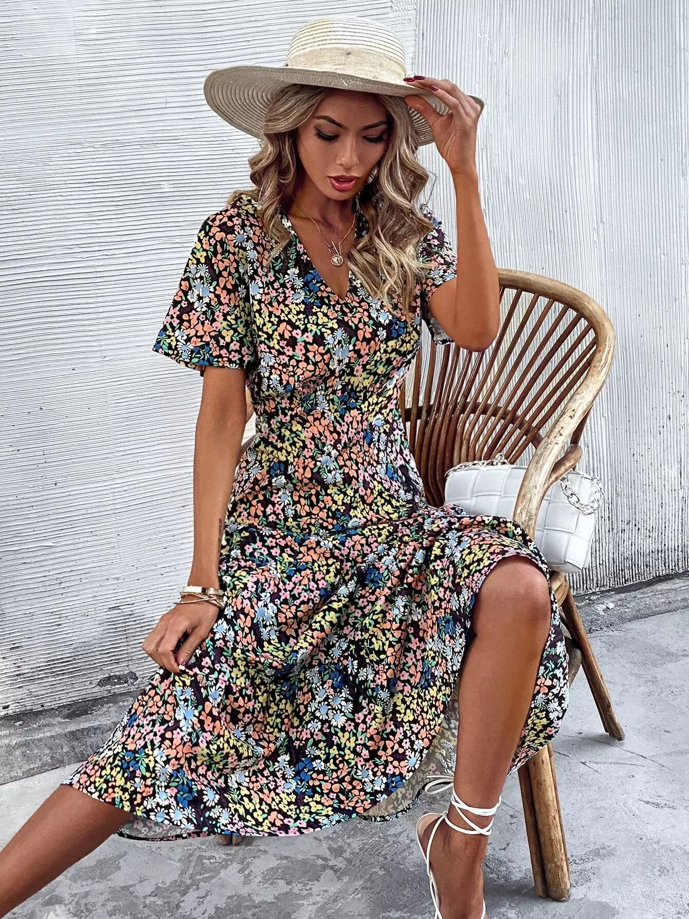 فستان بحافة كشكش مطبوع بالكامل بطبعة زهور على شكل حرف A