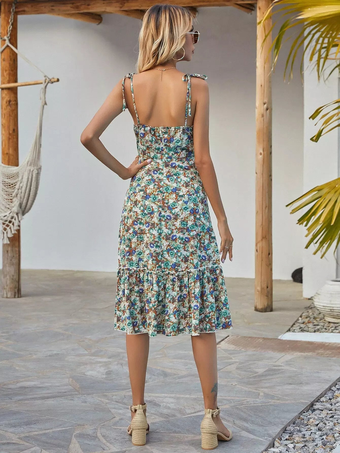النساء - فستان كامي على الكتف بعقدة من الزهور بالكامل