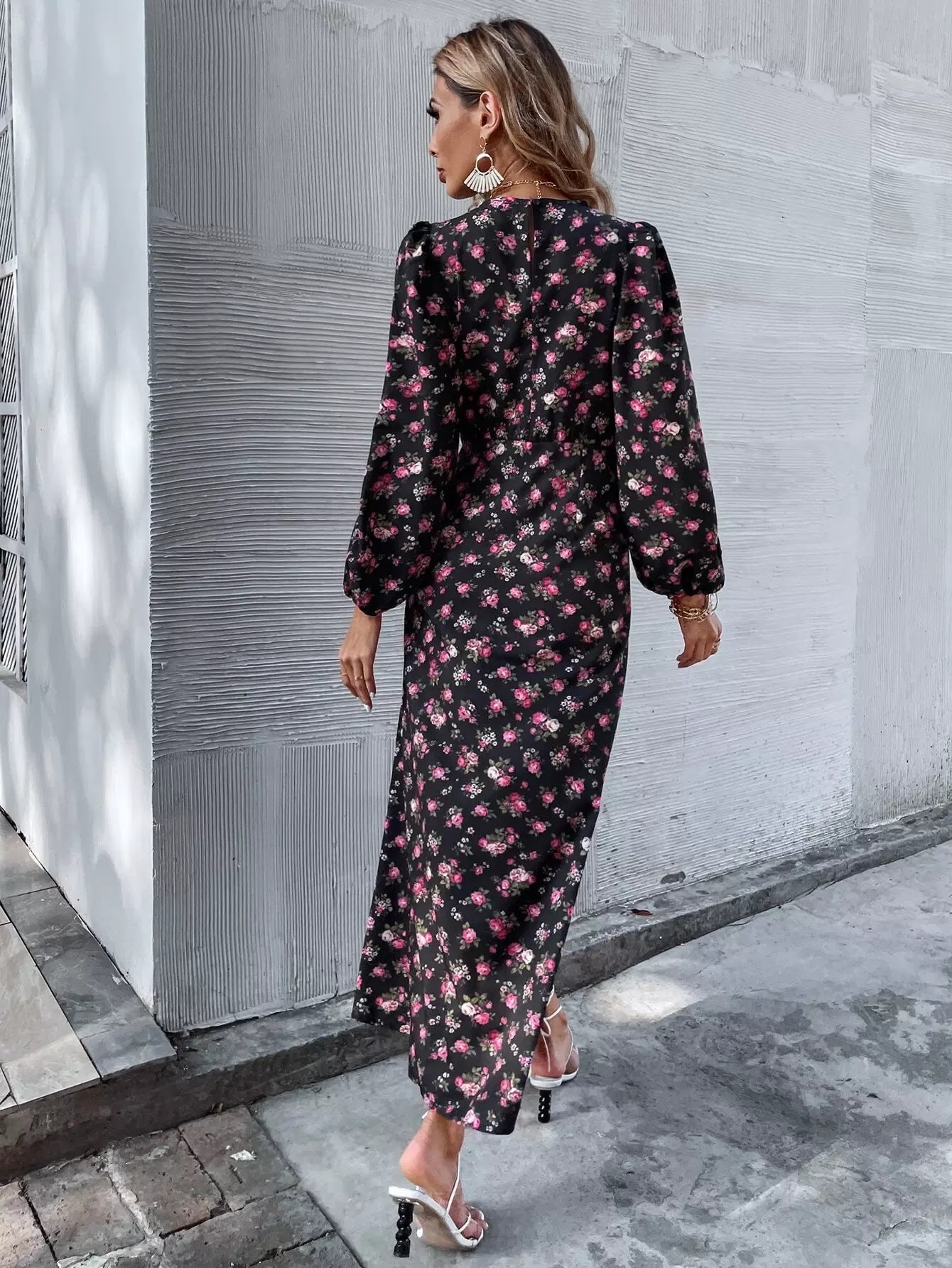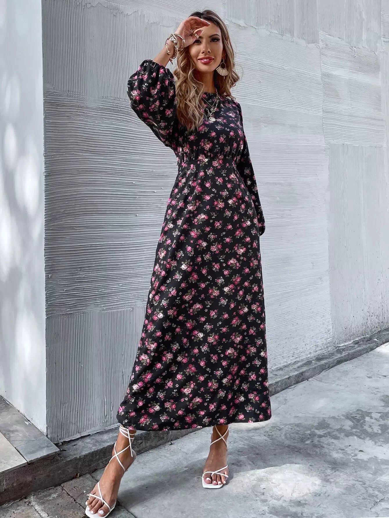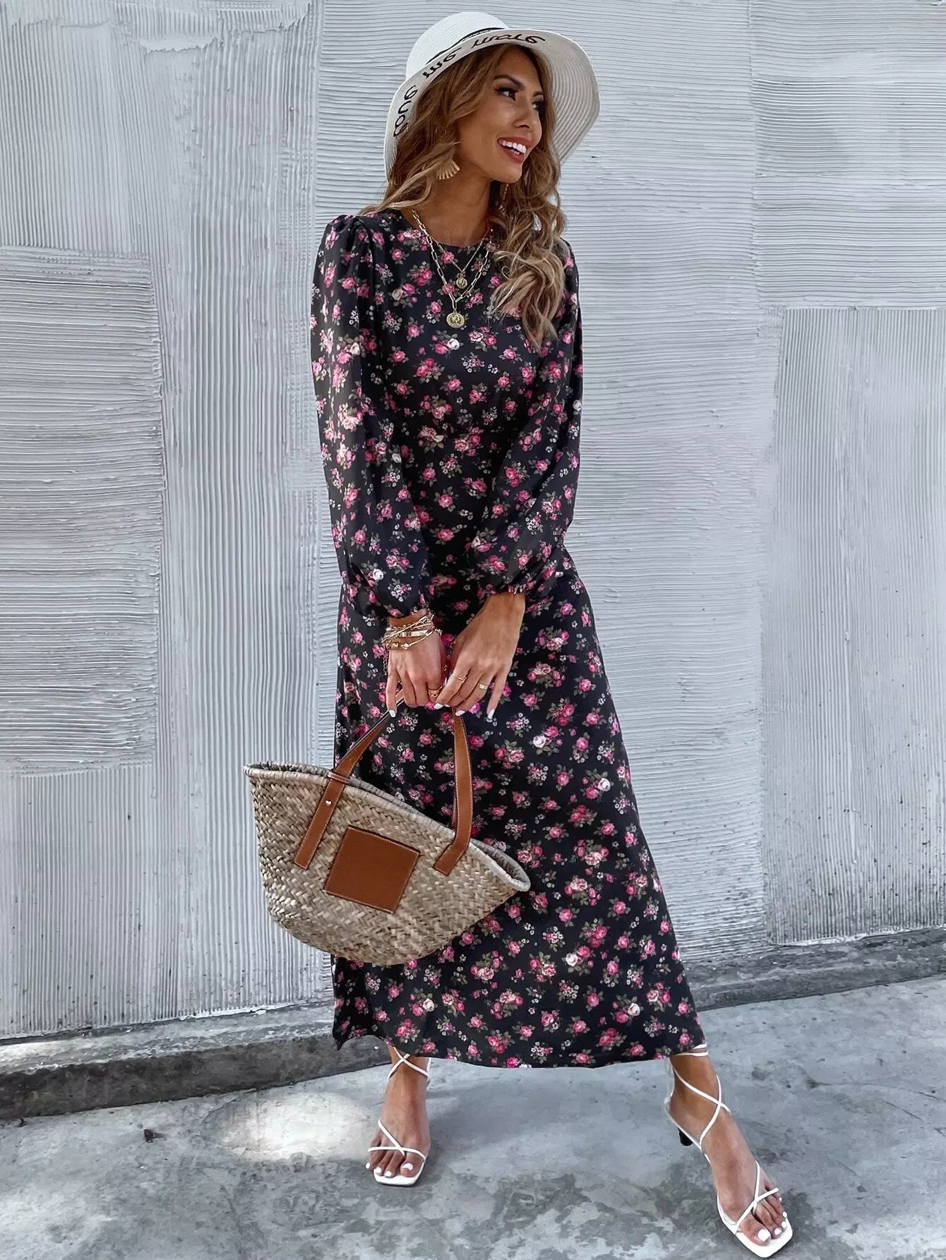 فستان بأكمام منفوشة بطبعة زهور بالكامل