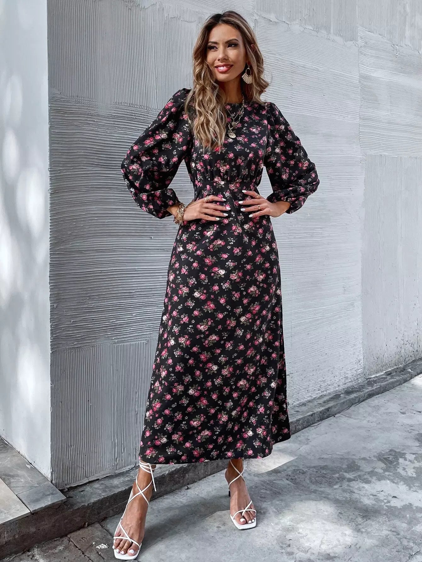 النساء - فستان بأكمام منتفخة وطبعات زهور