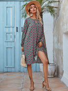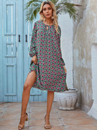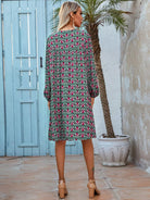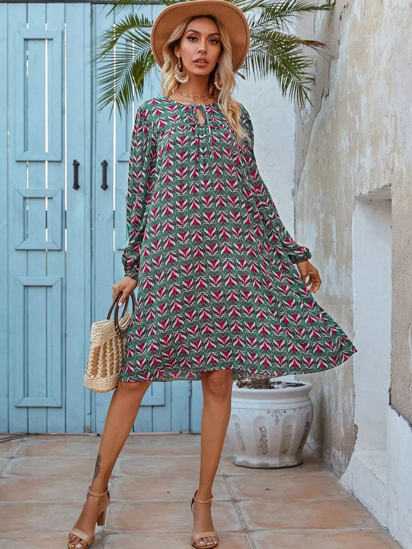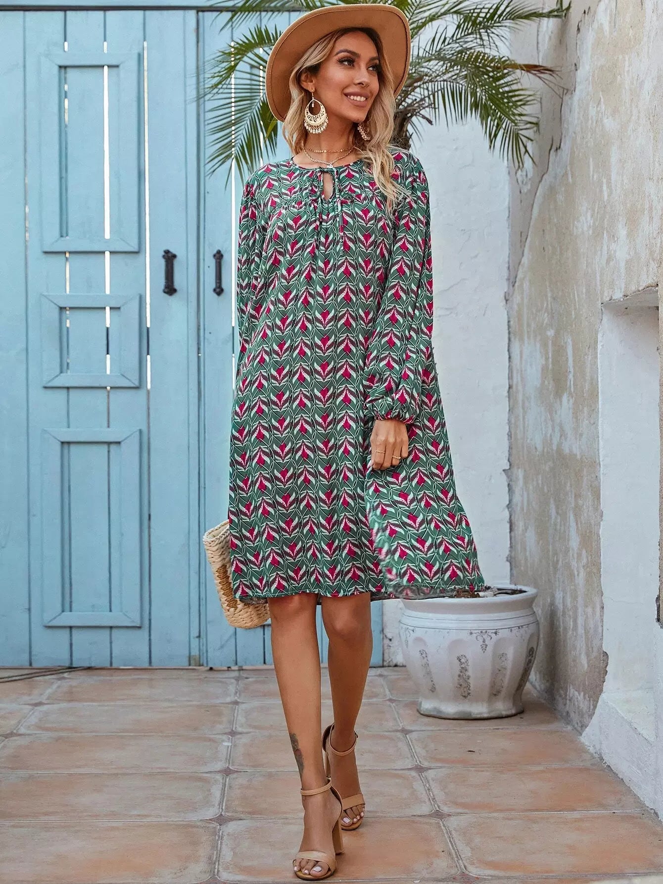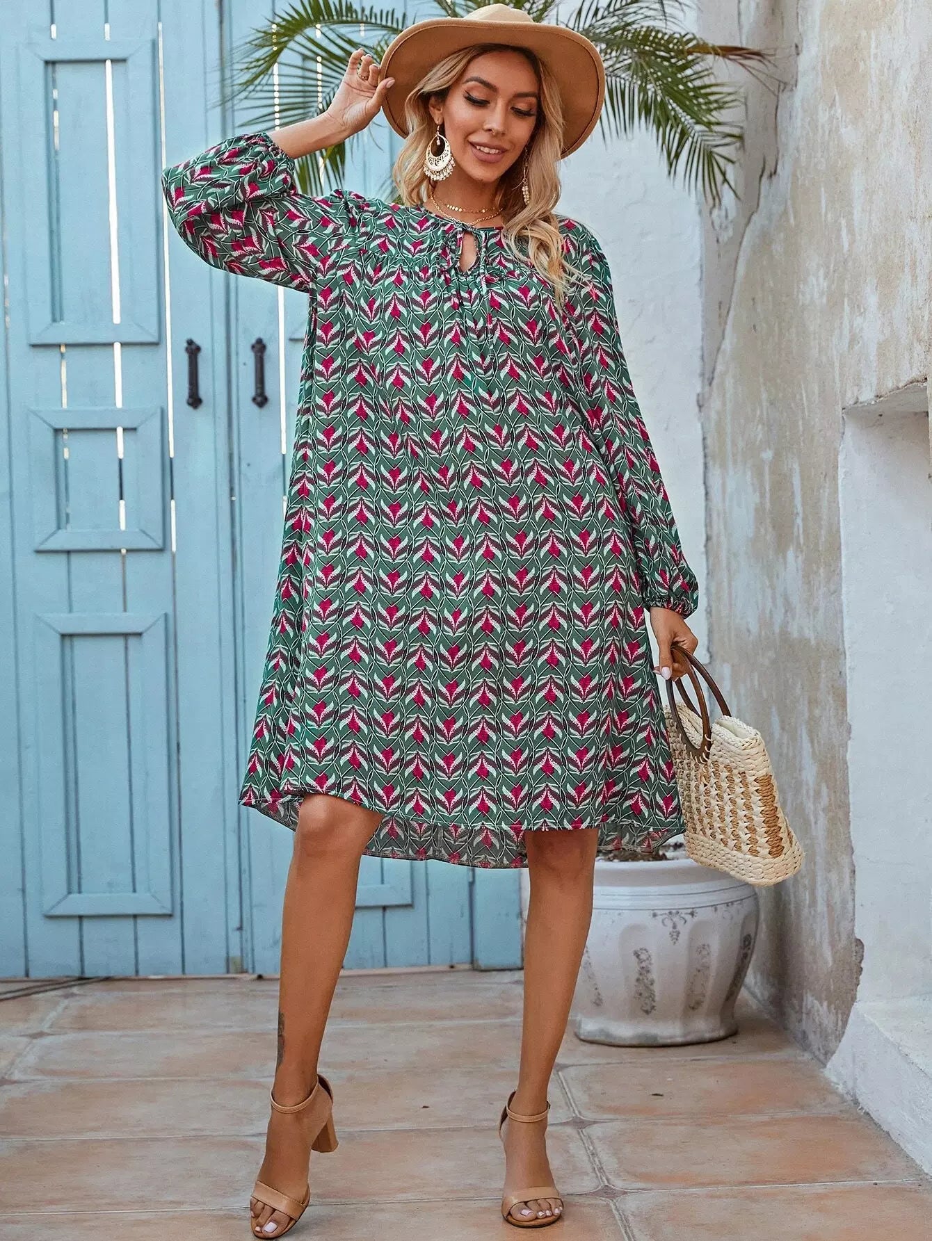 فستان مزين بطبعة زهور مطبوع بالكامل على شكل ربطة عنق أمامية
