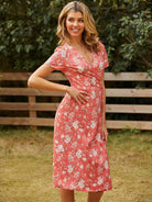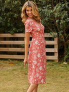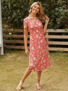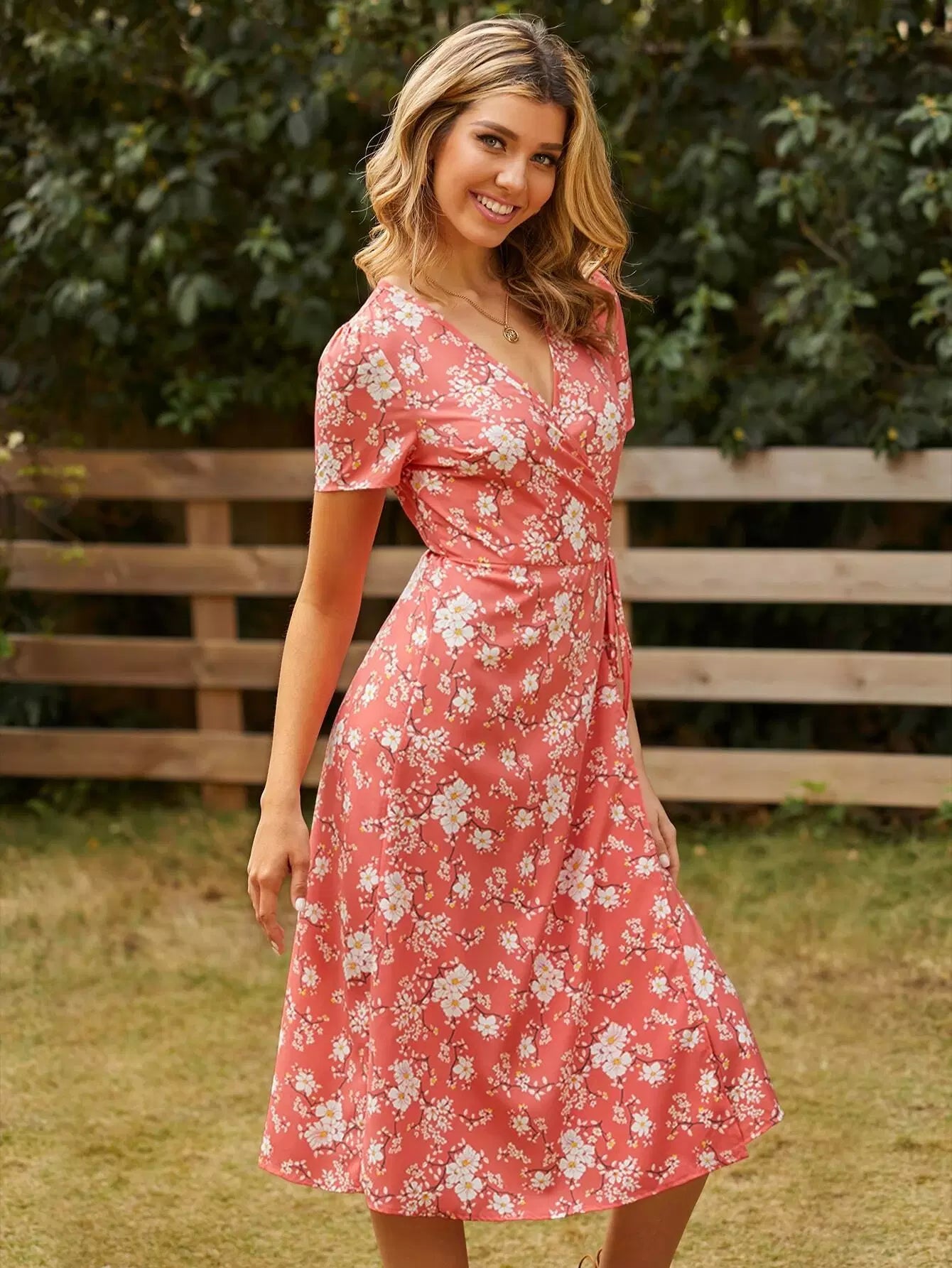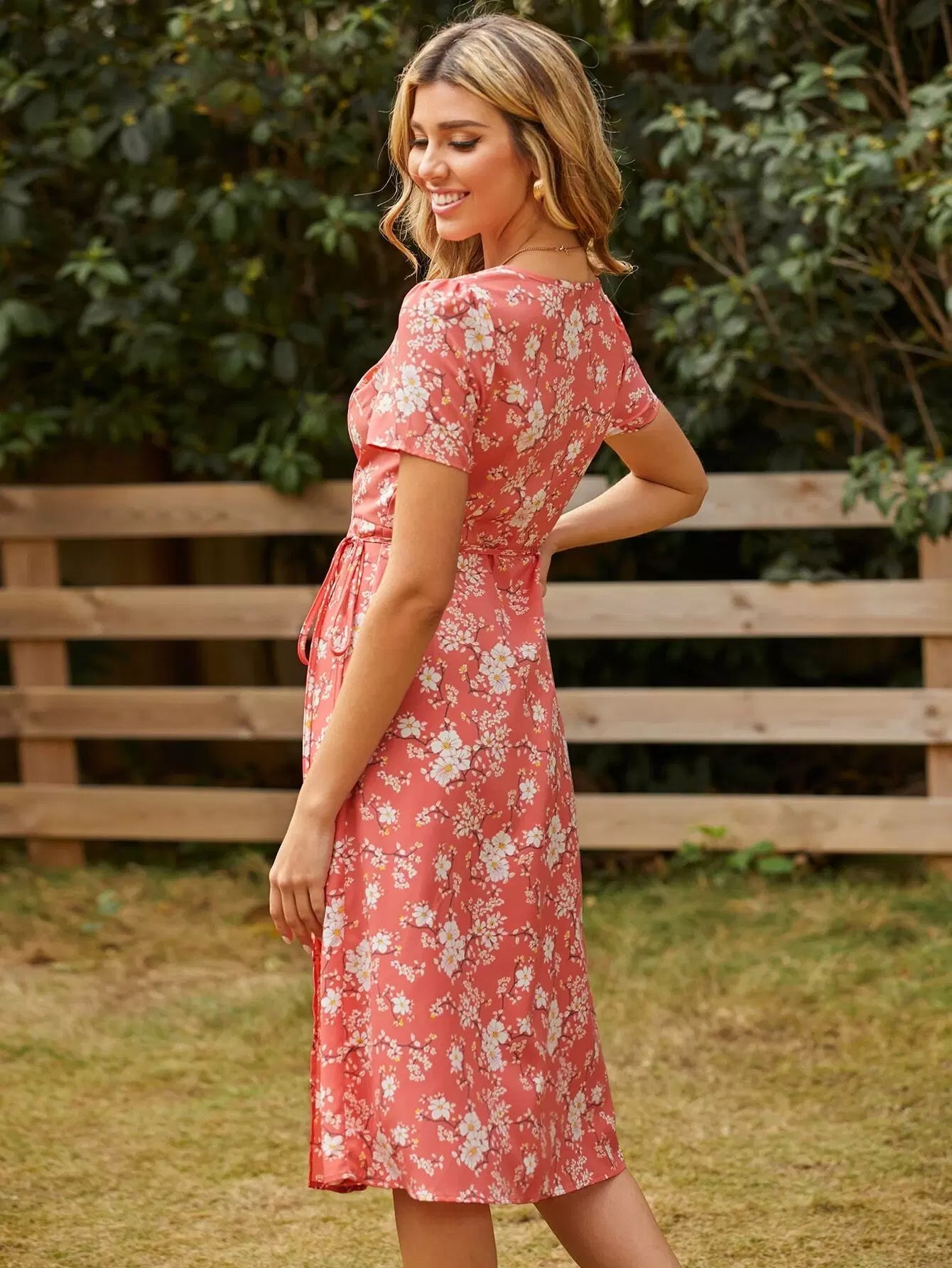 فستان ملفوف بطبعة زهور مطبوع على الجانب بربطة عنق فوقه