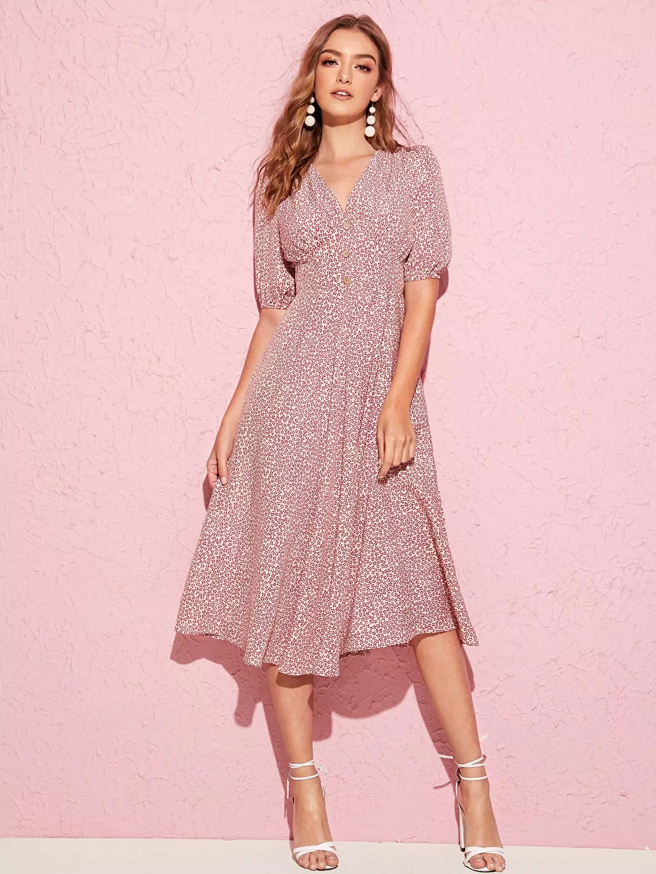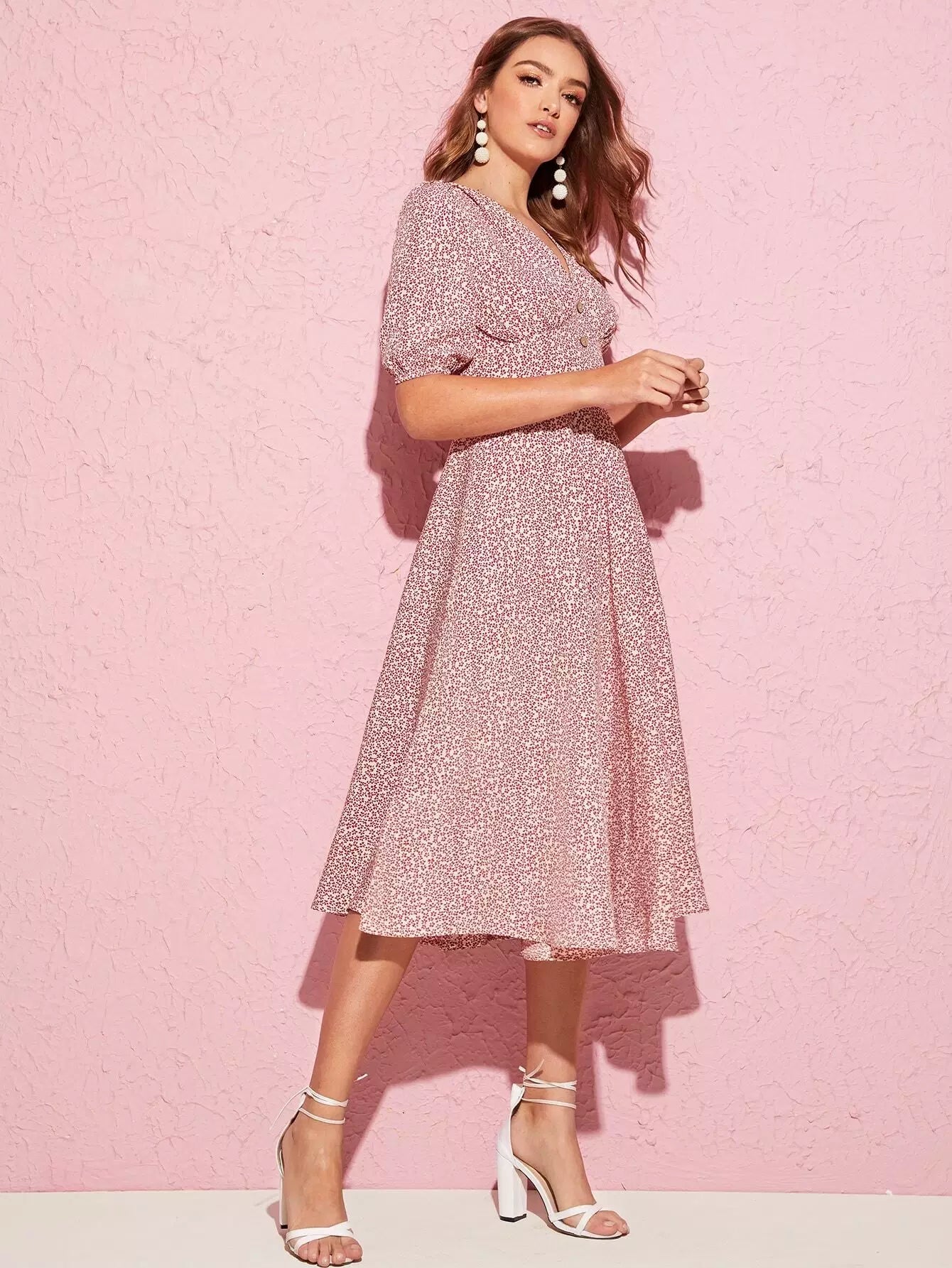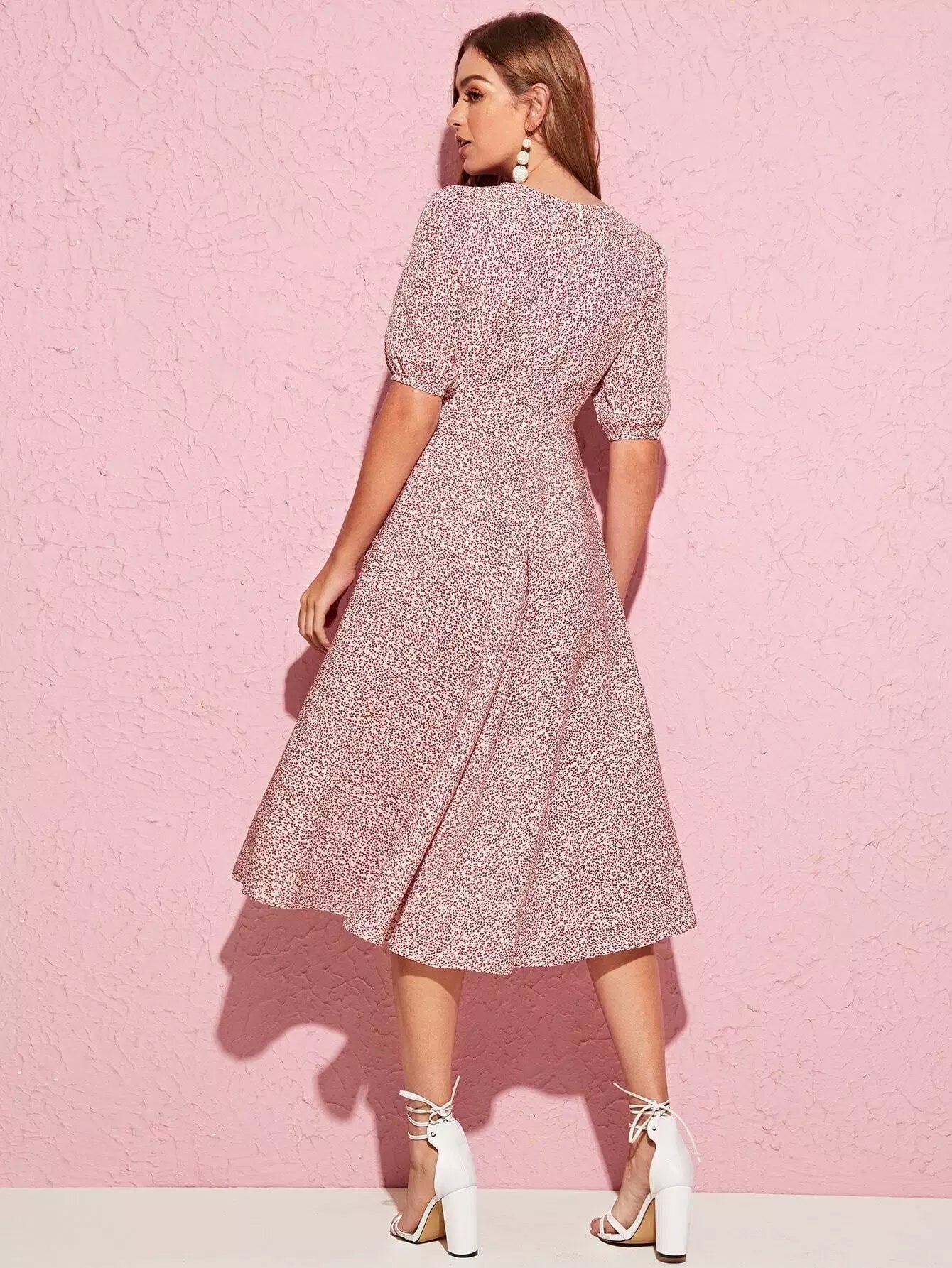 فستان مطبوع بالكامل بأكمام منفوشة بأزرار بأكمام منفوشة