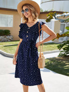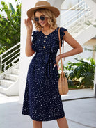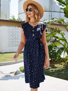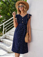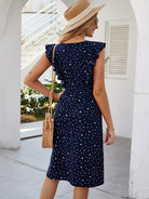 الملابس - فستان برباط ذاتي ذو حواف مكشكشة ومطبوع بالكامل