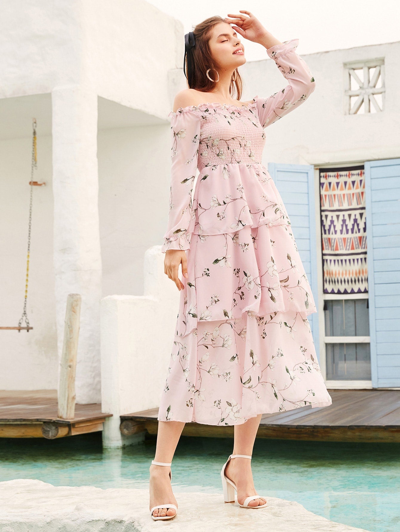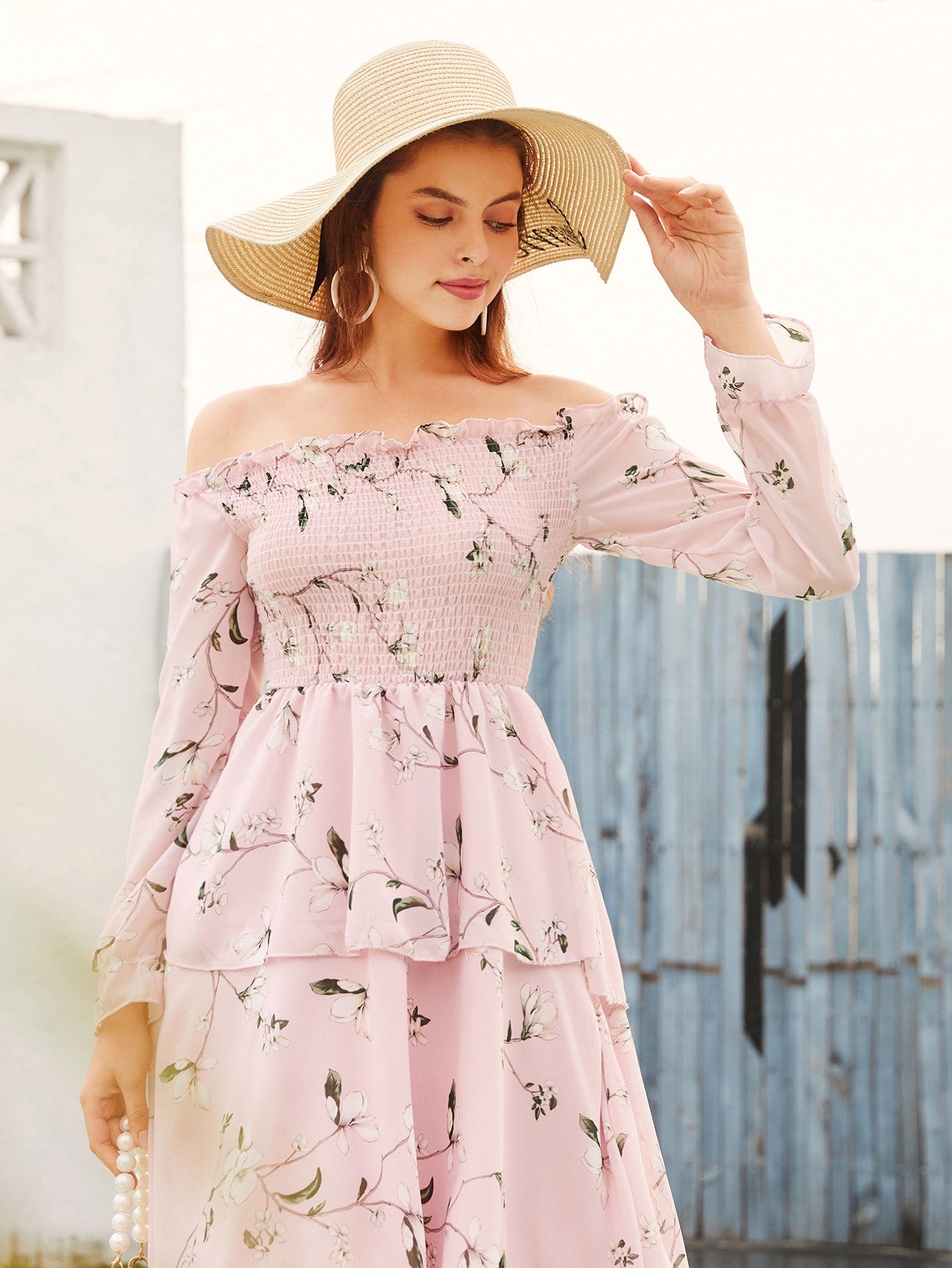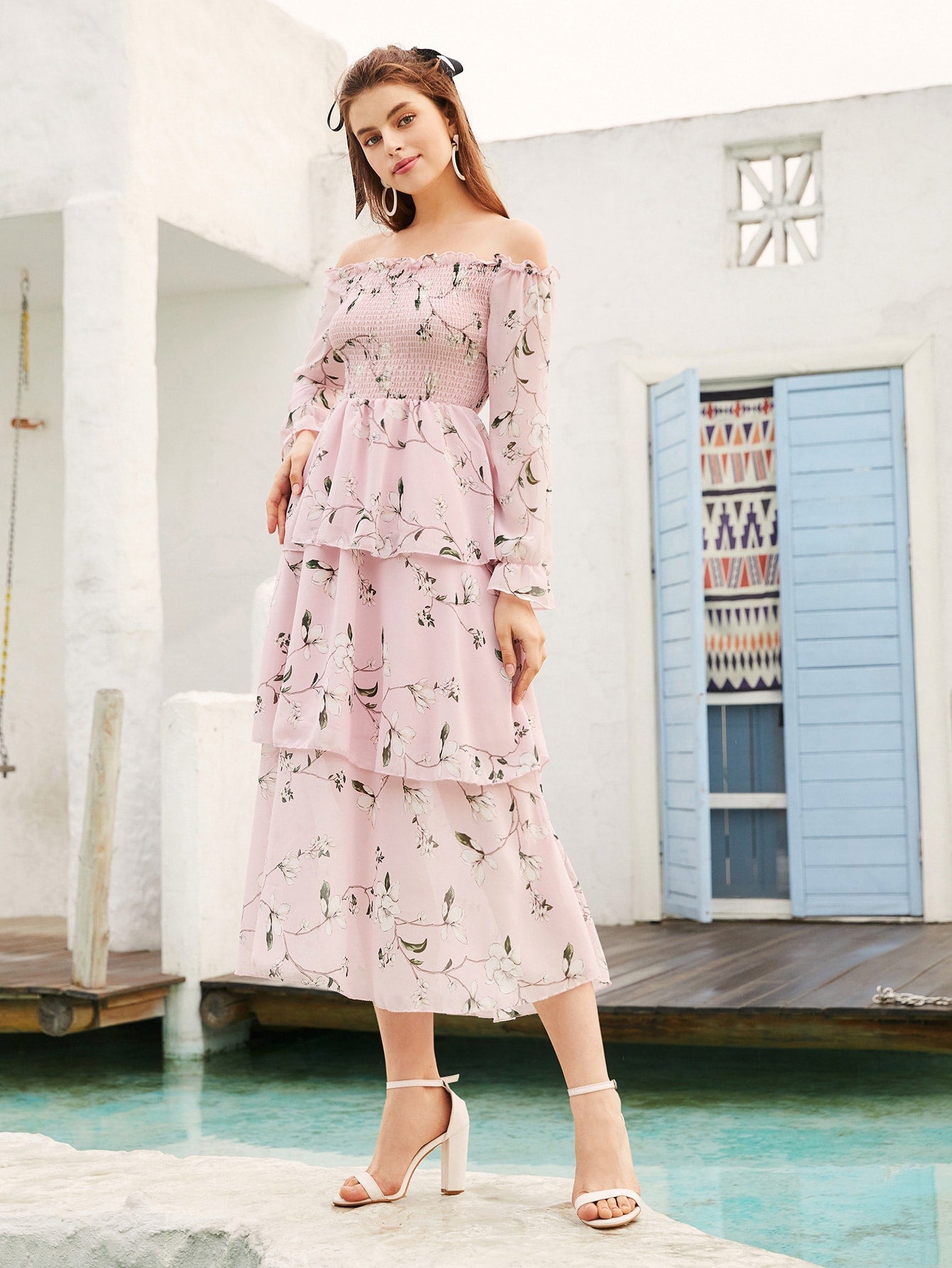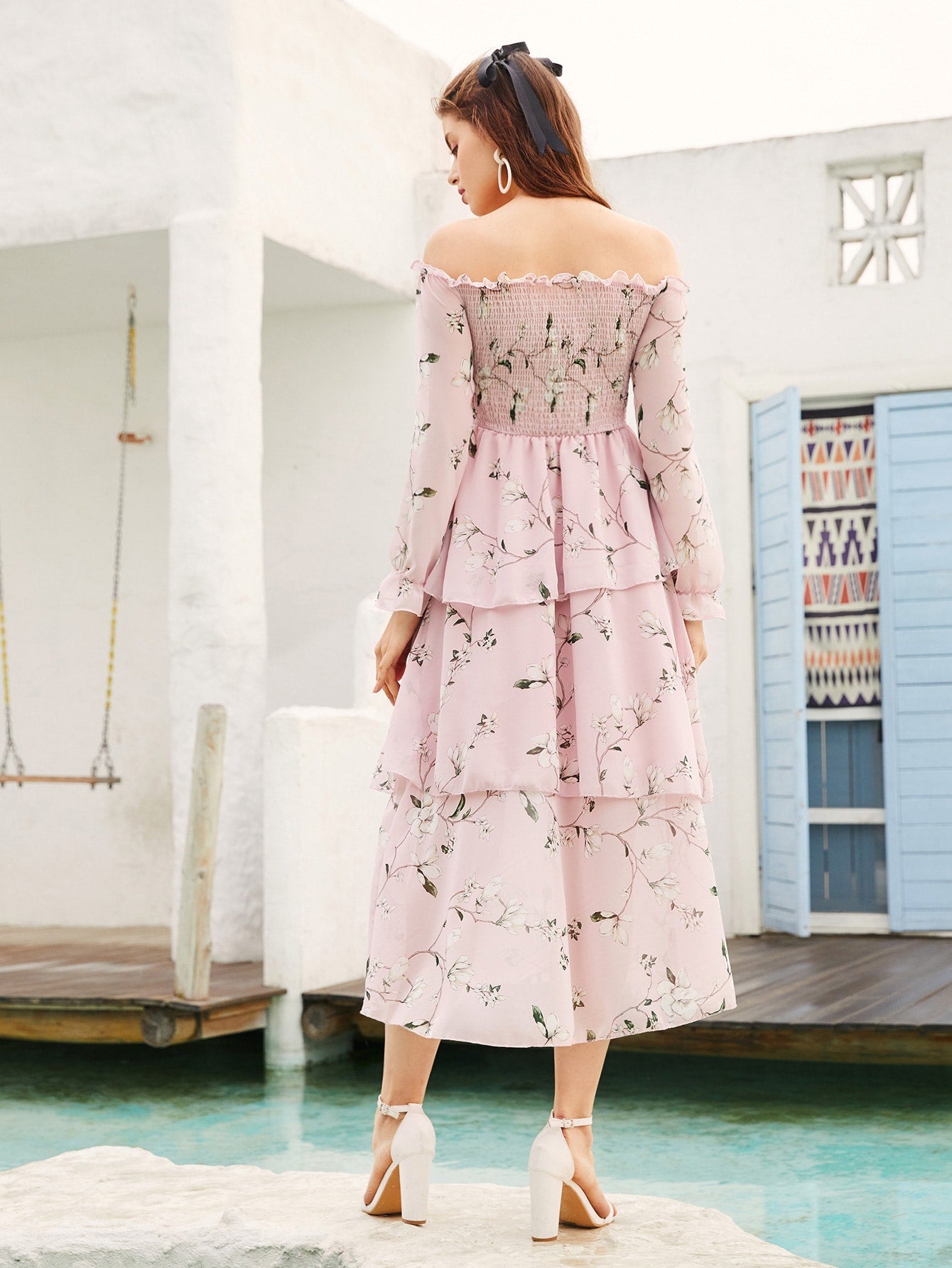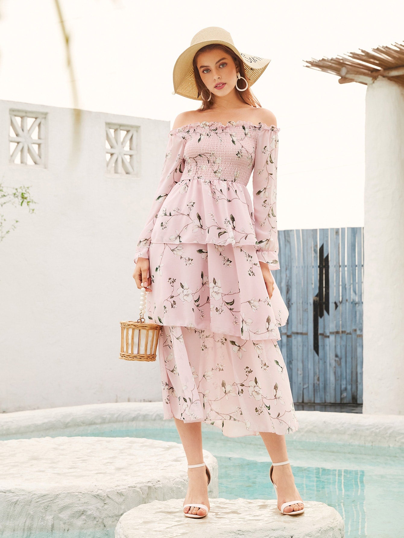 Bardot Shirred Tiered Hem Floral Print A-line Dress