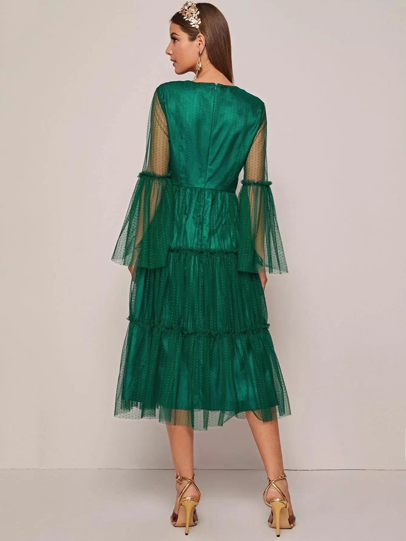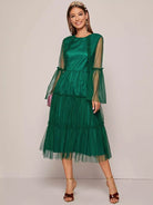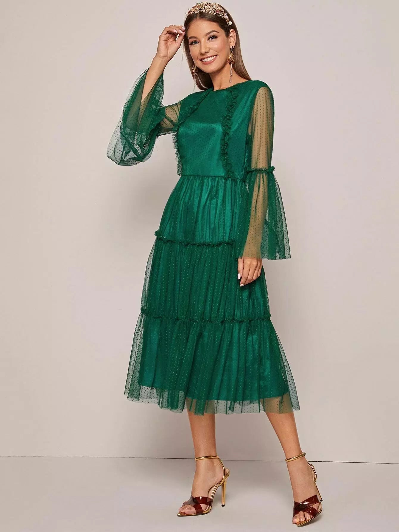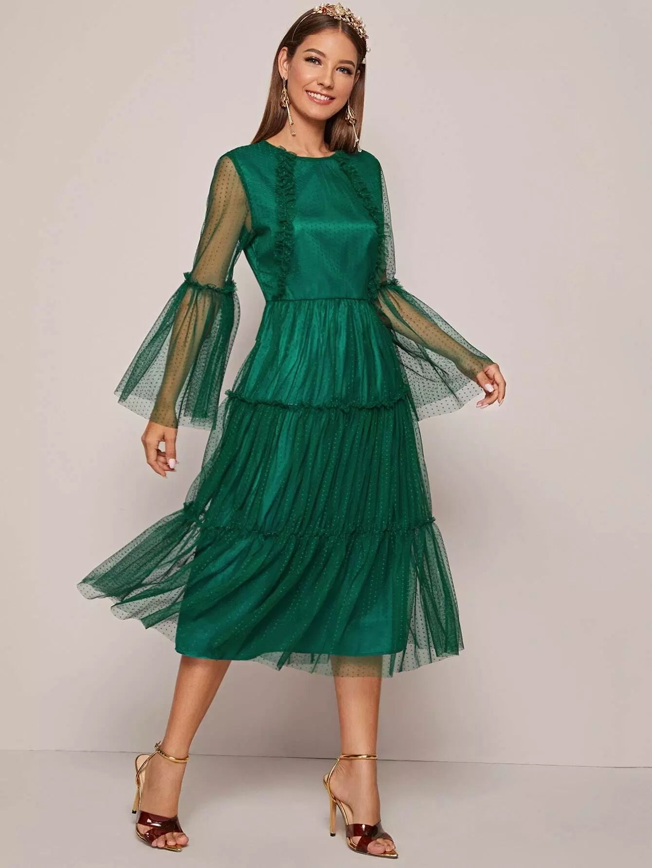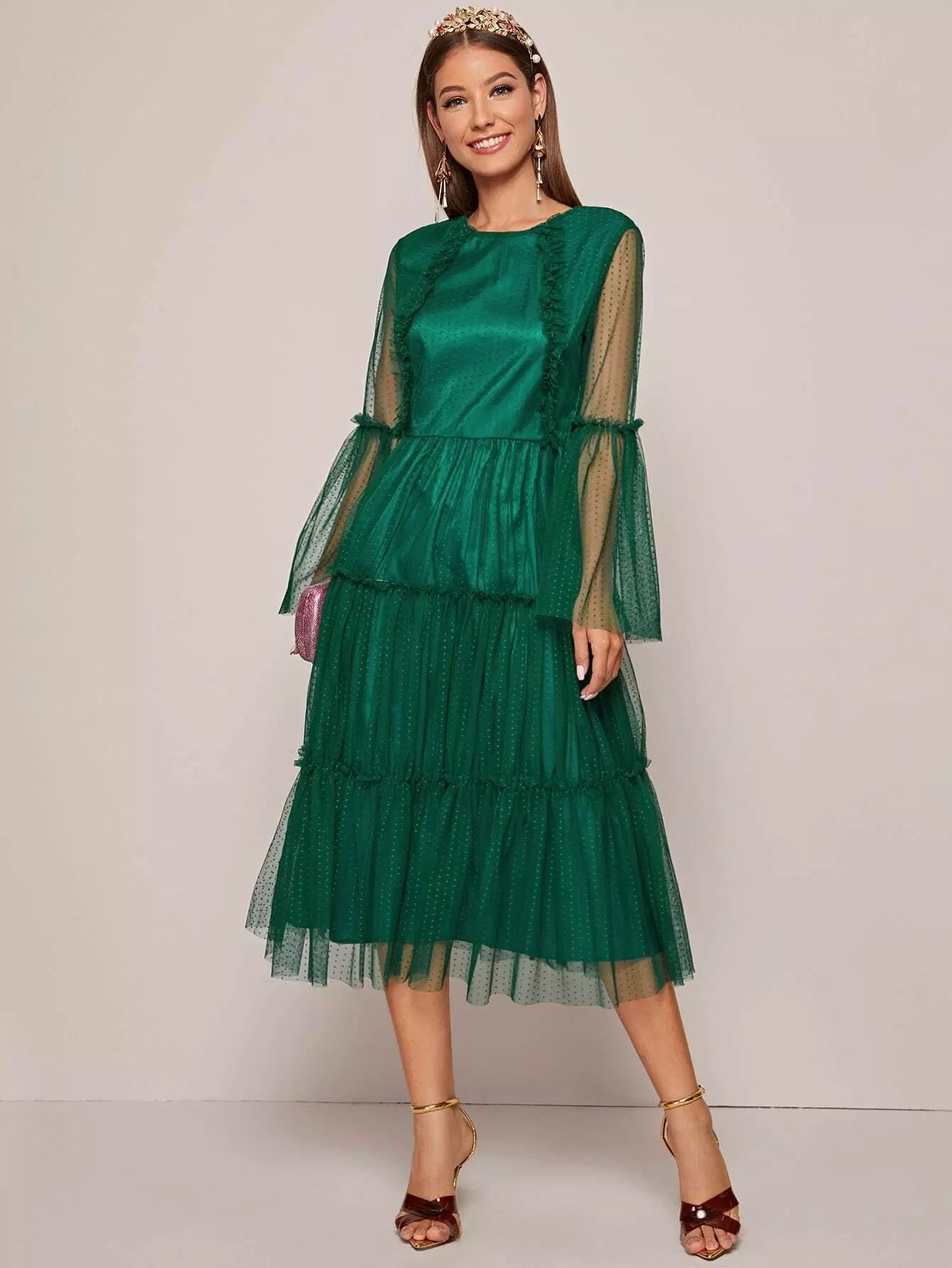 فستان منقط بأكمام جرس وحواف كشكش وطبقة شبكية