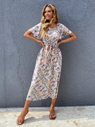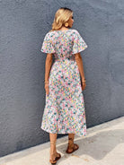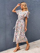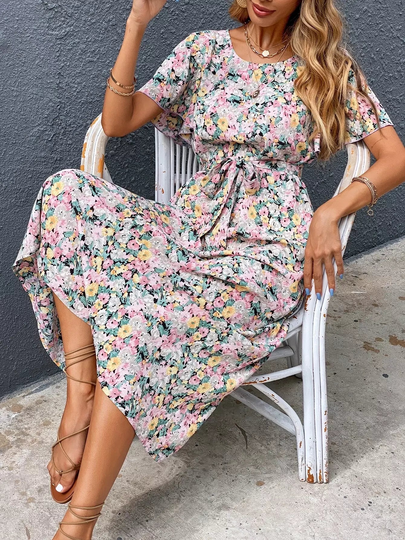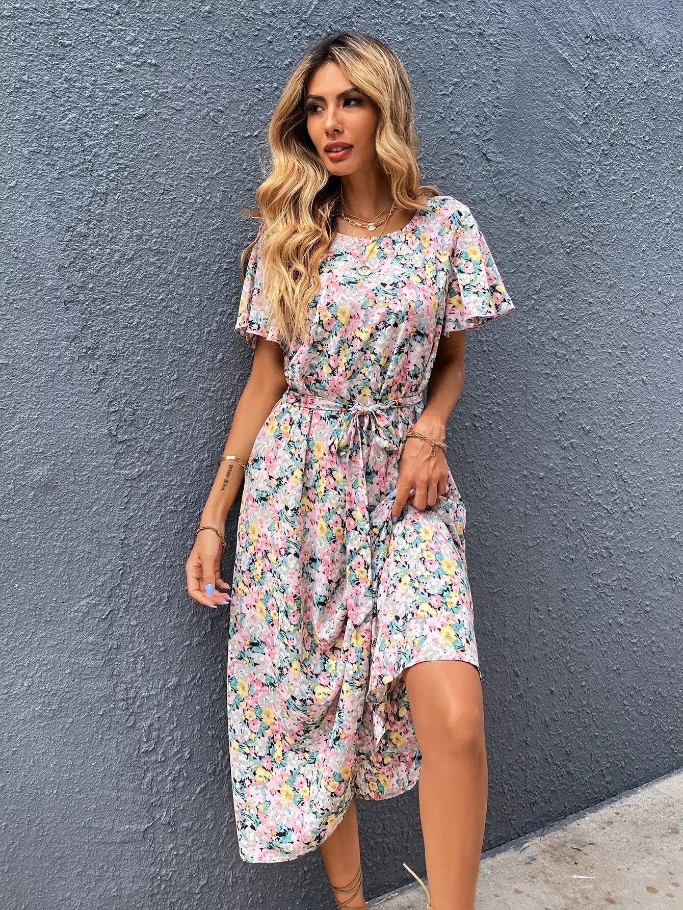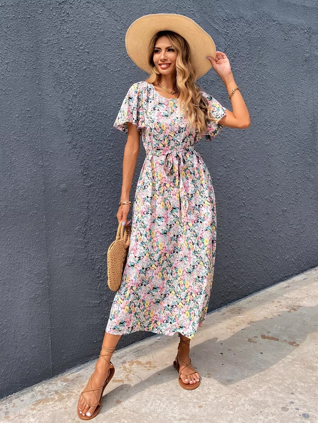 فستان مطبوع بالكامل بأكمام فراشة بدون حزام