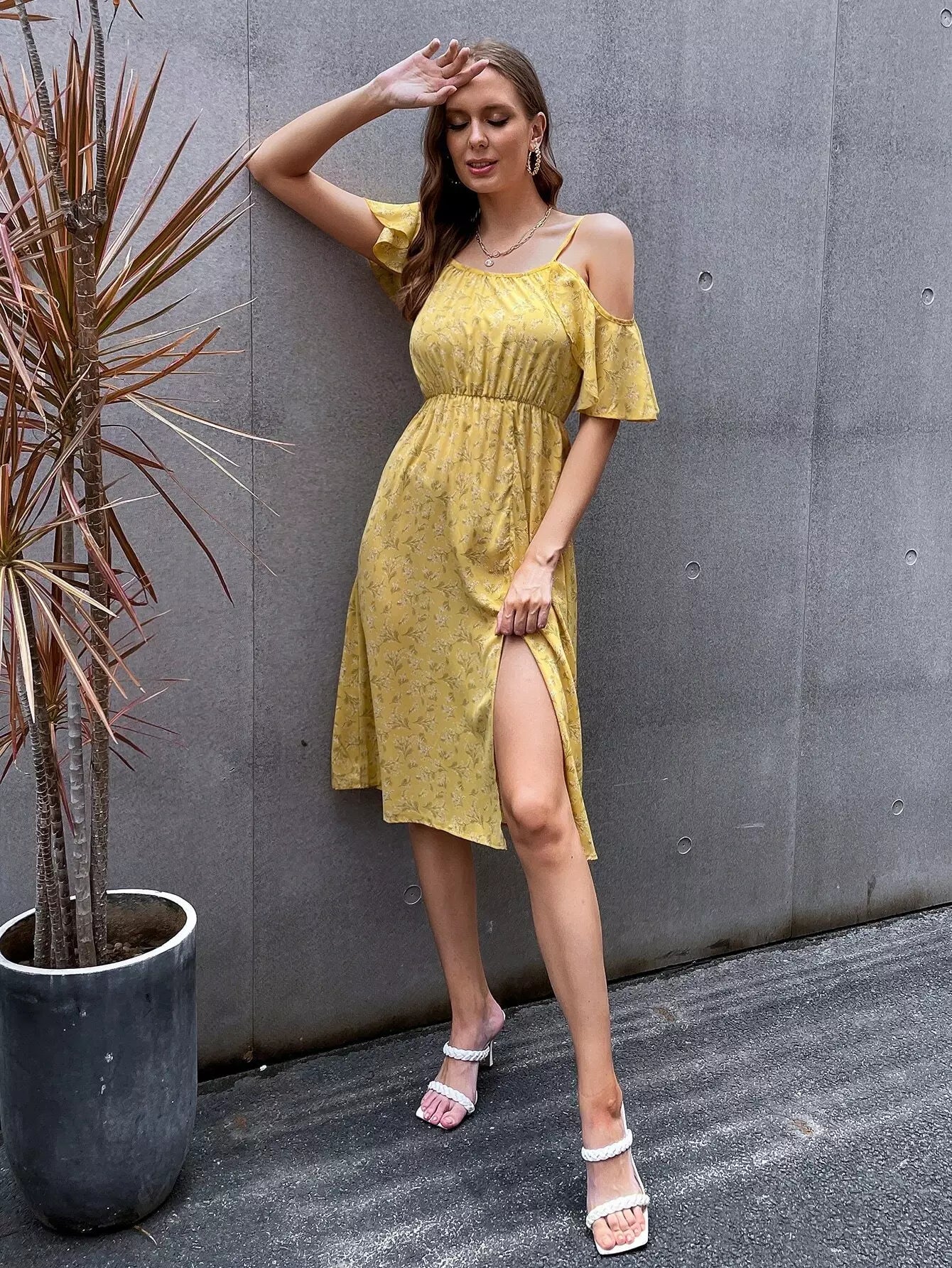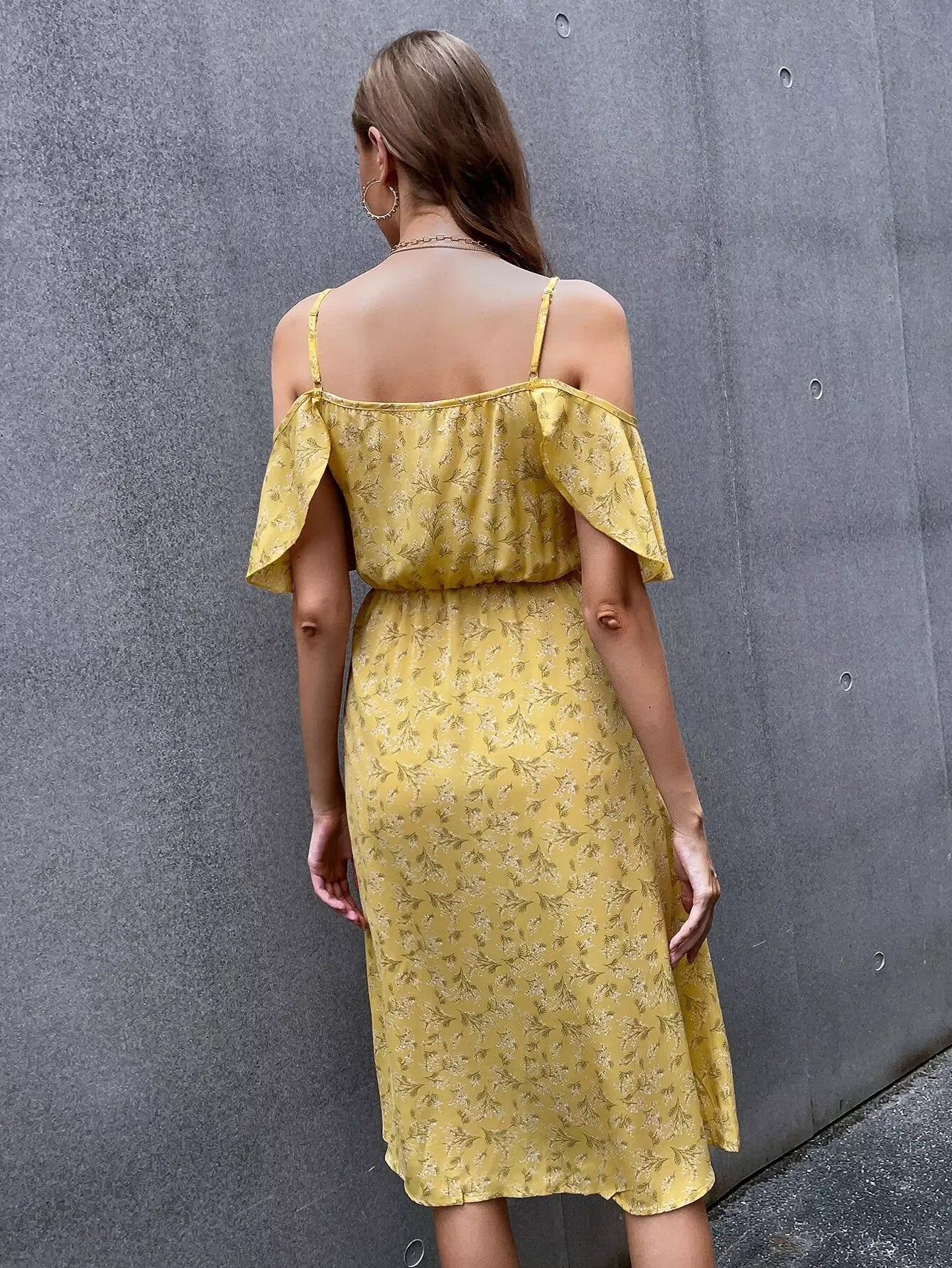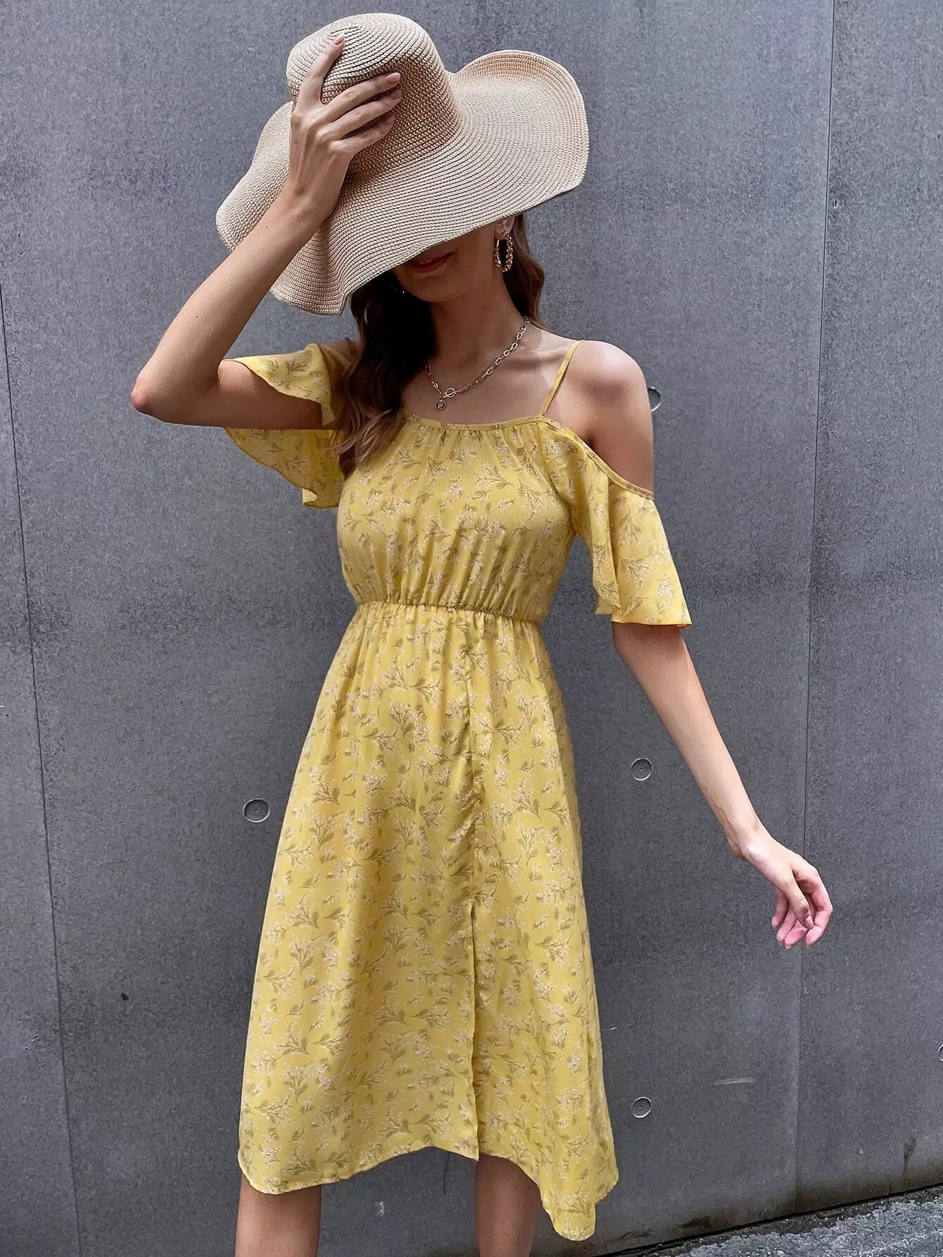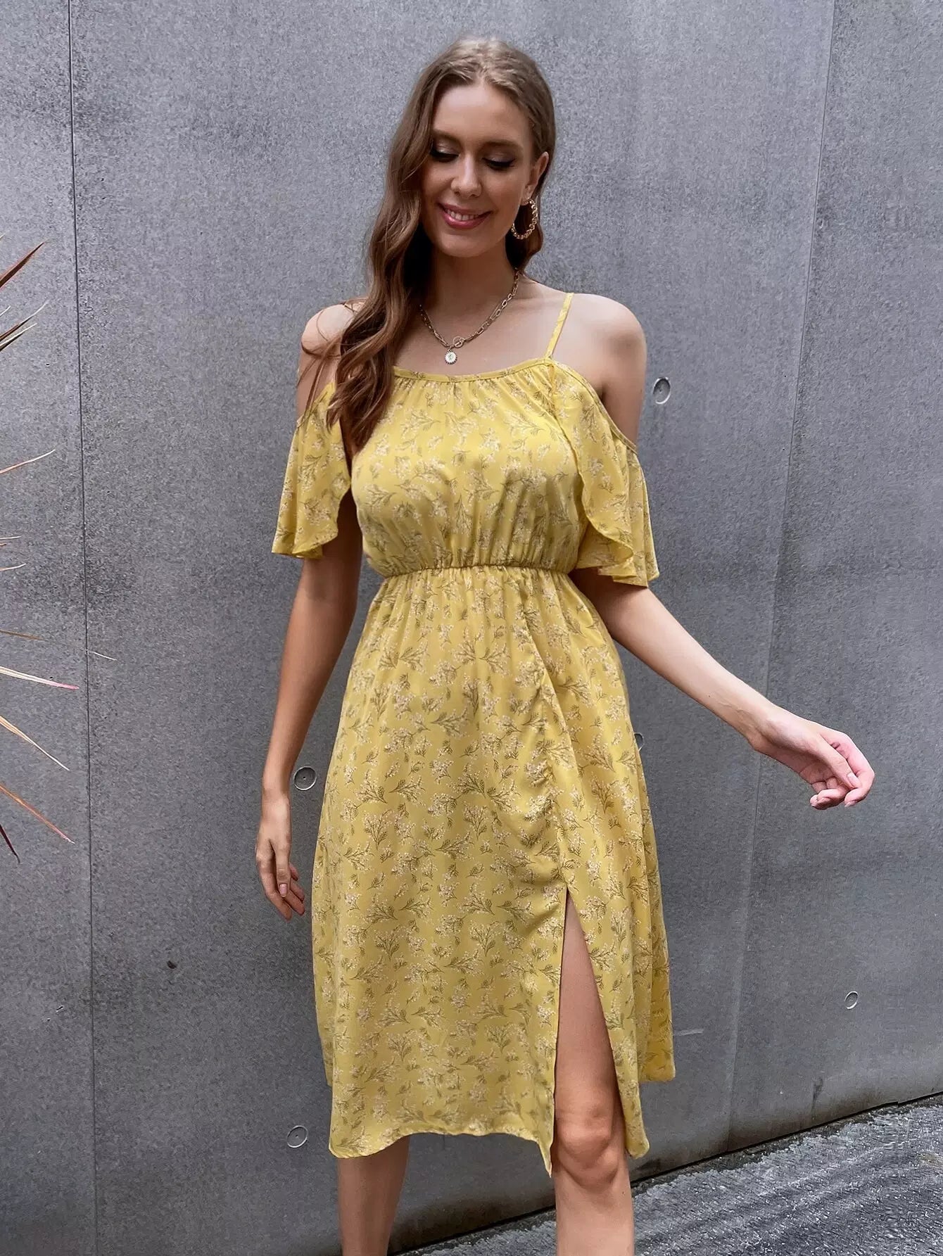 فستان بأكتاف باردة مزين بالورود بالكامل