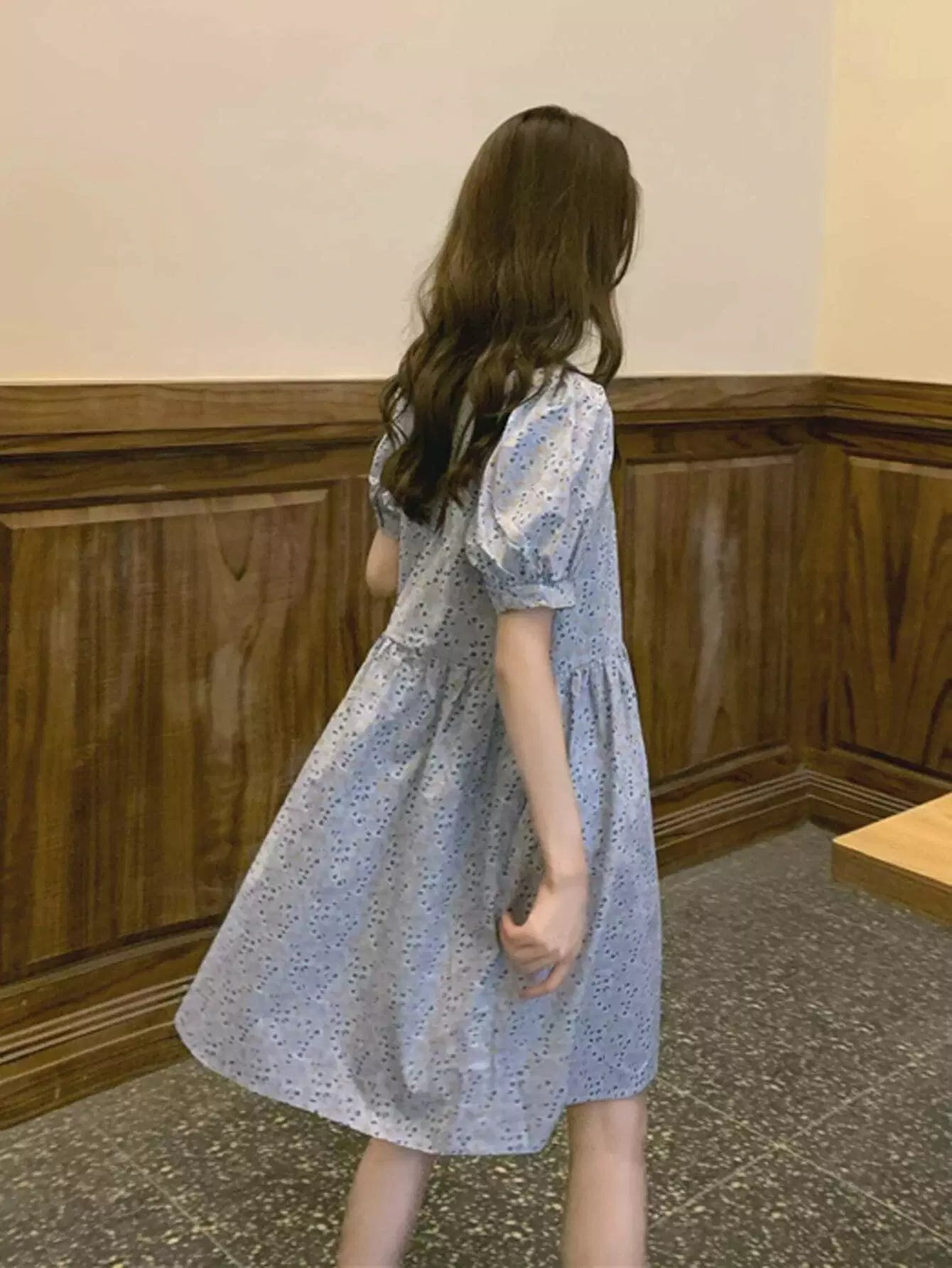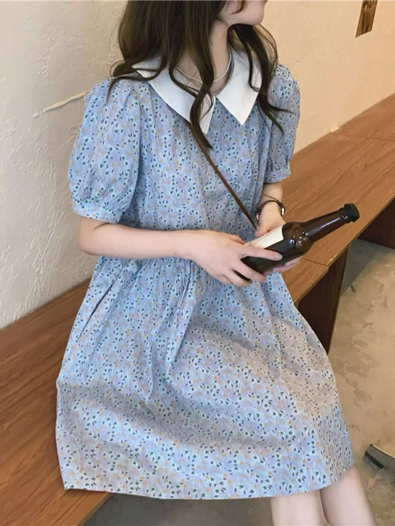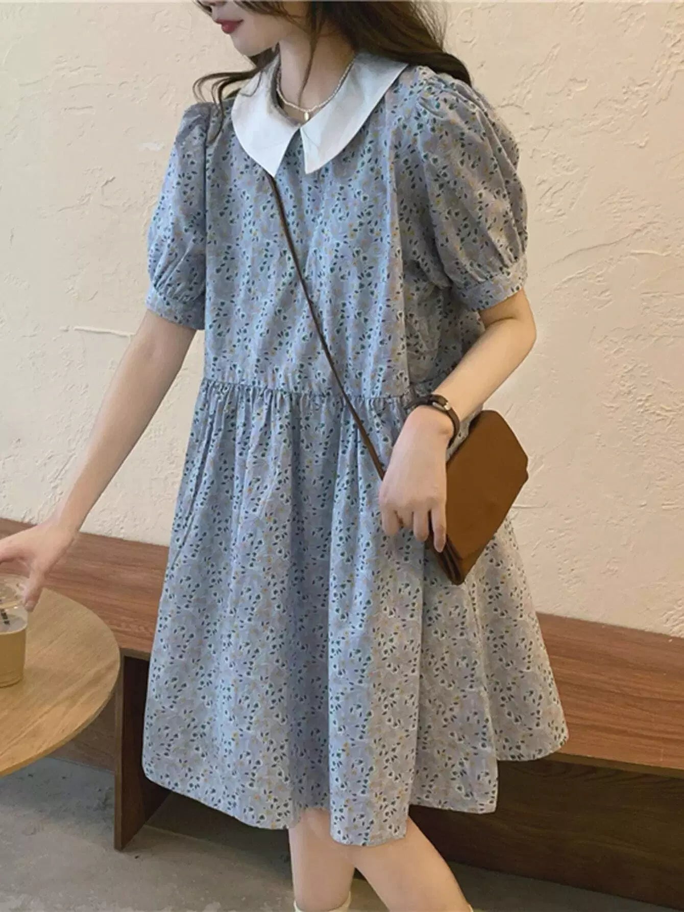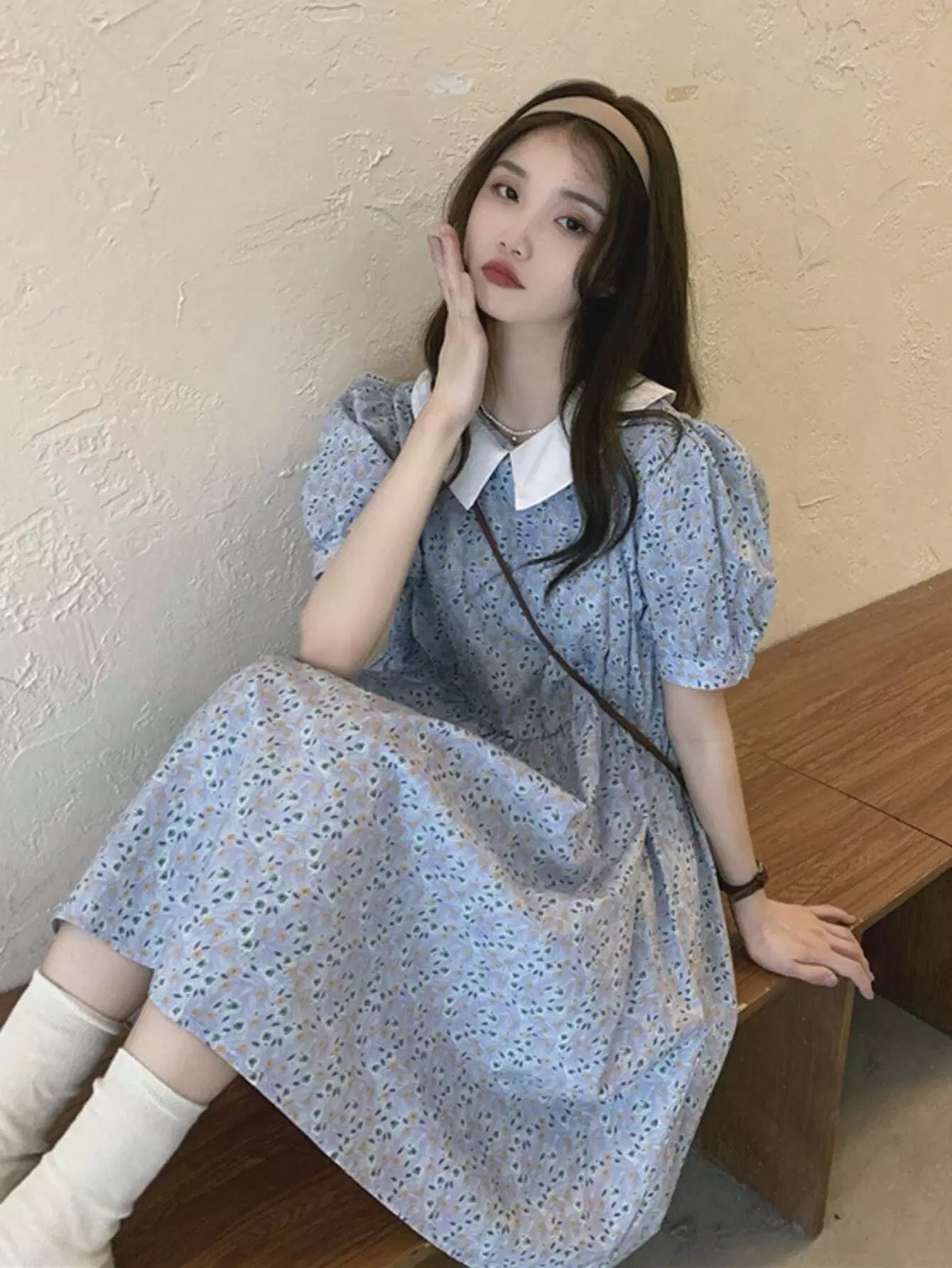 فستان مزخرف بنقشة الزهور الصغيرة مع أكمام منفوخة وياقة متباينة