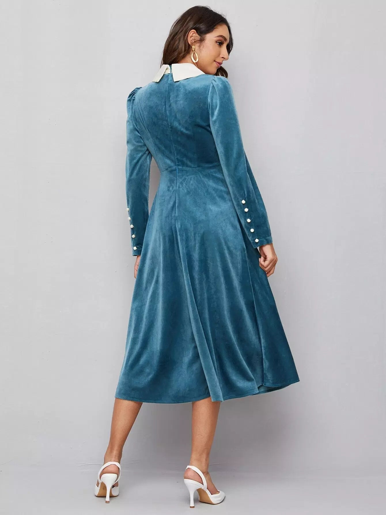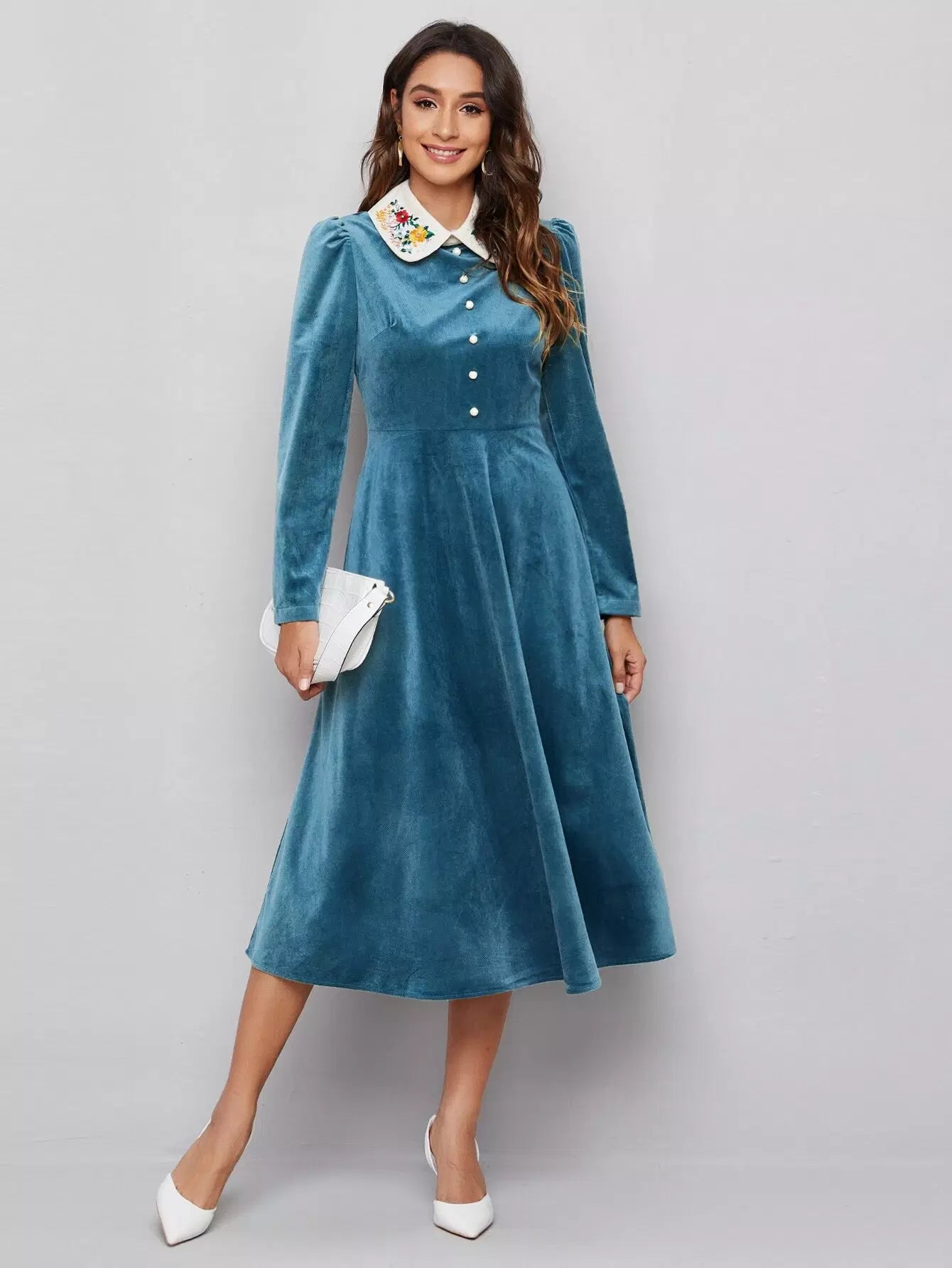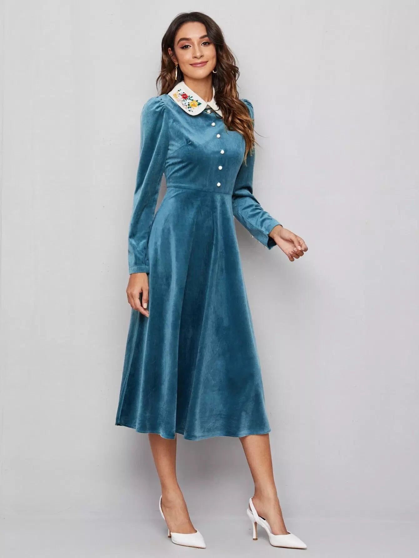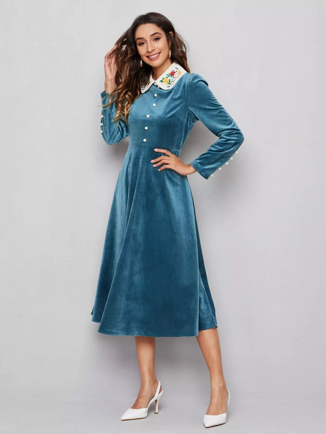فستان مخملي مطرز بتطريزات متباينة بياقة زهرية ولؤلؤ وخرز