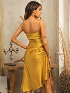 فستان كامي من الساتان بفتحة رقبة واسعة وعقدة مكشكشة وحافة غير متماثلة