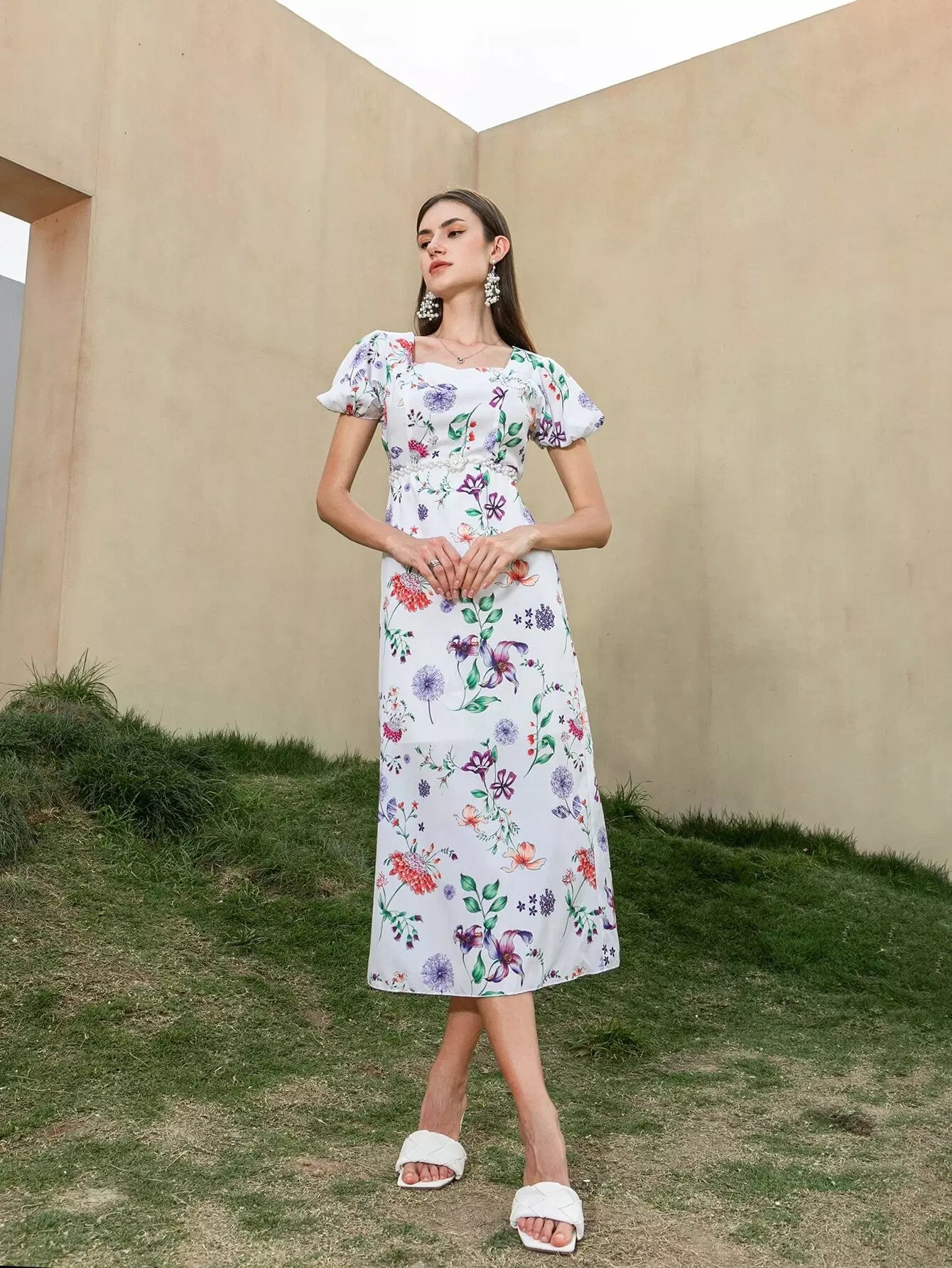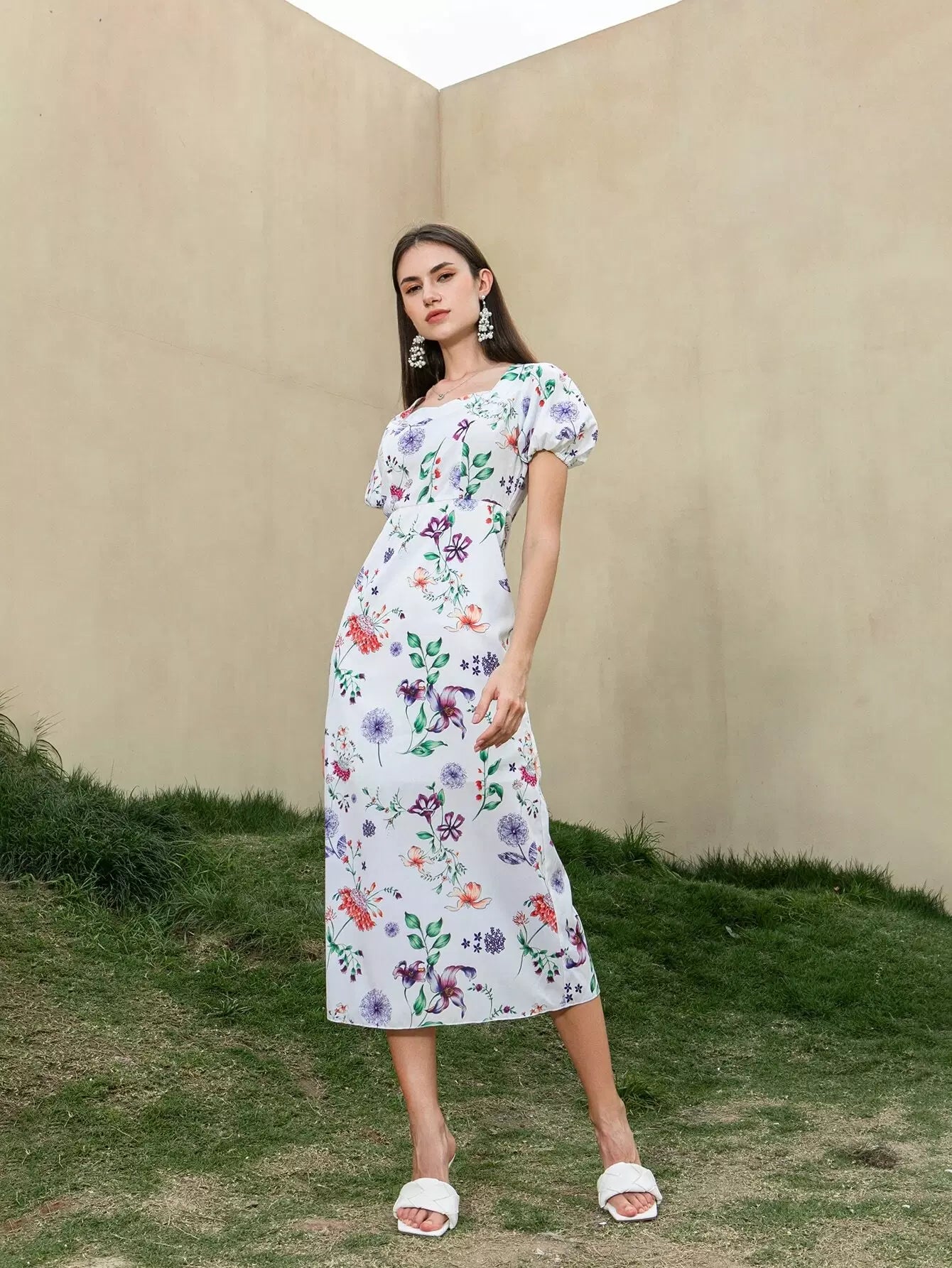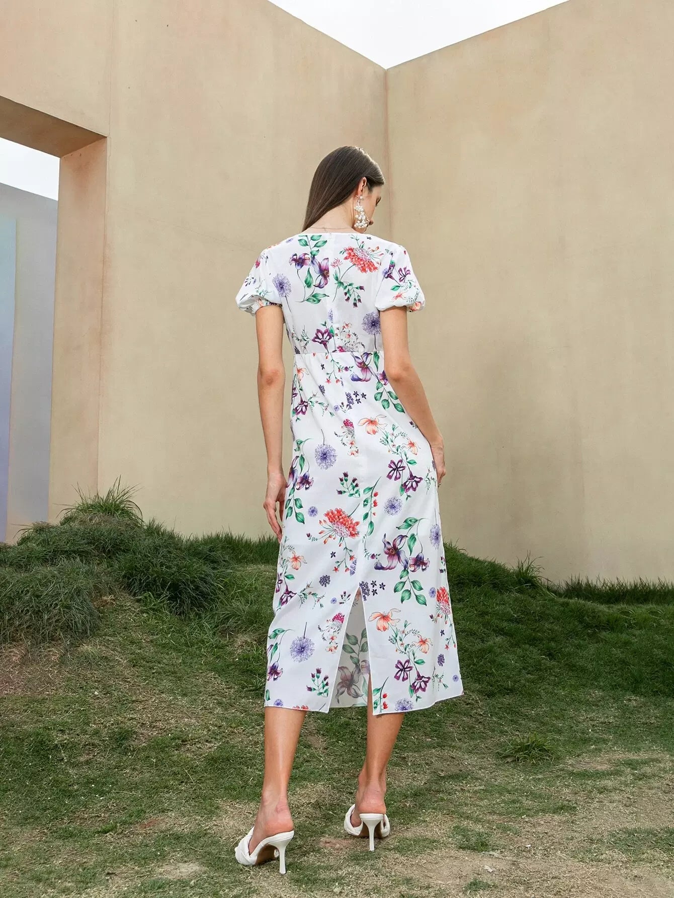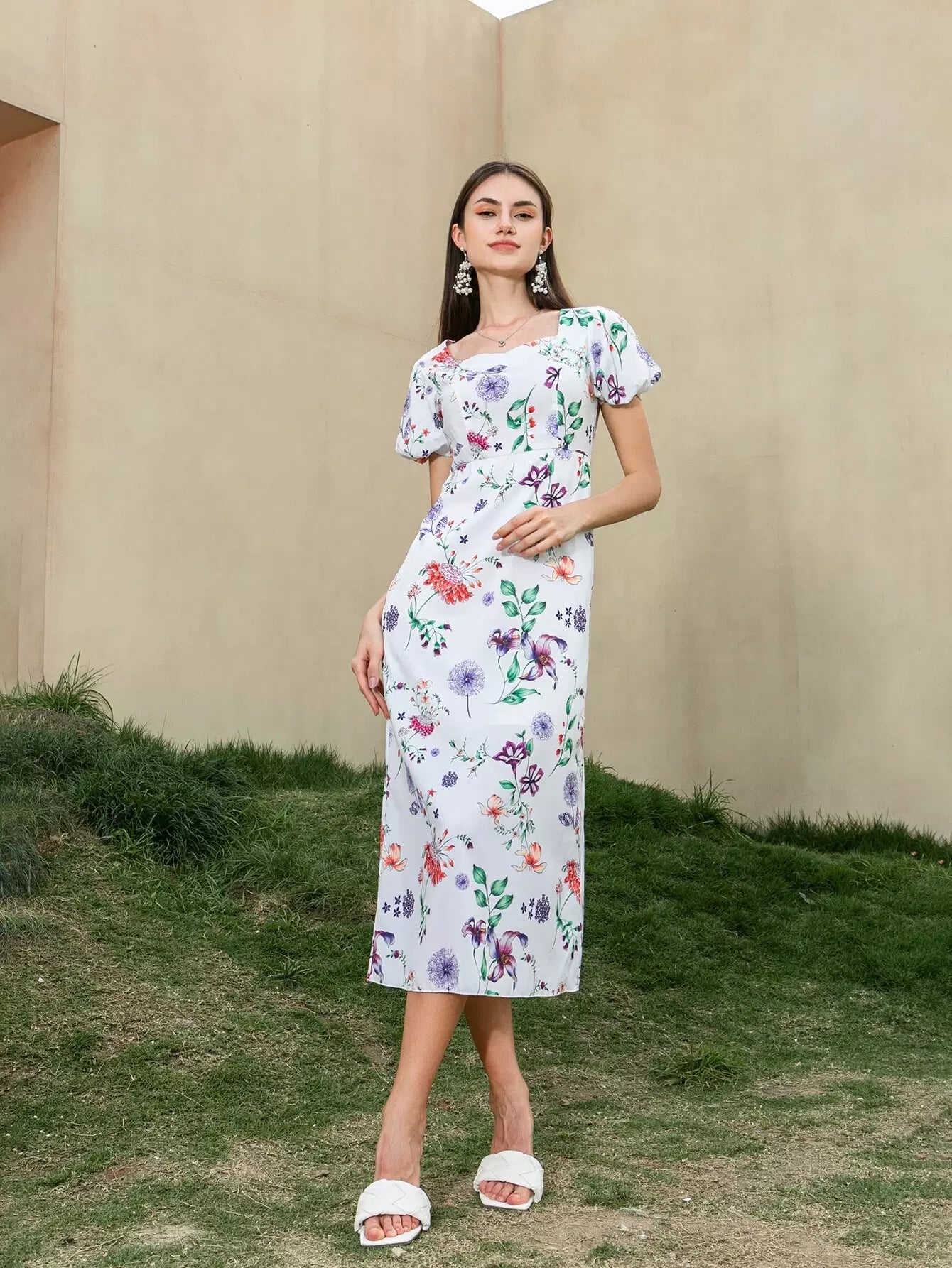 فستان بأكمام منتفخة وطباعة زهور الهندباء بدون حزام