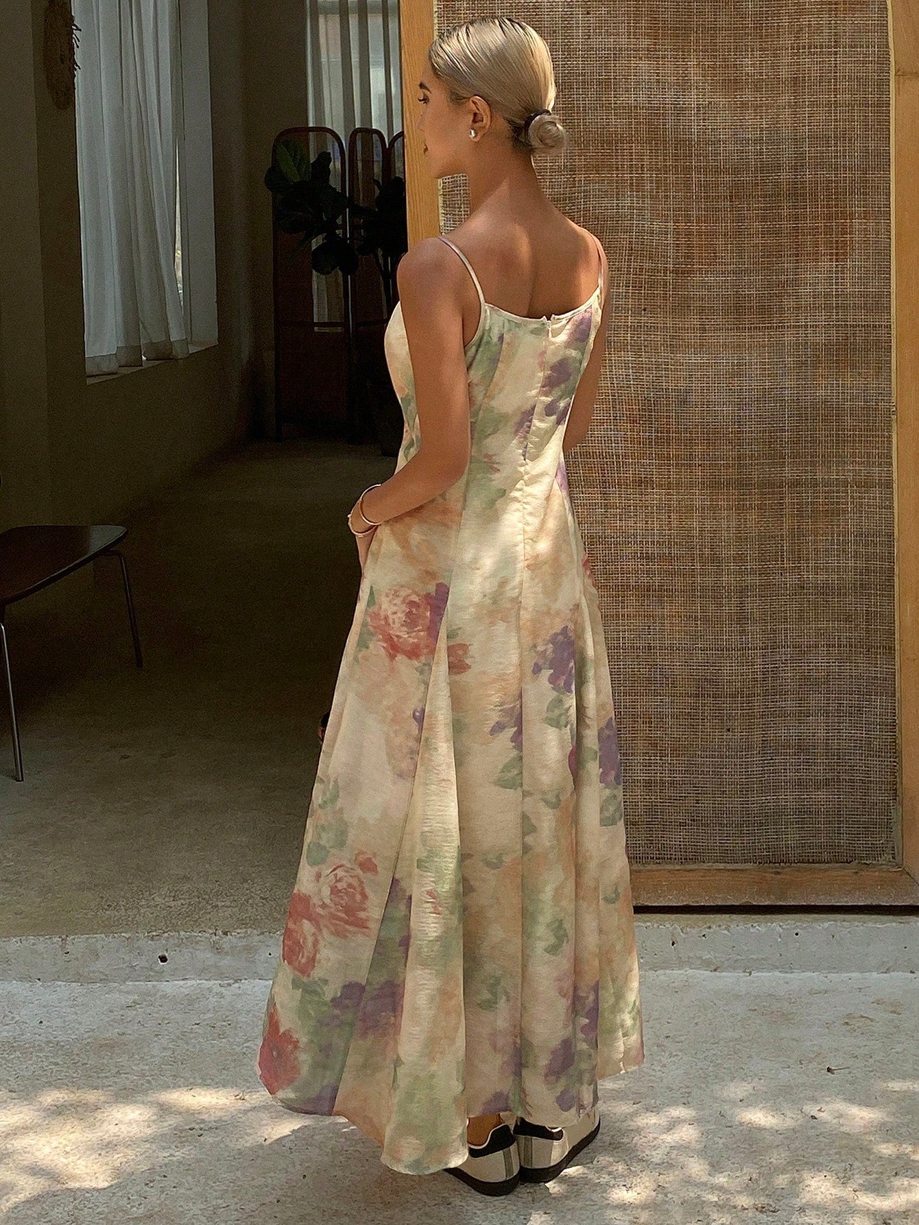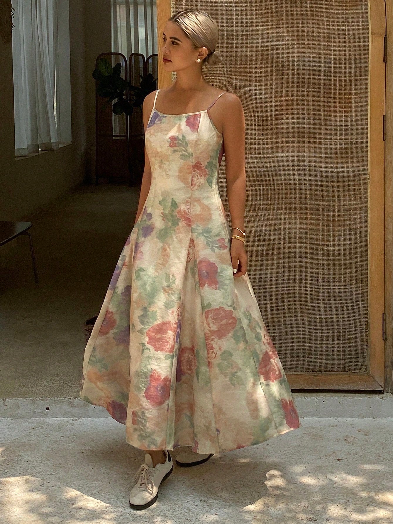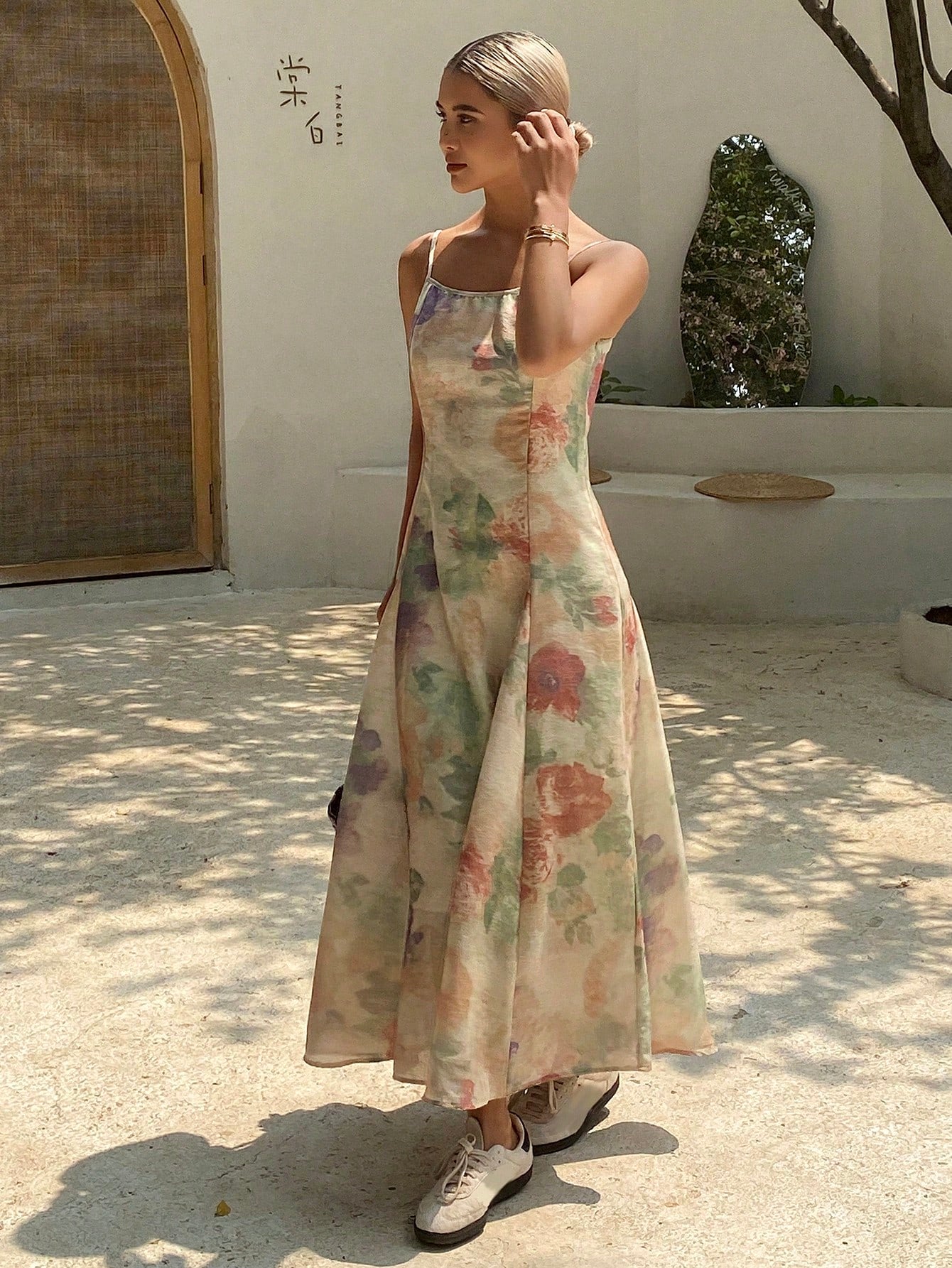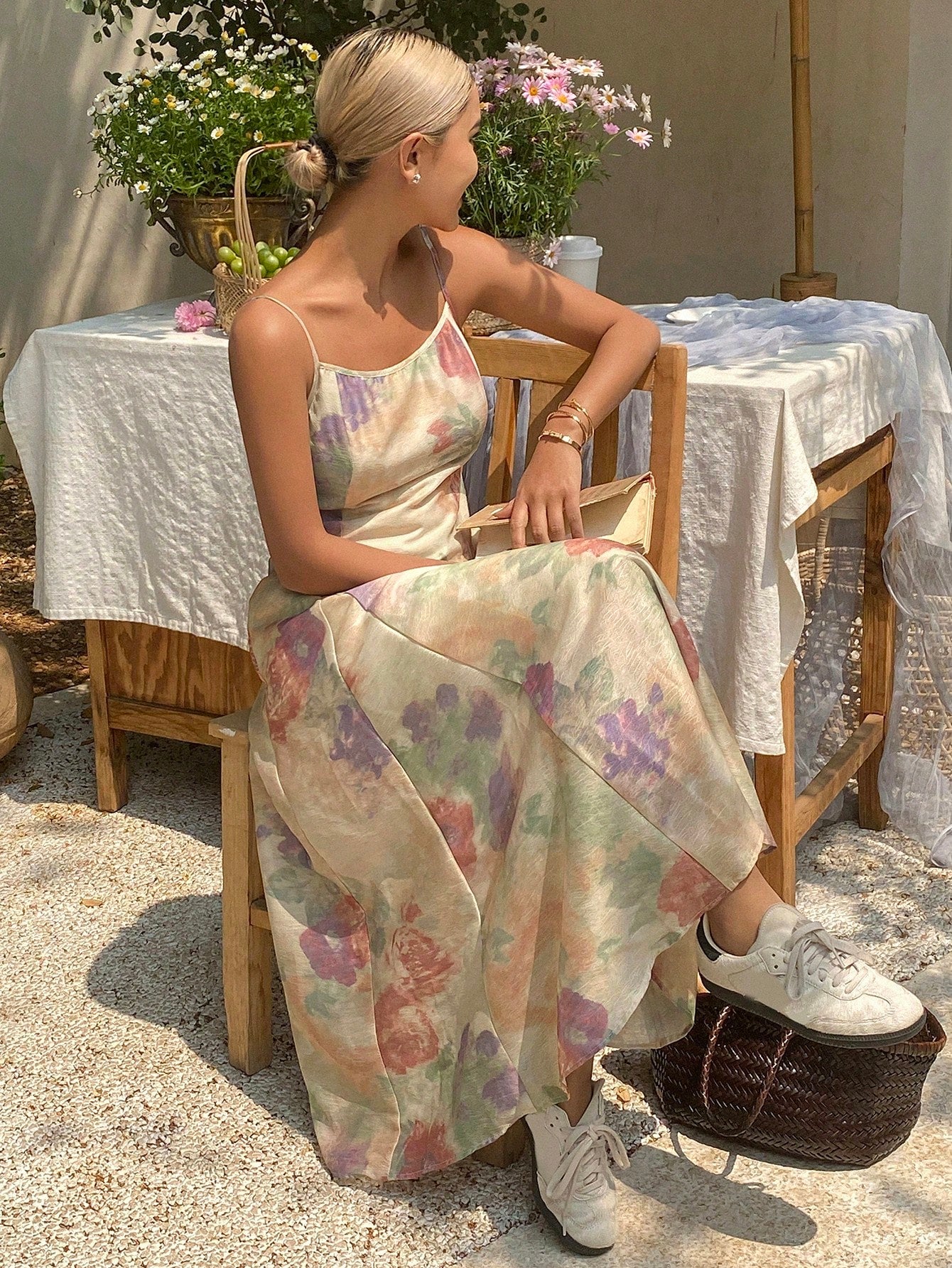 فستان DAZY نسائي متوسط الطول بطبعة كاملة وحمالات رفيعة