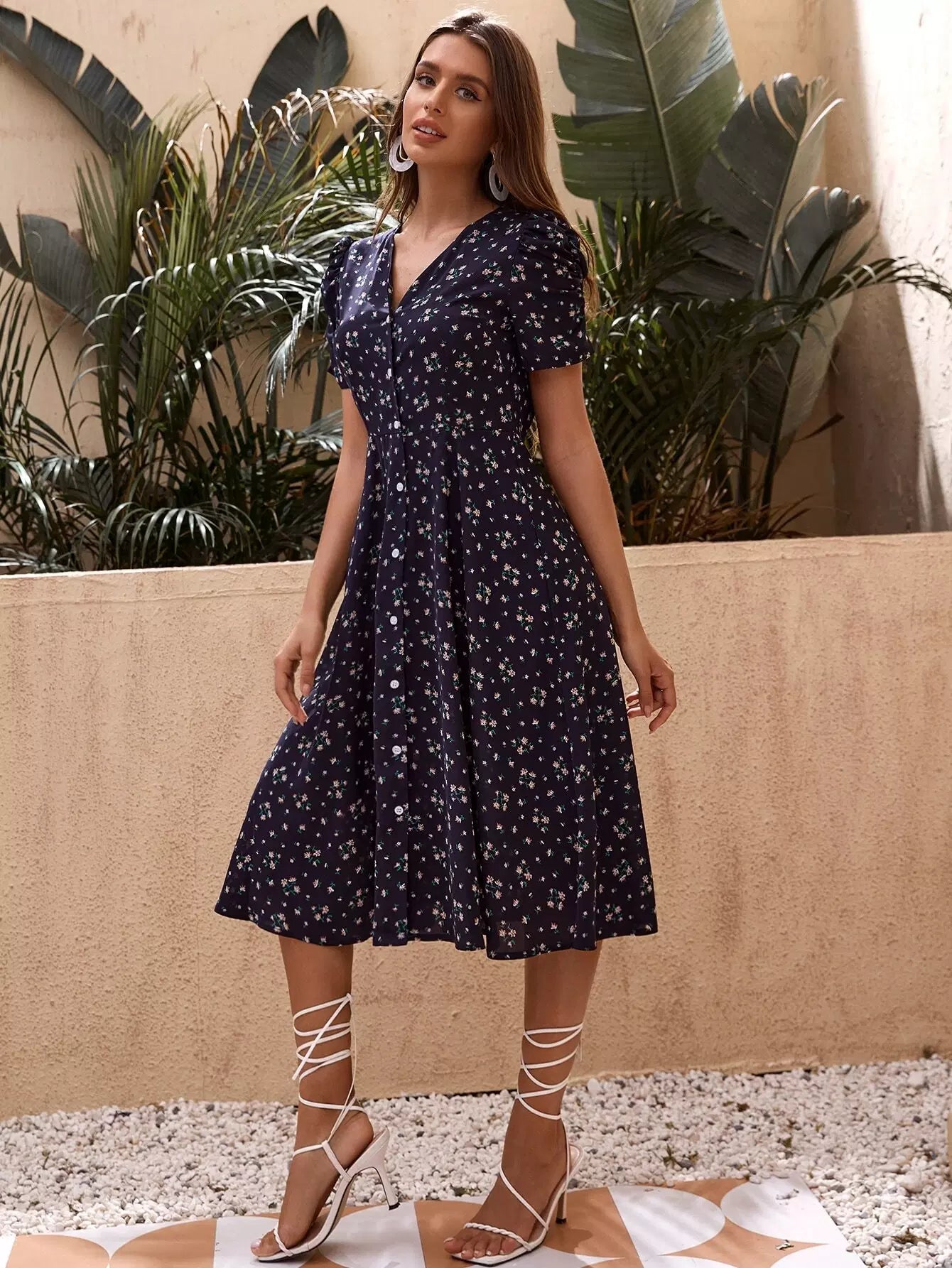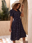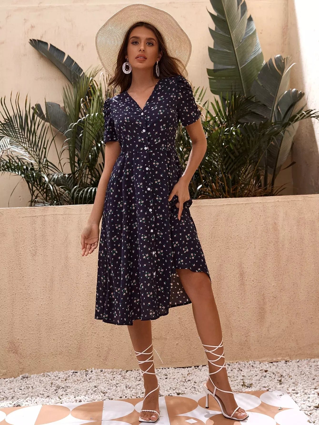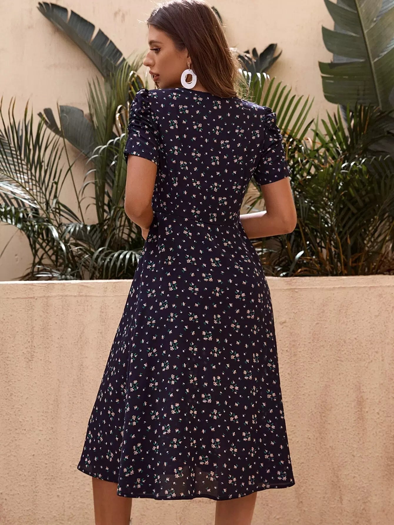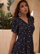 فستان بأكمام منفوشة بطبعة زهور بأكمام منفوشة على شكل حرف A